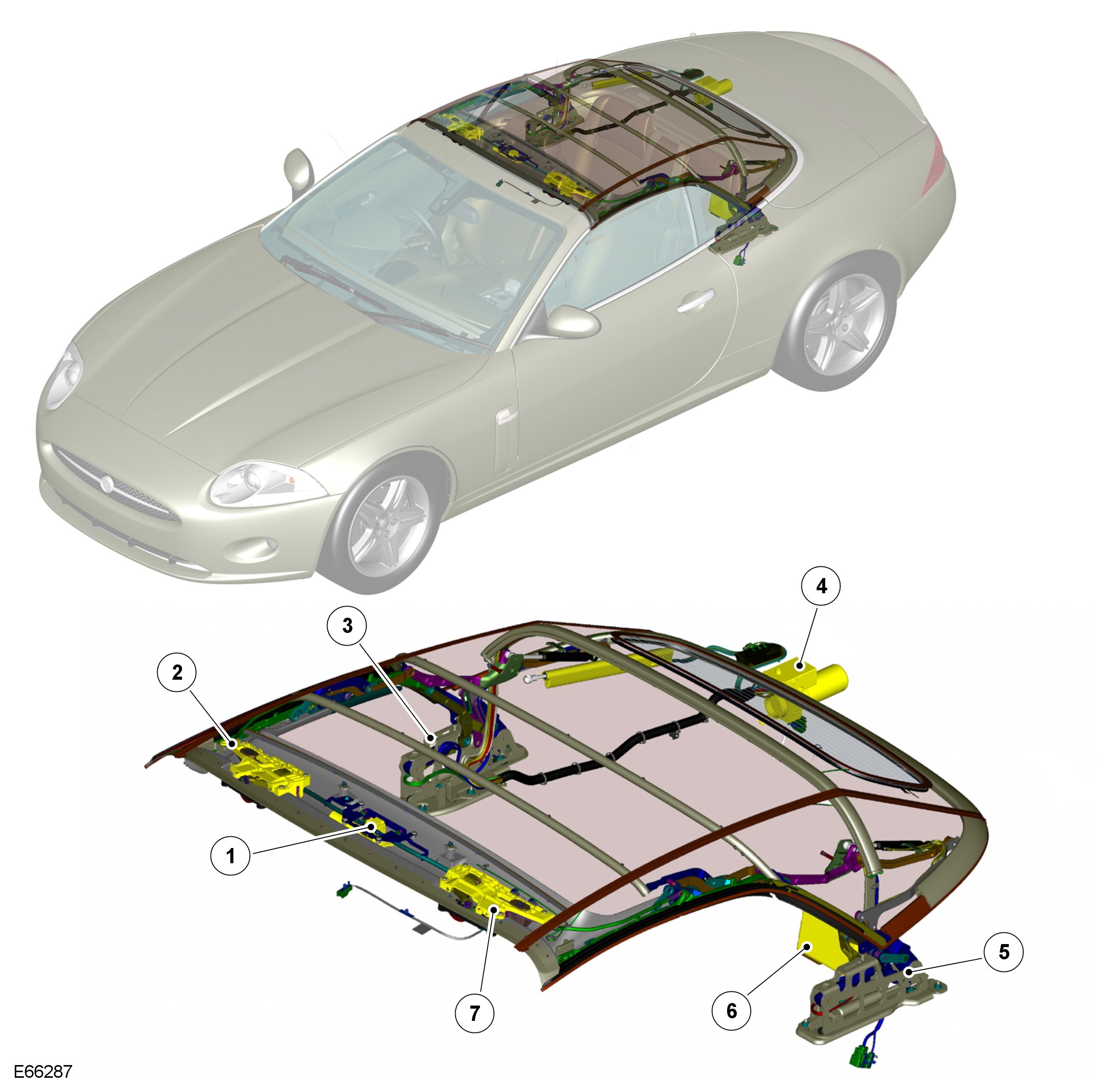 The convertible top incorporates a fully automatic latch and unlatch tension rod system, which uses an electric motor with a gearbox and flexible shafts to latch and unlatch the top. Failure of a tension rod, motor gearbox or latch motor will prevent the top from unlatching. In the event of either of these failures it is possible to release each of the top latches manually.