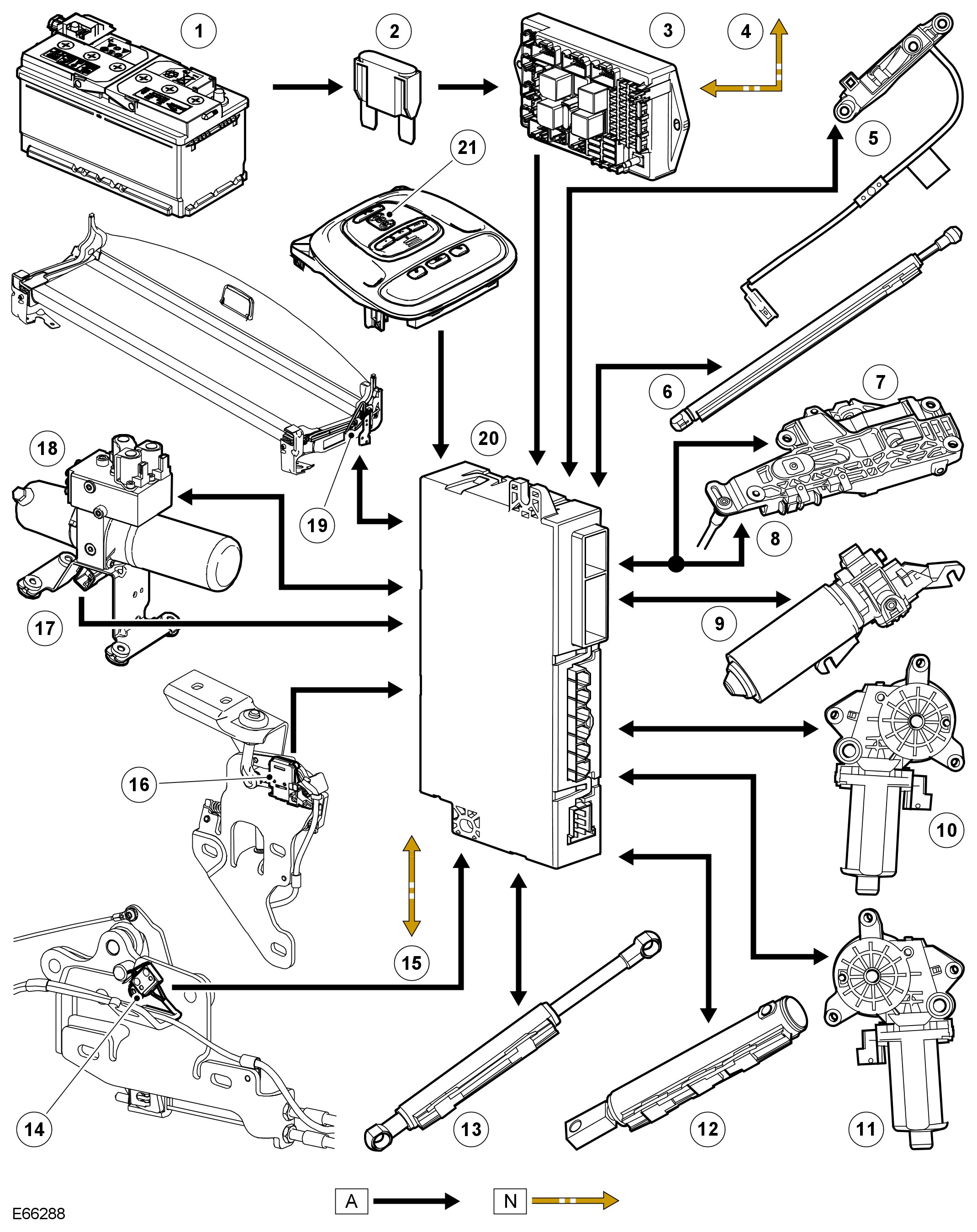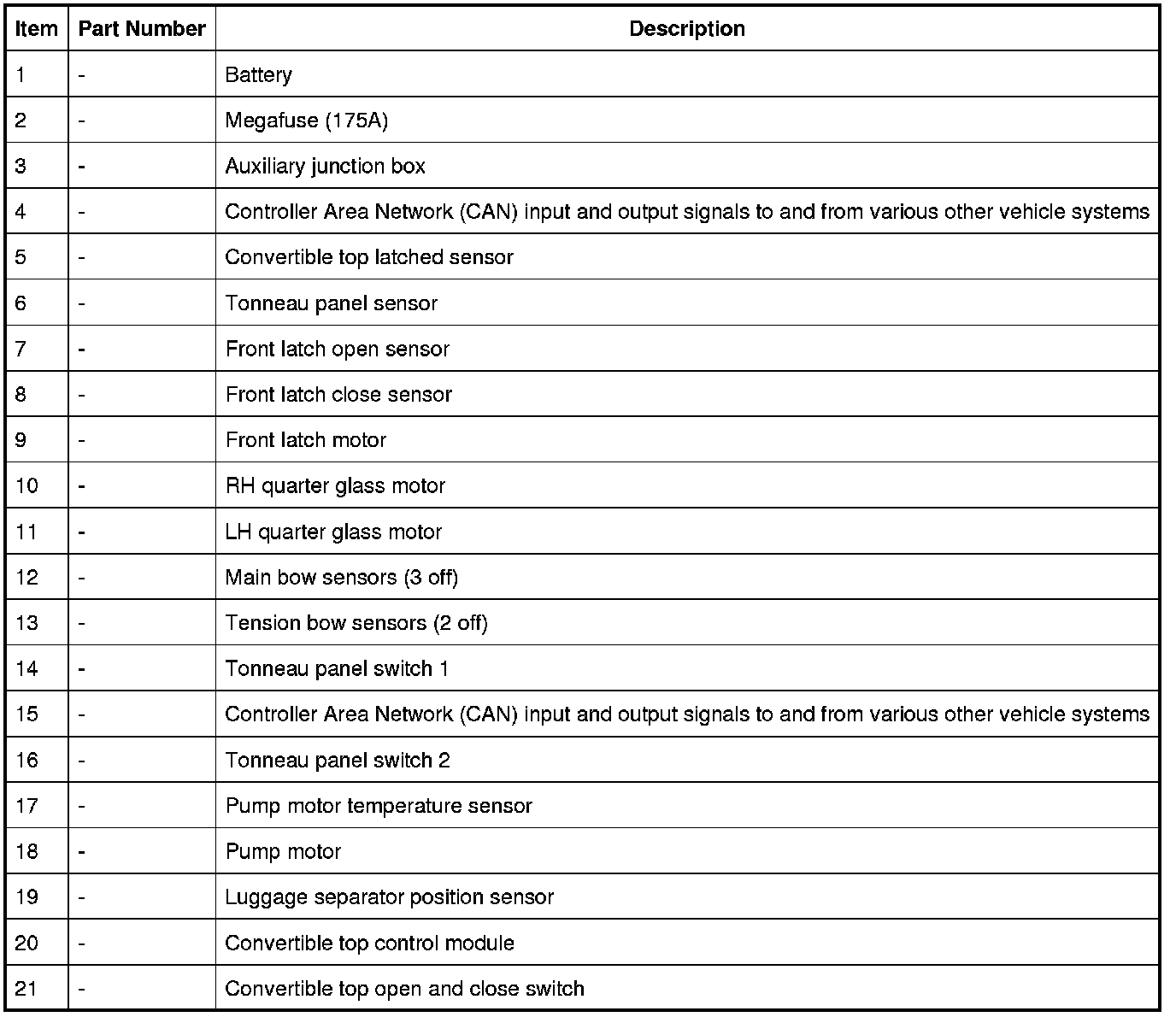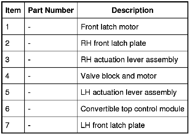 A control module, located behind the LH rear seat, controls the power-operated convertible top. The control module operates the top based on data received on the Controller Area Network (CAN) bus and from the hardwired components described below: