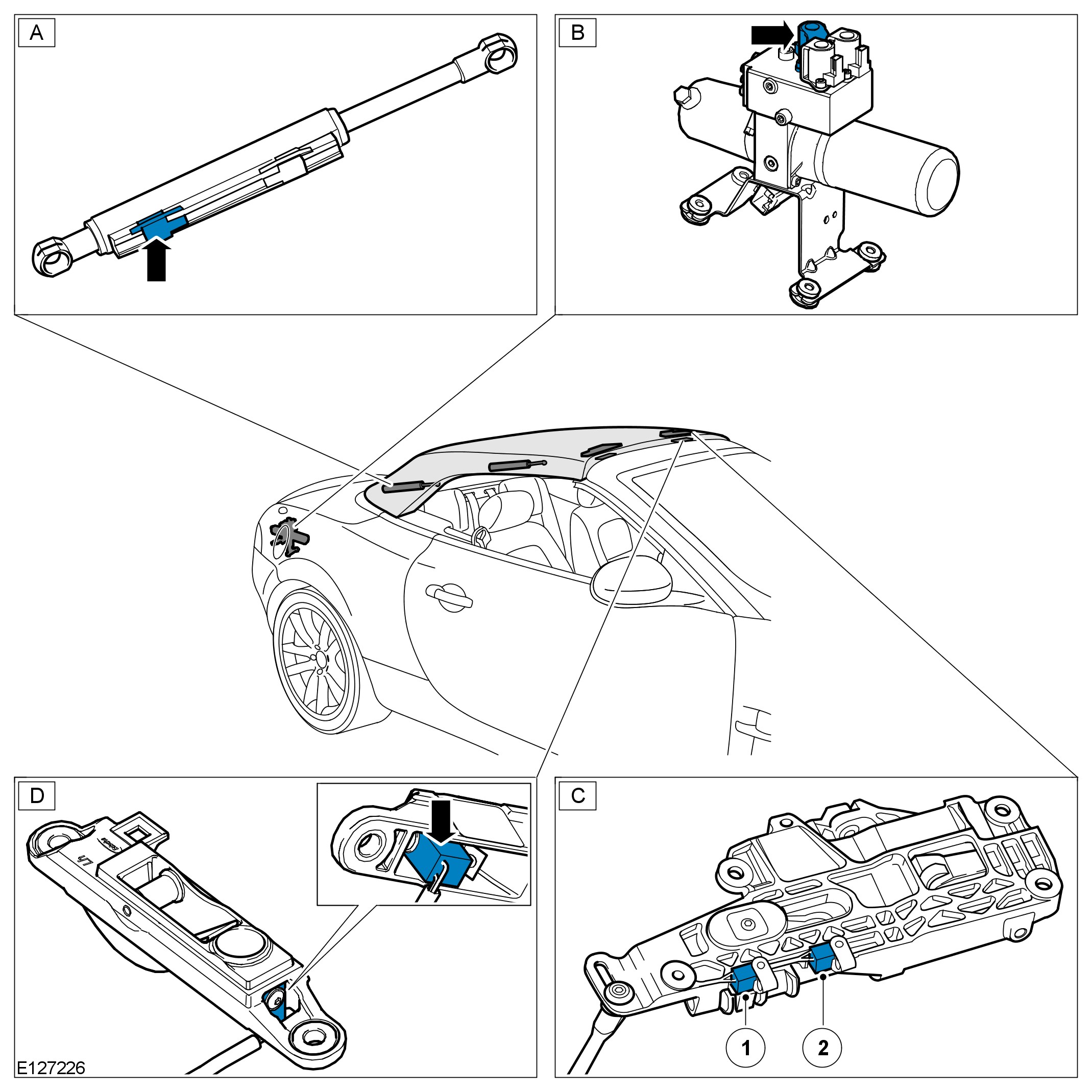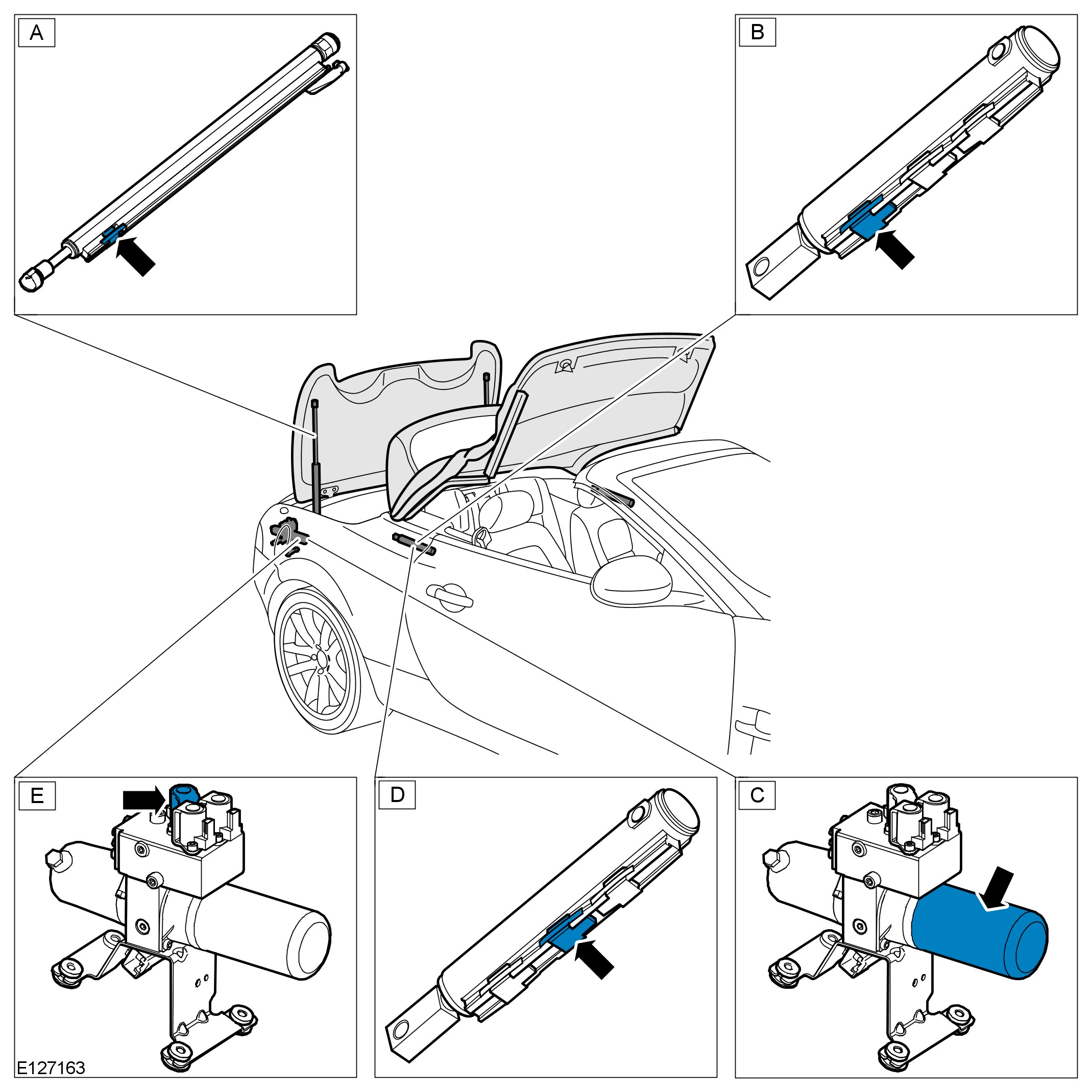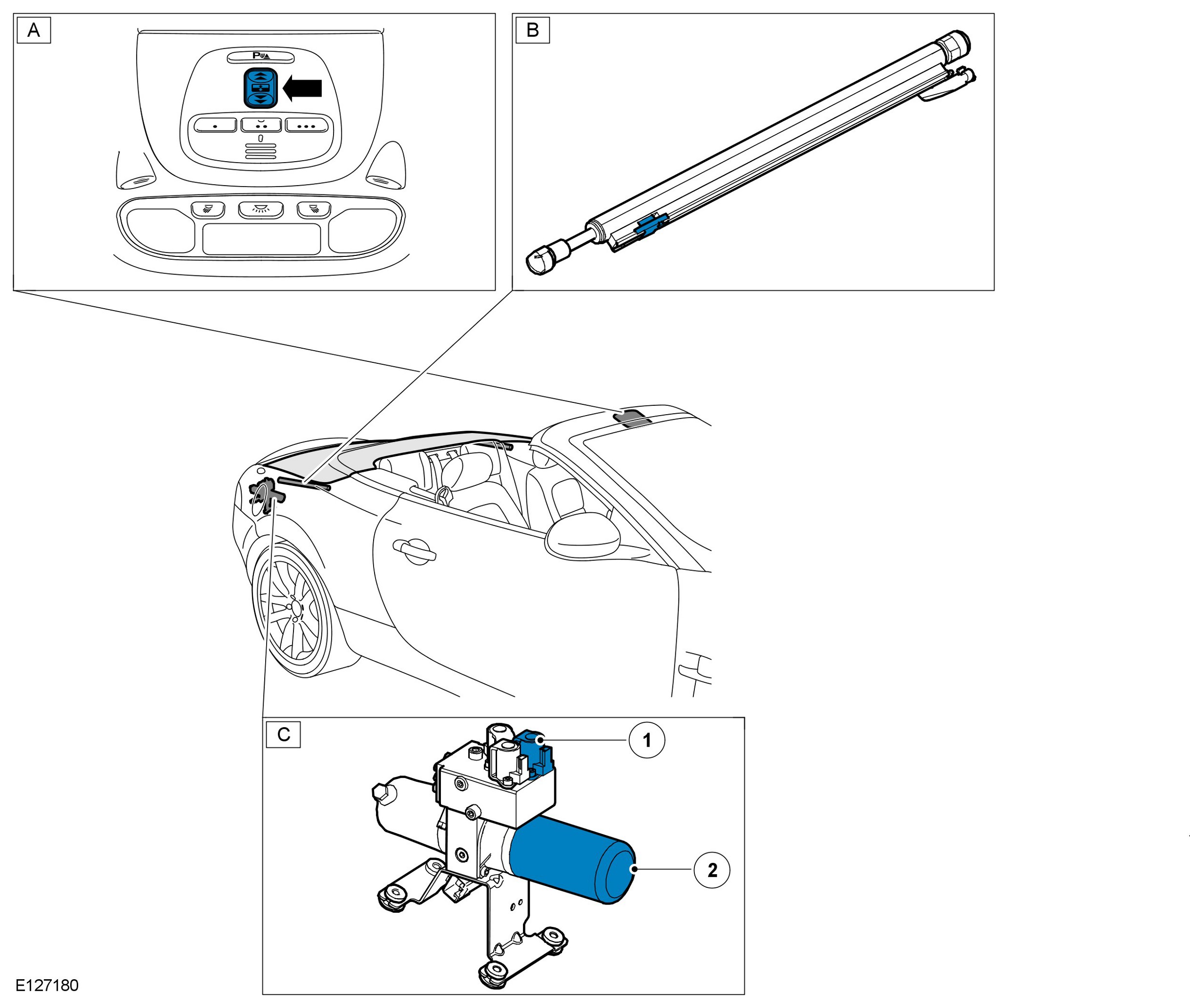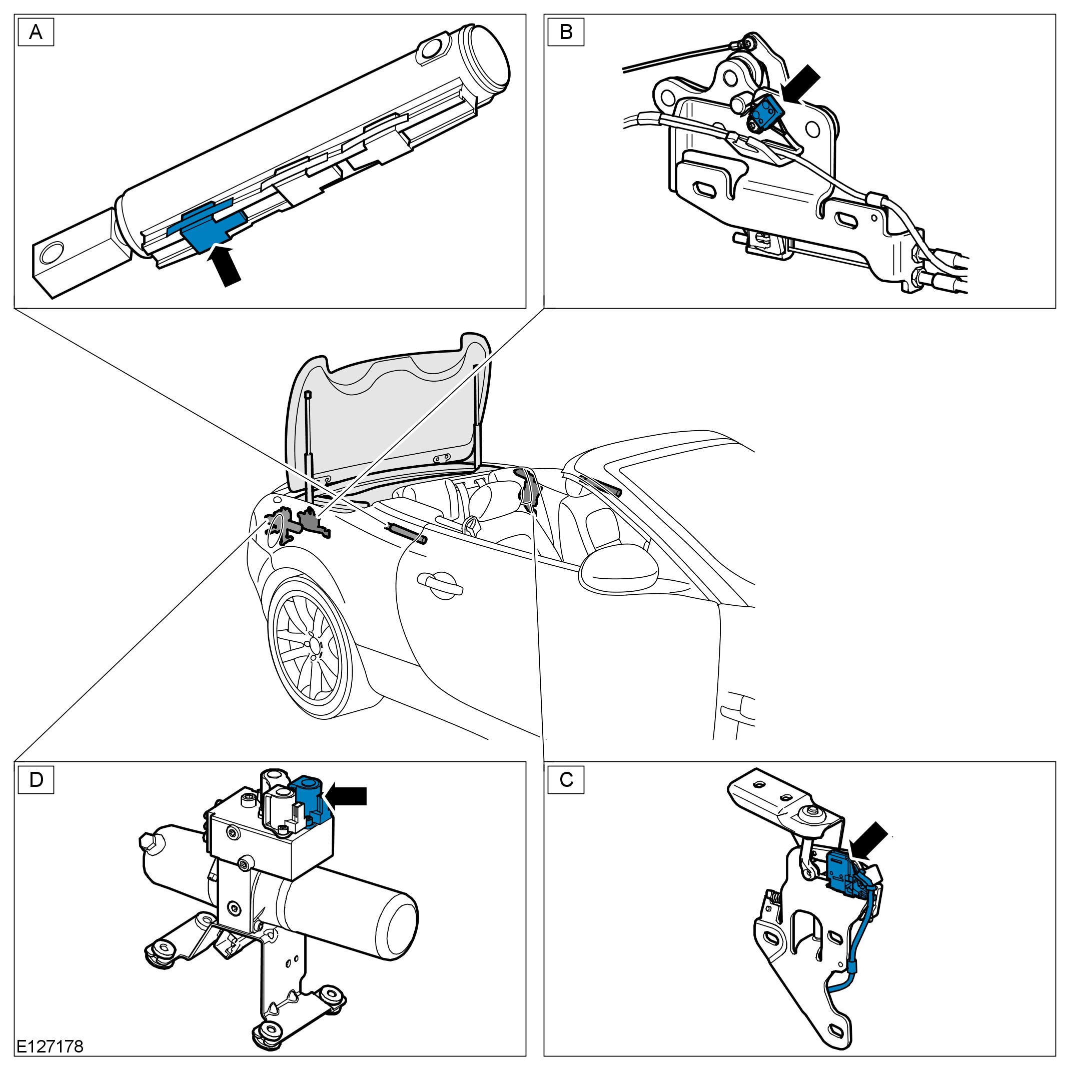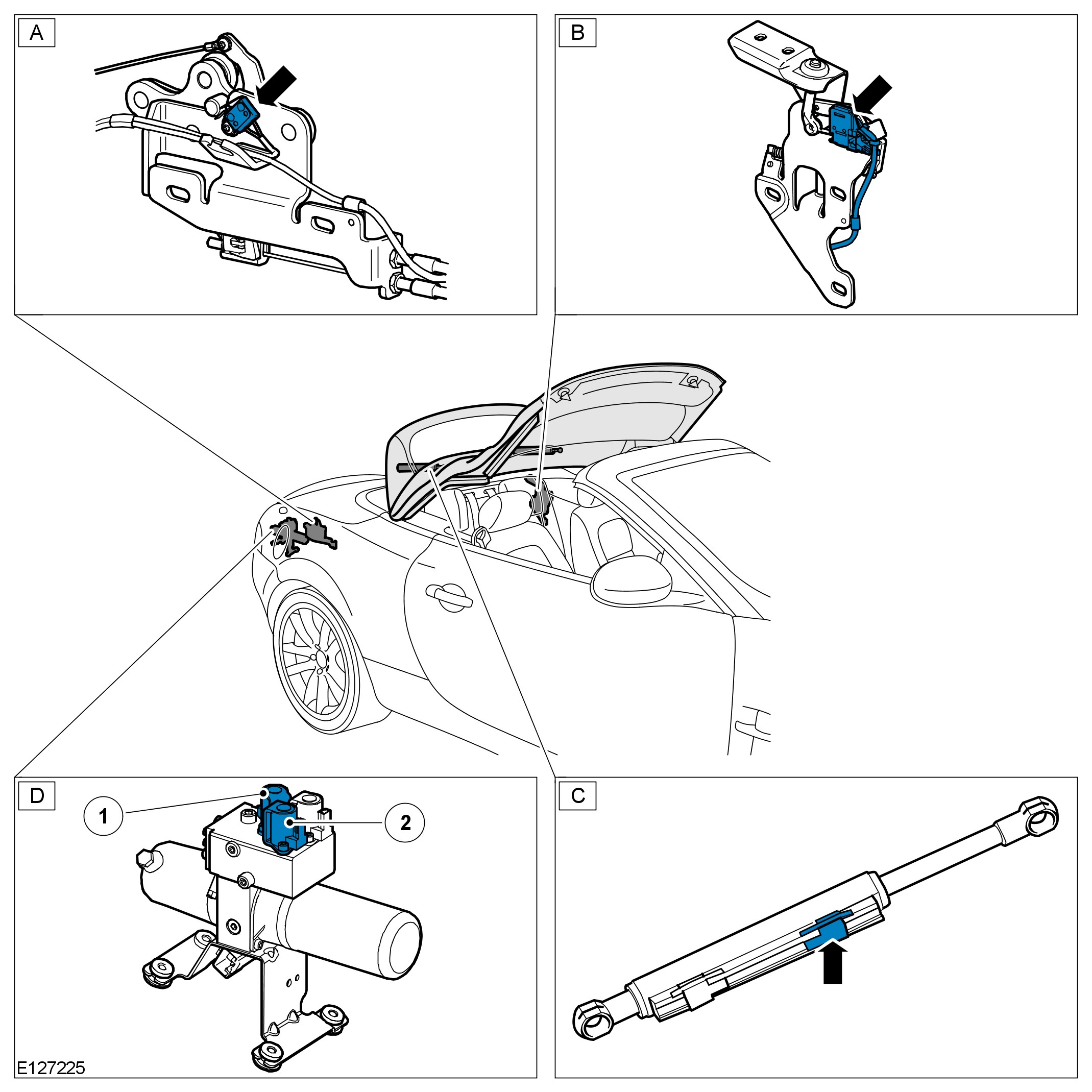 - The control module will confirm the 'center' sensor in the main bow cylinder (D) transmits a momentary signal; verifying the convertible top is opening.