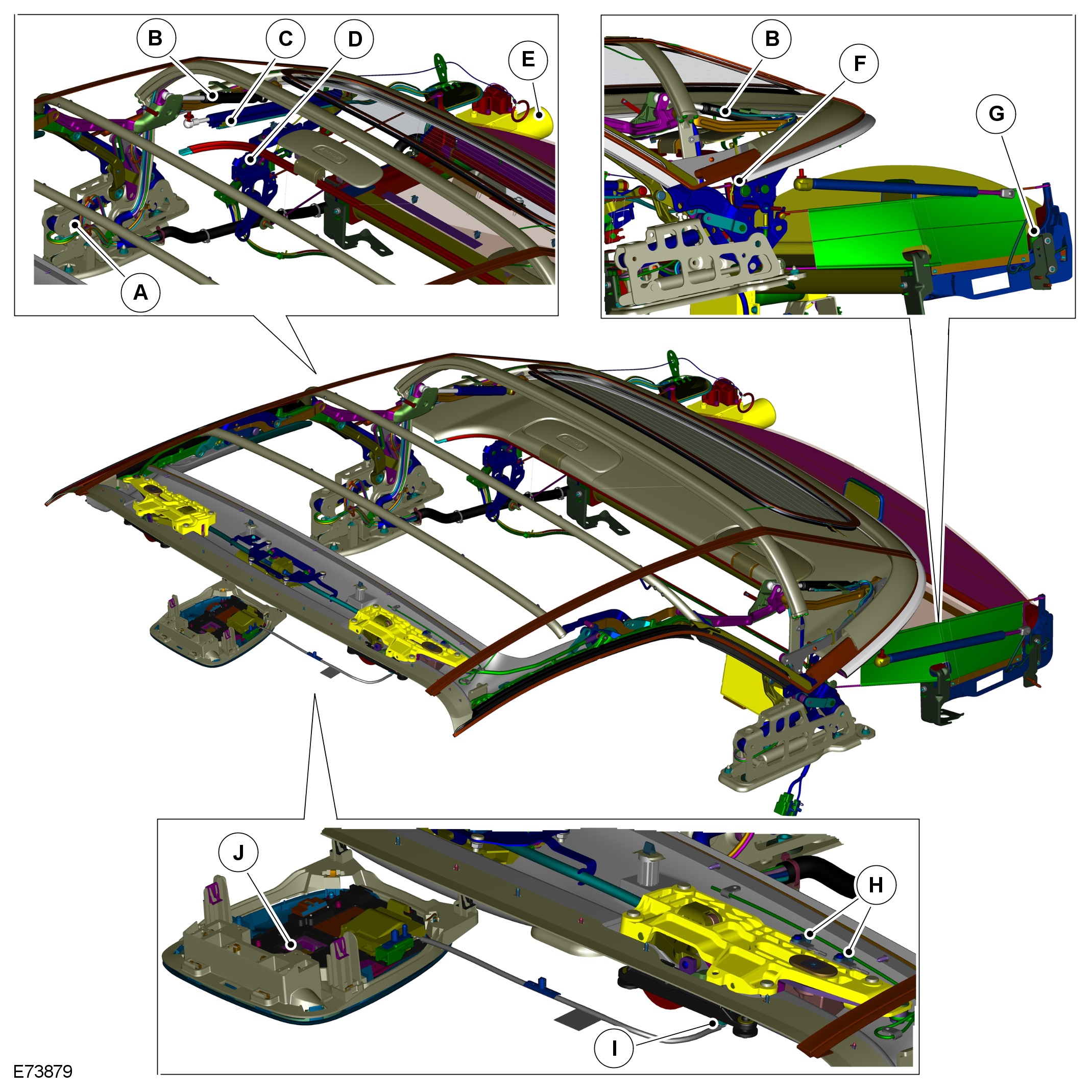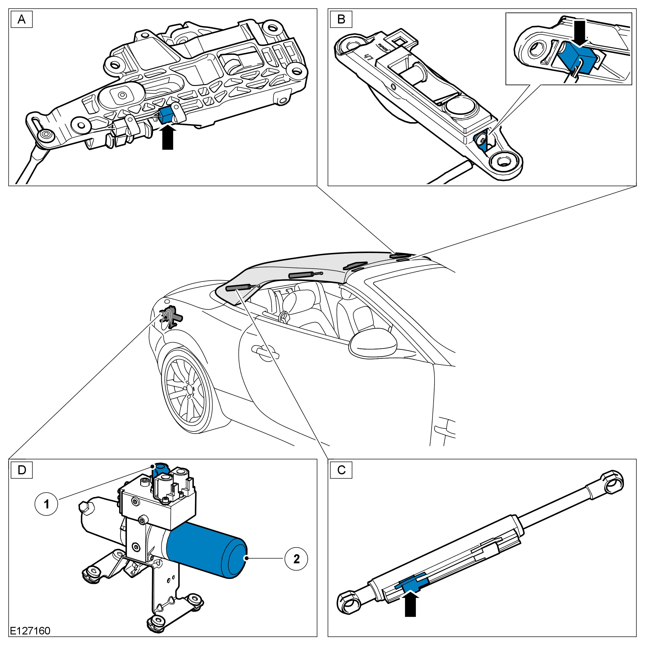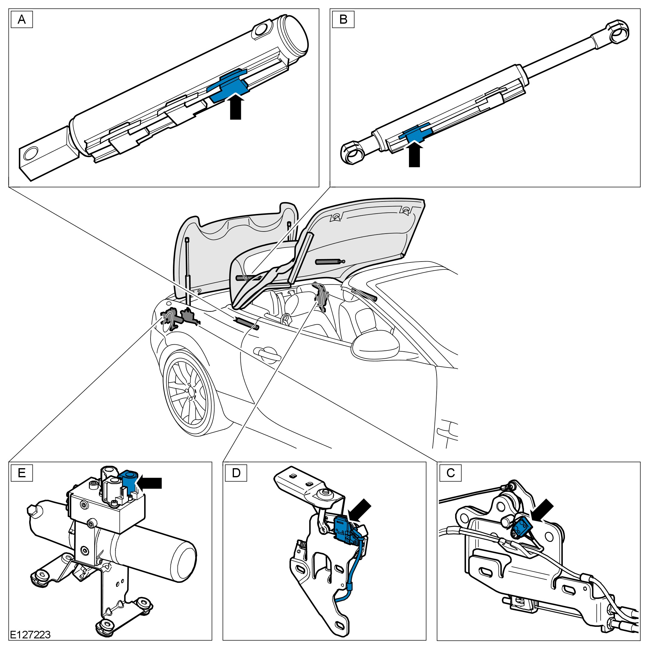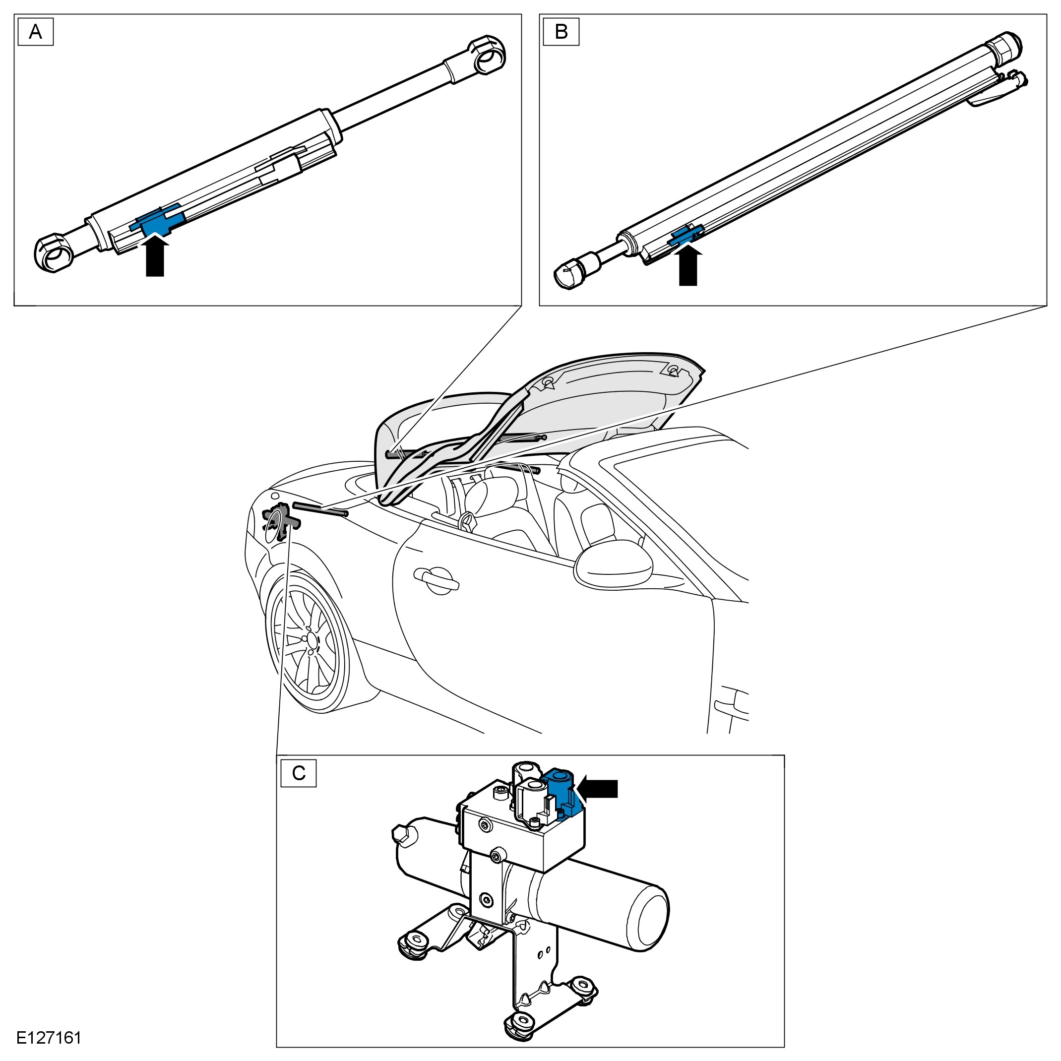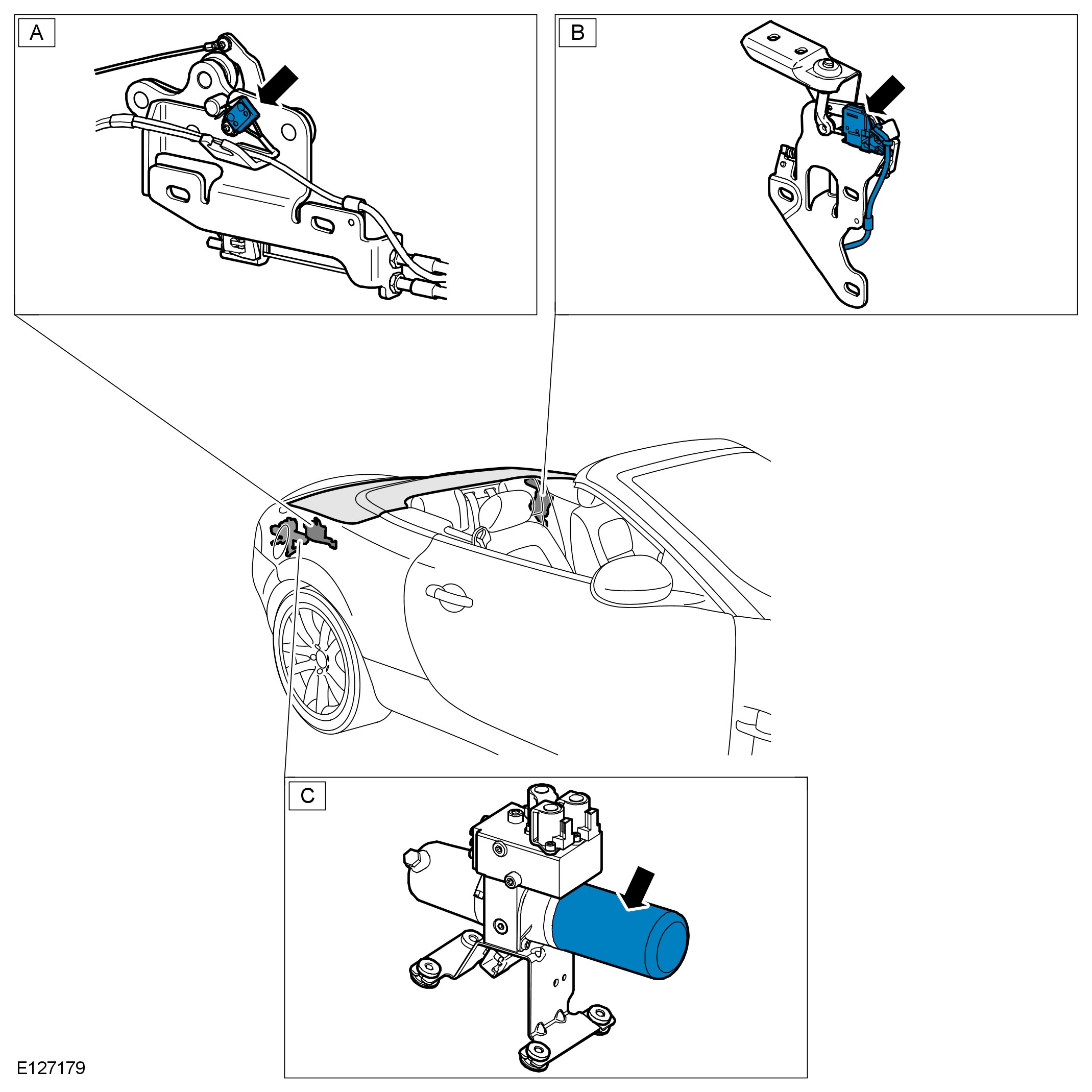 - The control module will confirm the 'center' sensor in the main bow cylinder (D) transmits a momentary signal; verifying the convertible top is opening.