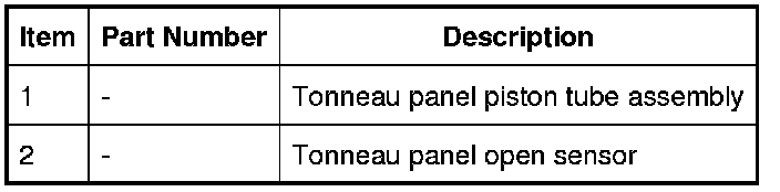 The tonneau panel open sensor is a Hall effect sensor located in the tonneau panel piston tube assembly. The piston tube assembly is located between the RH base latch plate and the lever assembly. This sensor informs the control module of when the tonneau panel is in the open position so the convertible top can be stowed.