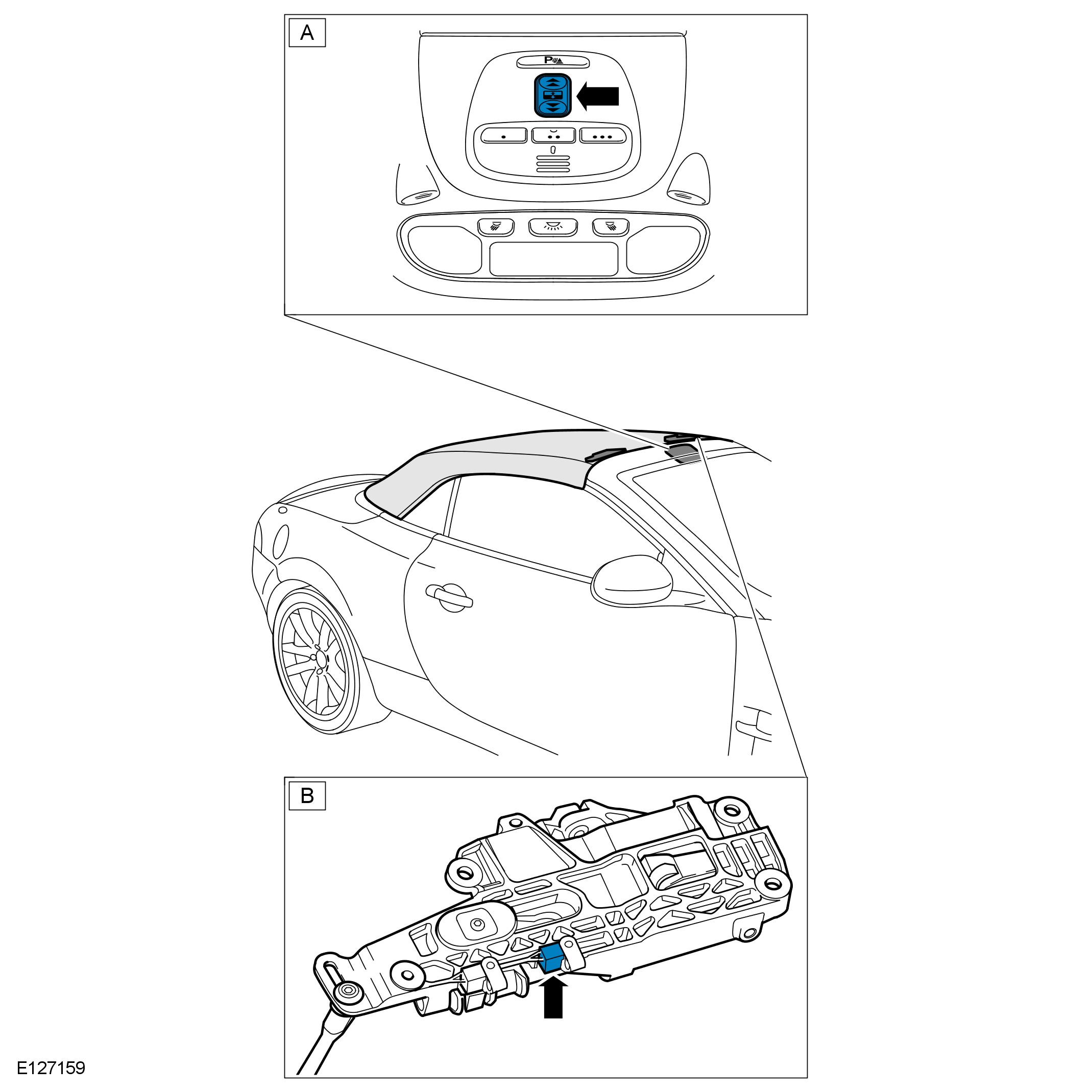 - Press and hold the open switch (A), this will signal the convertible top control module to commence the opening process.
