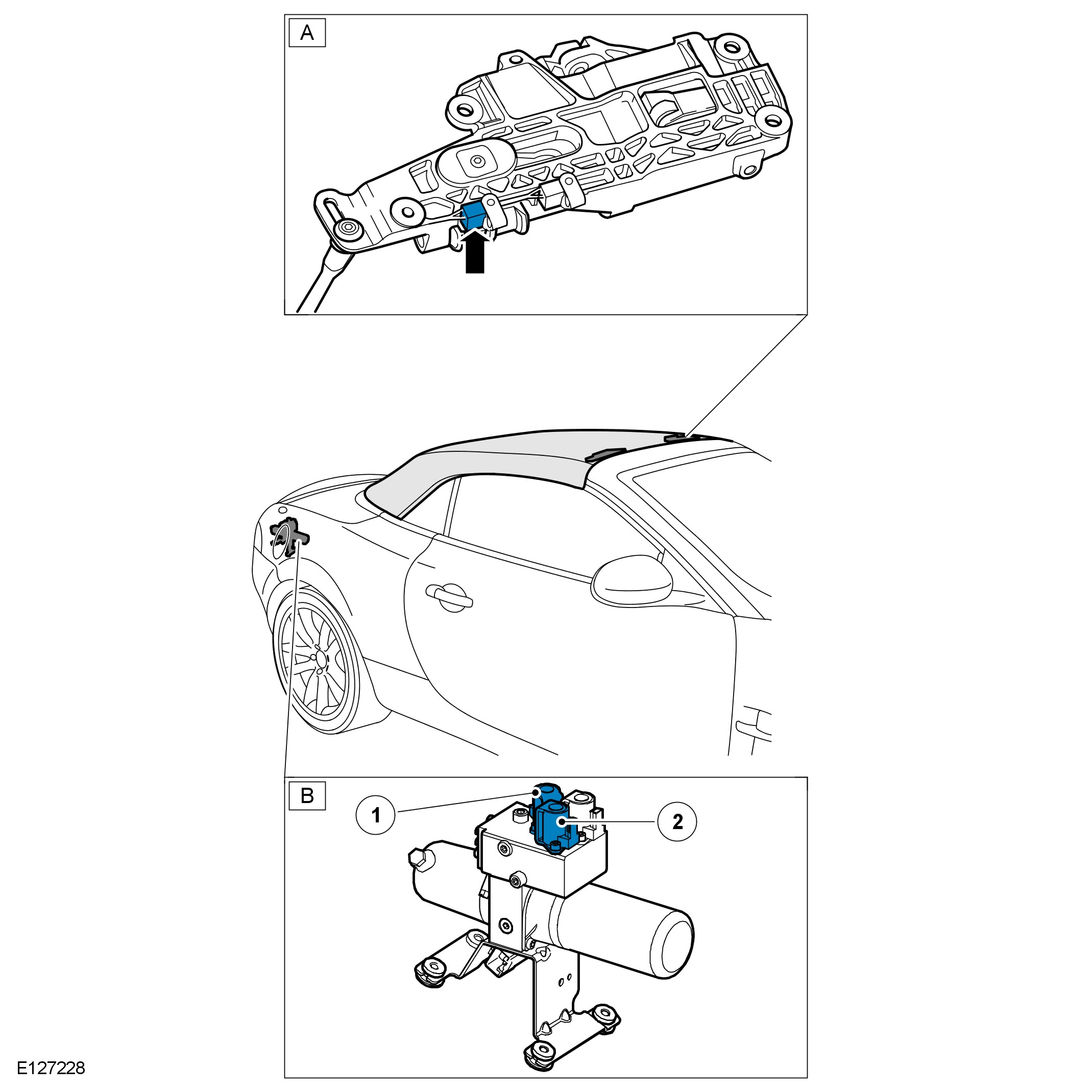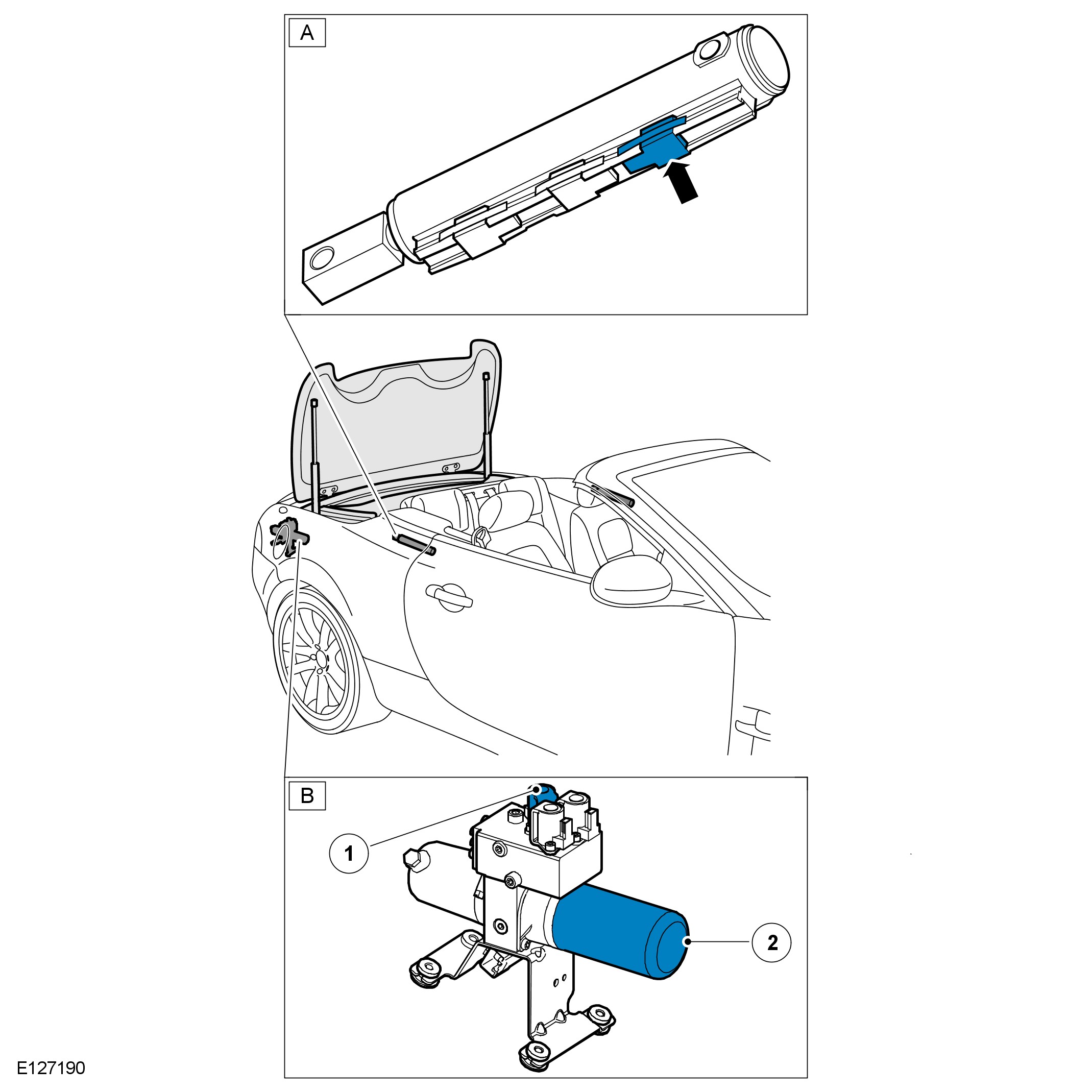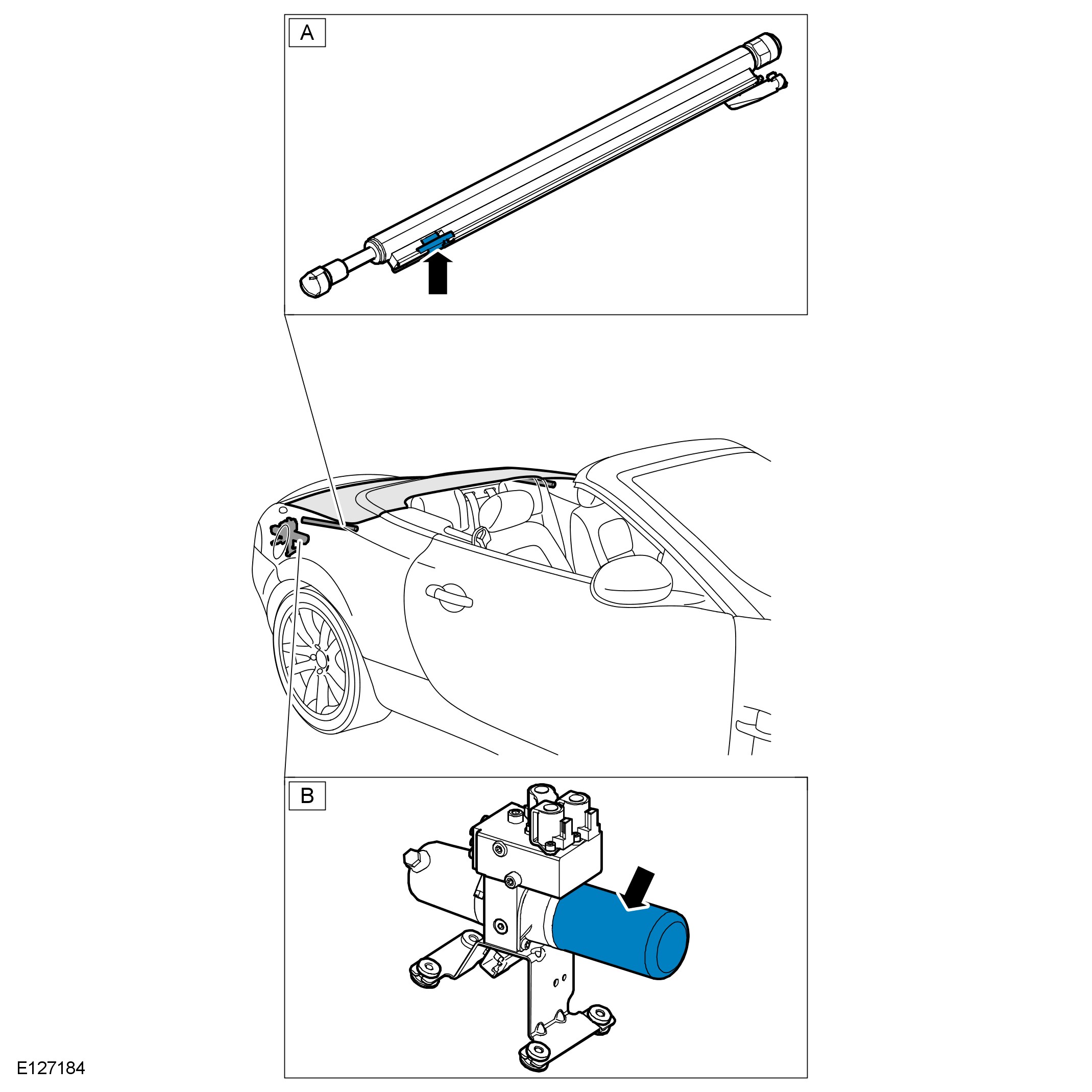 - The control module will confirm the 'in' sensor in the main bow cylinder (A) is transmitting a signal to indicate the convertible top is raised.
