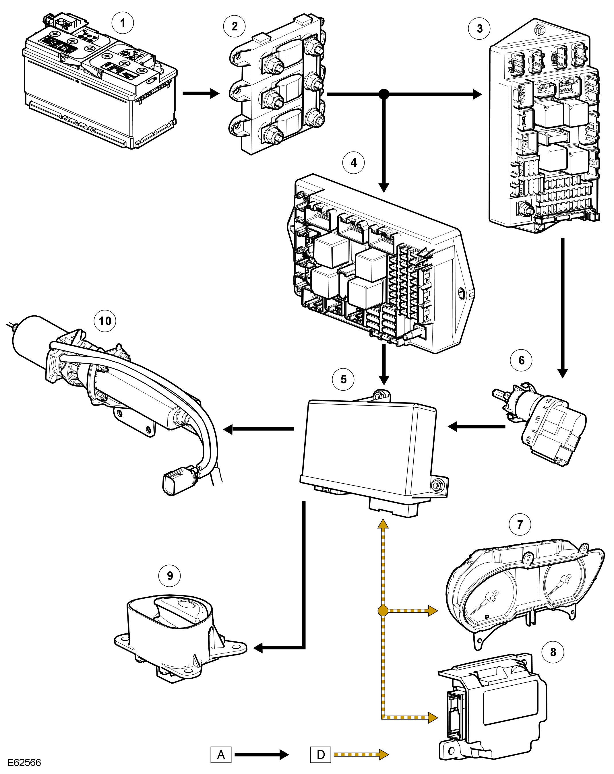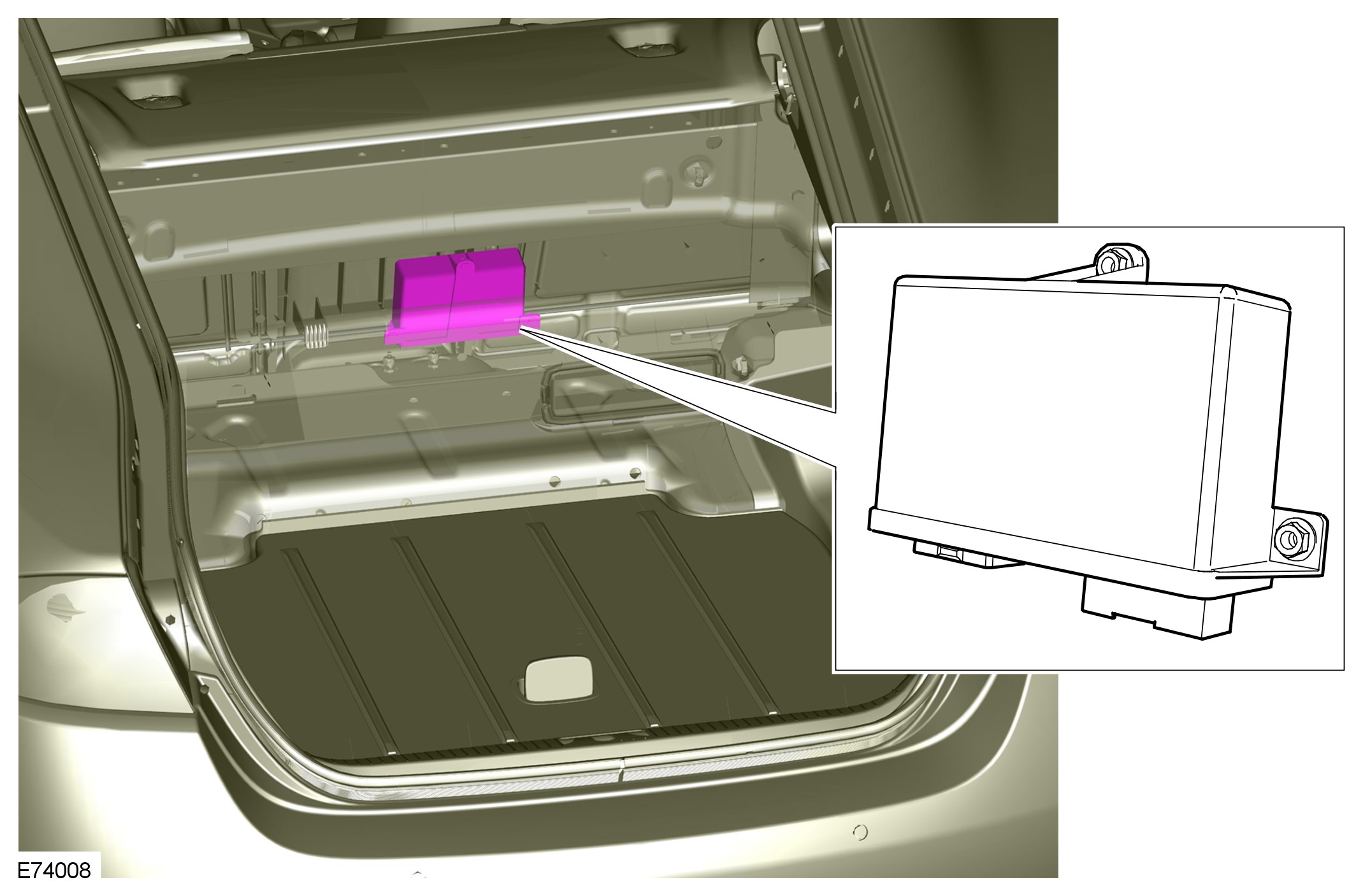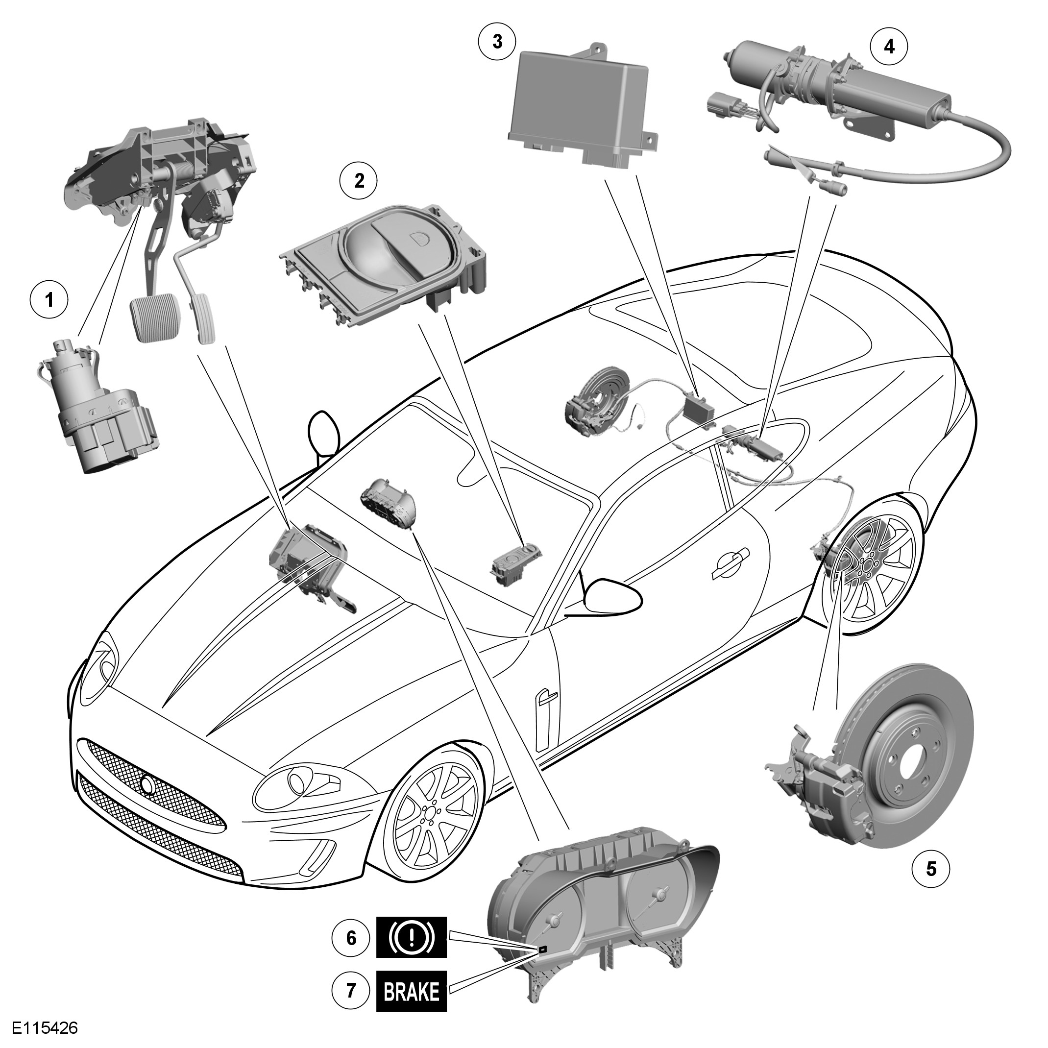 The parking brake control module is mounted behind the auxiliary junction box and is connected to the vehicles electrical wiring by two multiplugs. The control module is also connected to the high speed CAN (controller area network) bus, allowing it to communicate with other vehicle systems.