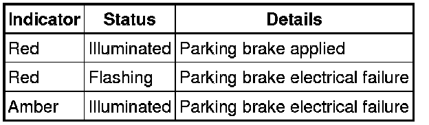 Depending on market specification, the instrument cluster may contain a red and an amber brake warning indicator, or only a red brake warning indicator. The functionality of the warning indicators is shown in the table below.