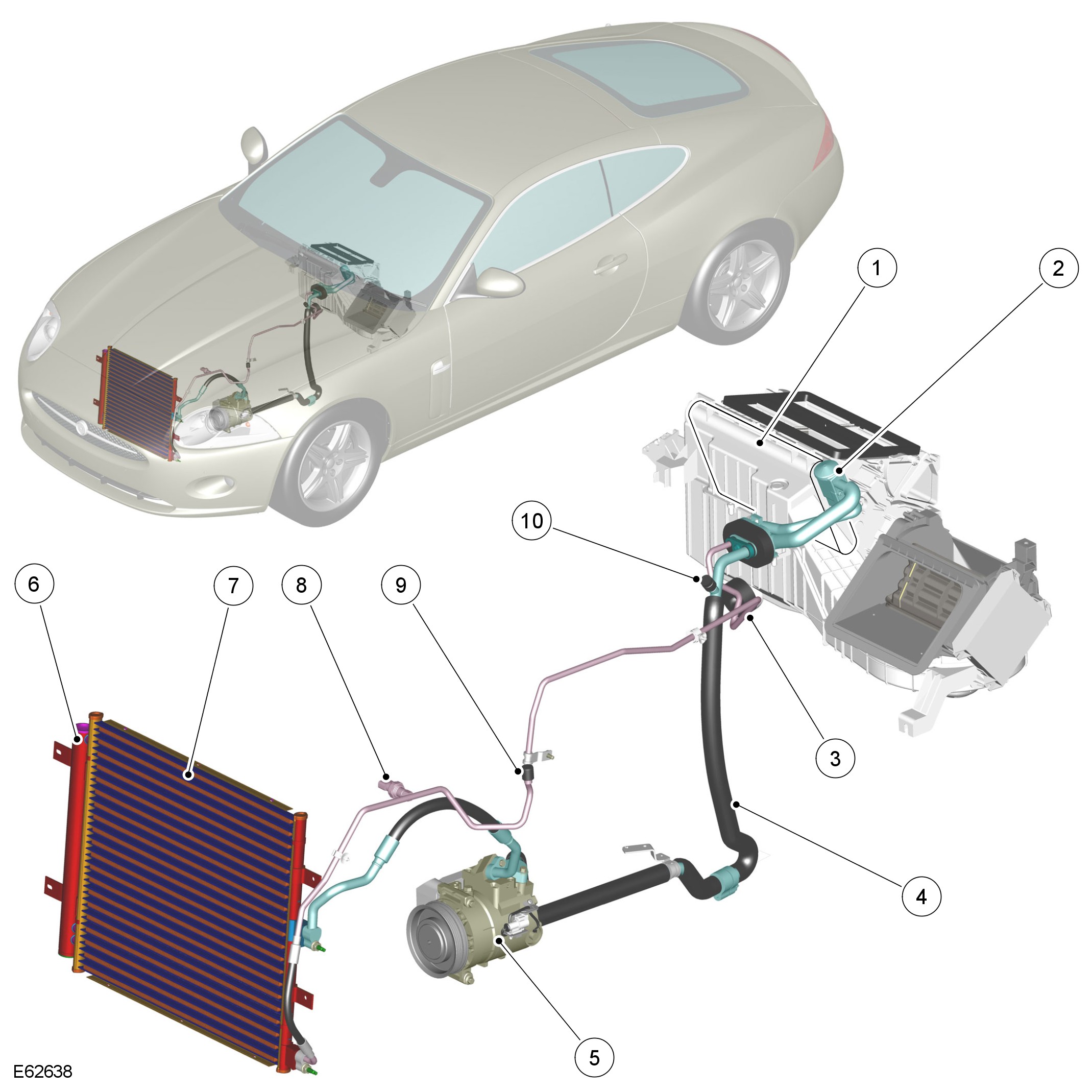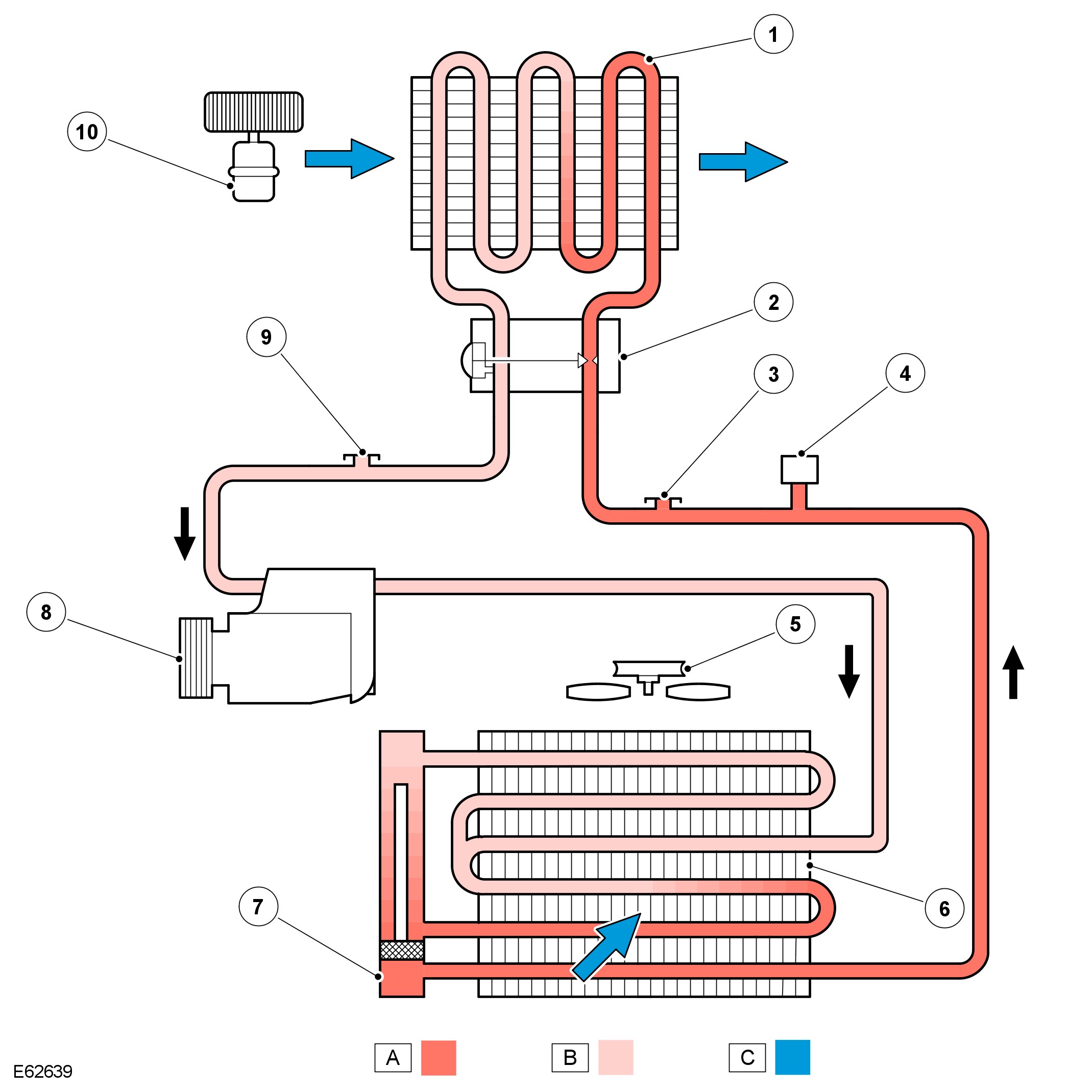 The high pressure/temperature regime is from the compressor, through the condenser and receiver drier assembly to the thermostatic expansion valve. The refrigerant increases in pressure and temperature as it passes through the compressor, then releases heat and changes state from a vapor to a liquid in the condenser.