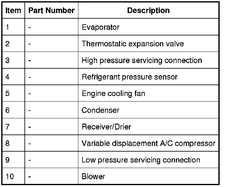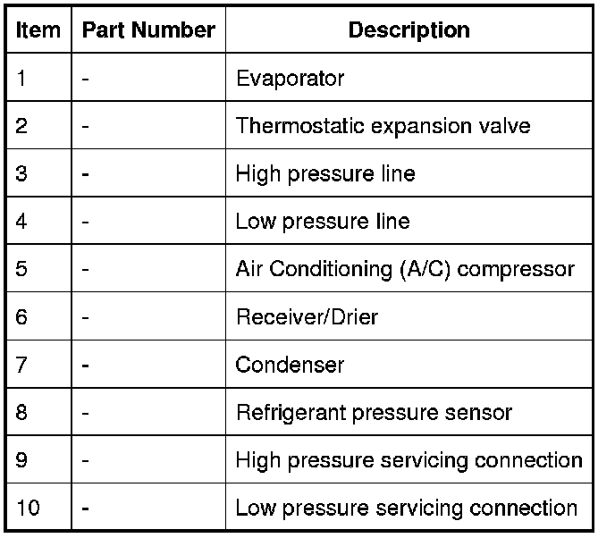 The A/C system transfers heat from the vehicle interior to the outside atmosphere to provide the heater assembly with dehumidified cool air. The A/C system is a sealed, closed loop system, filled with a charge weight of R134a refrigerant as the heat transfer medium. Oil is added to the refrigerant to lubricate the internal components of the A/C compressor.