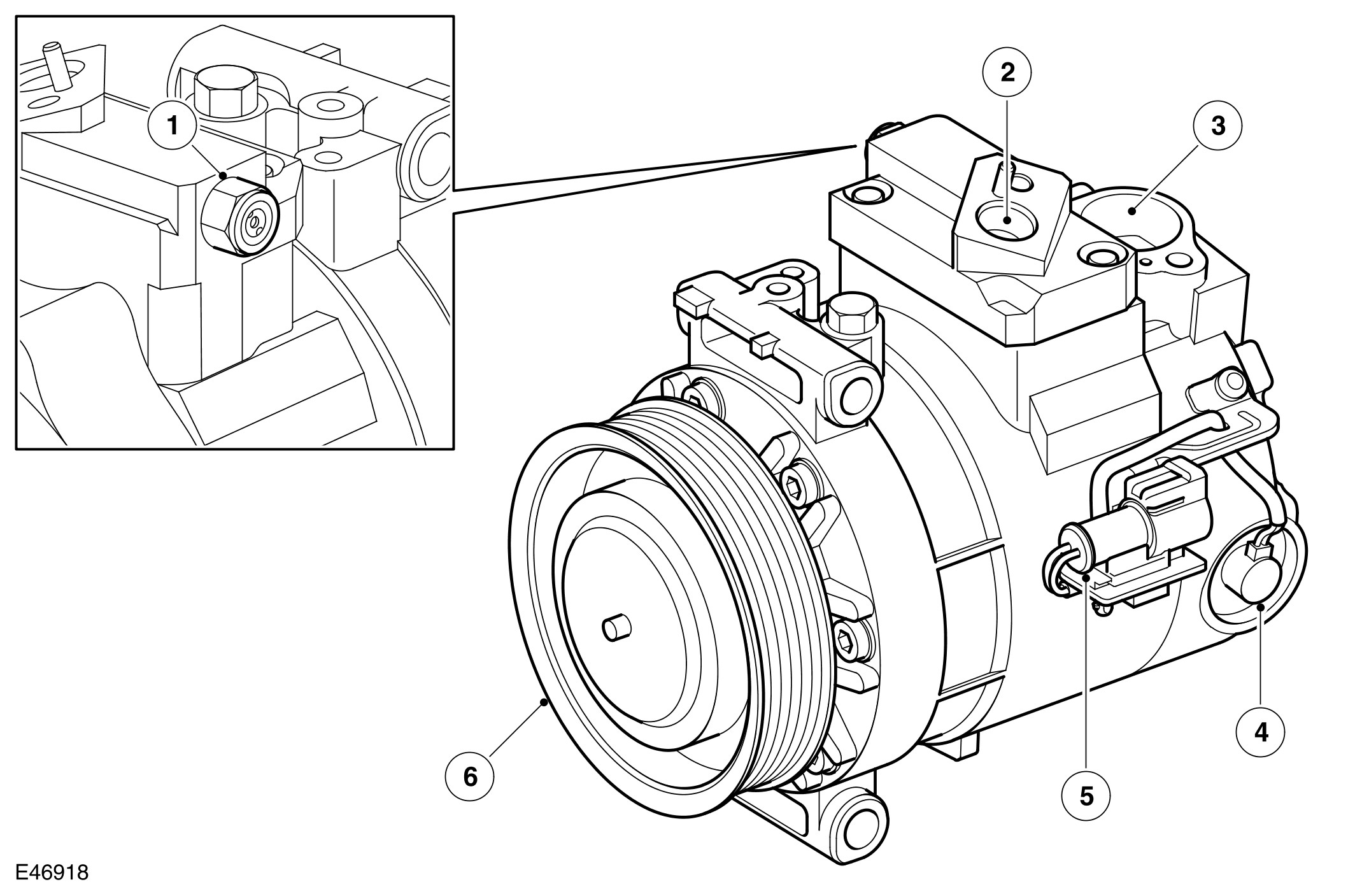 The A/C compressor is a permanently engaged variable displacement unit which is driven by the engine accessory drive belt. To protect the system from excessive pressure, a pressure relief valve is installed in the outlet side of the A/C compressor. The pressure relief valve vents excess pressure into the engine compartment.