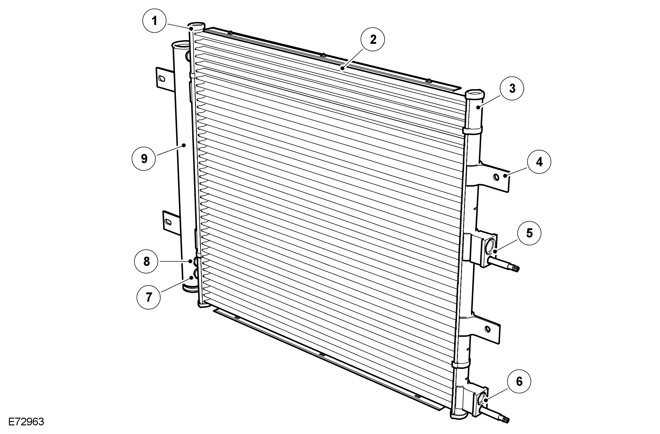 The condenser transfers heat from the refrigerant to the surrounding air to convert the high pressure vapor from the compressor into a liquid. The condenser is installed immediately in front of the radiator. Two brackets on each end tank attach the condenser to the end tanks of the radiator.