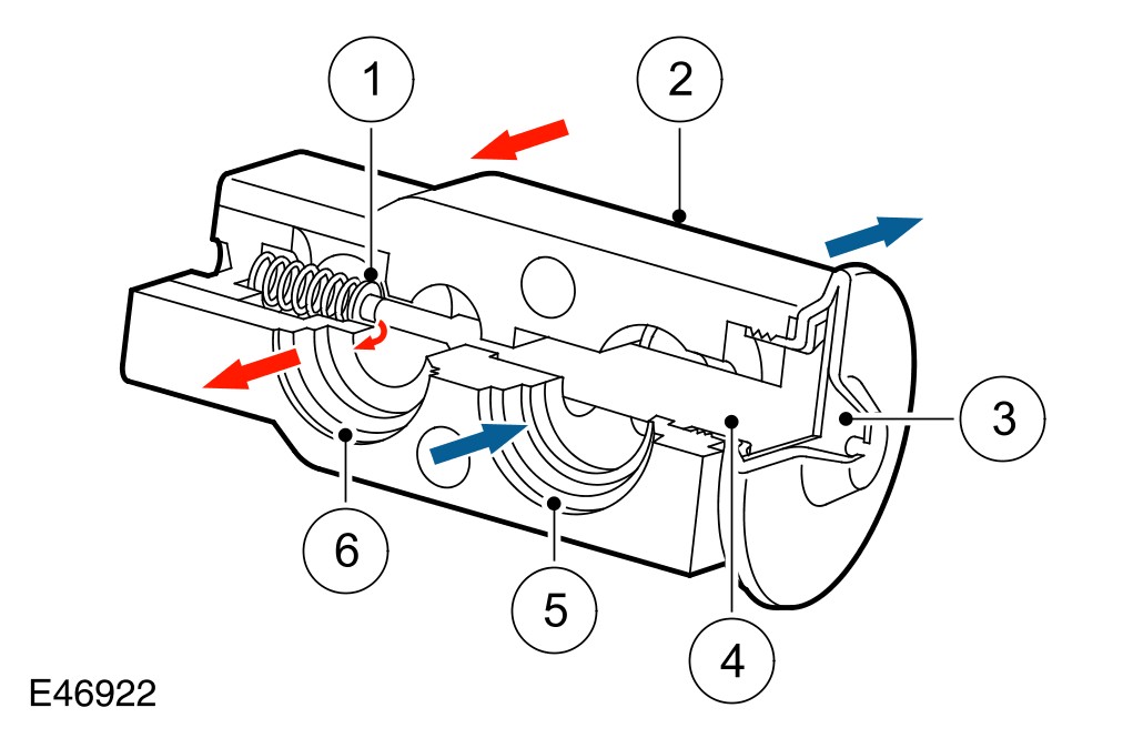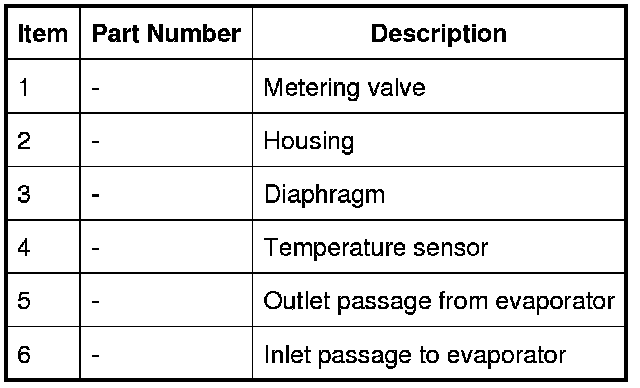 The thermostatic expansion valve is a block type valve located behind the heater assembly, and attached to the inlet and outlet ports of the evaporator. The thermostatic expansion valve consists of an aluminium housing containing inlet and outlet passages. A ball and spring metering valve is installed in the inlet passage and a temperature sensor is installed in the outlet passage. The temperature sensor consists of a temperature sensitive tube connected to a diaphragm. The bottom end of the temperature sensitive tube acts on the ball of the metering valve. Pressure on top of the diaphragm is controlled by the evaporator outlet temperature conducted through the temperature sensitive tube. The bottom of the diaphragm senses evaporator outlet pressure.