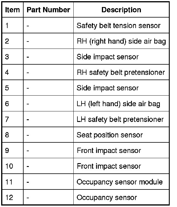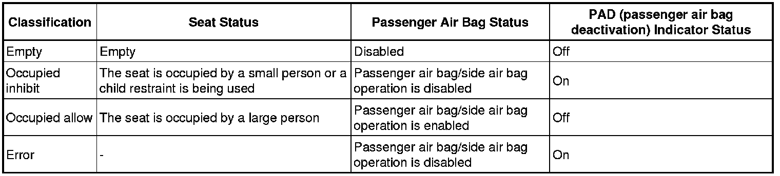 For markets that have an occupant classification system, this provides the RCM (restraints control module) with the occupancy status of the front passenger seat. The RCM (restraints control module) uses this and the seat buckle status in the evaluation of the firing strategy for the passenger front air bag, side air bag and pretensioner.