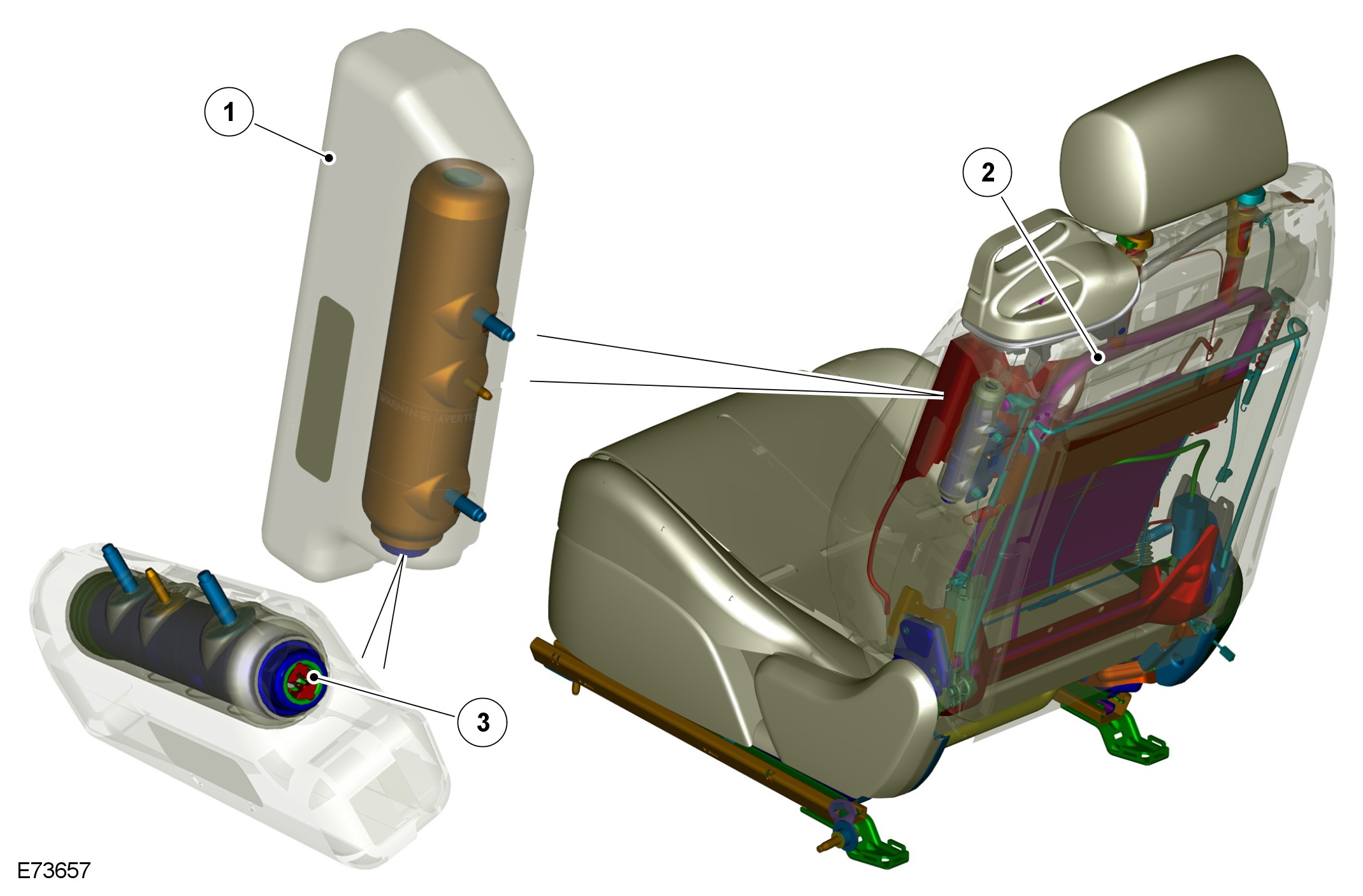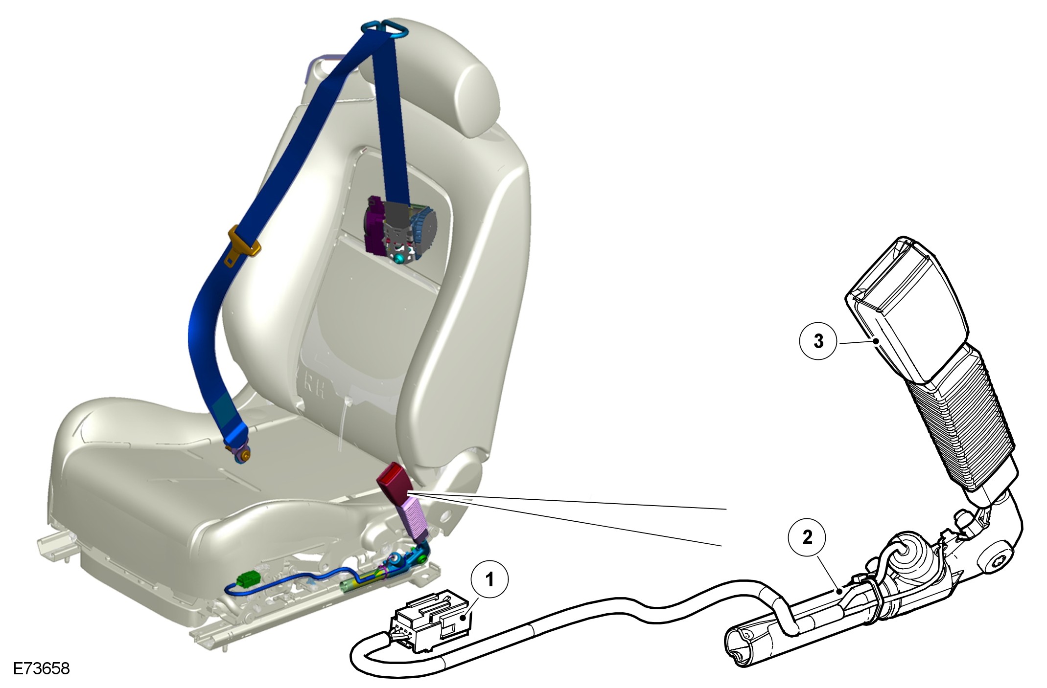 Each pretensioner has a tube containing an inflator and a piston. The inflator is connected to the RCM (restraints control module). The piston is attached to a steel cable, the opposite end of which is attached to the safety belt buckle.