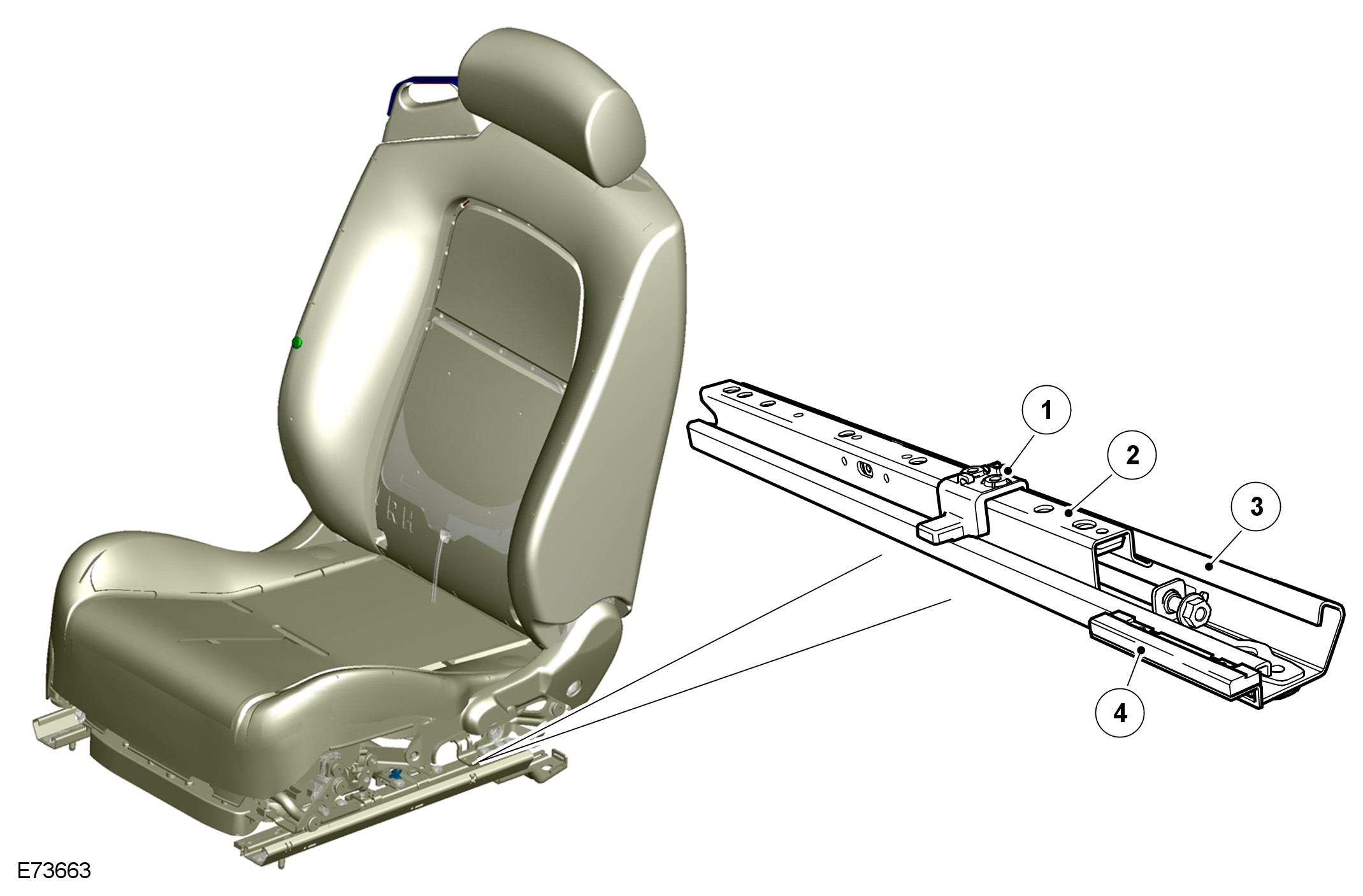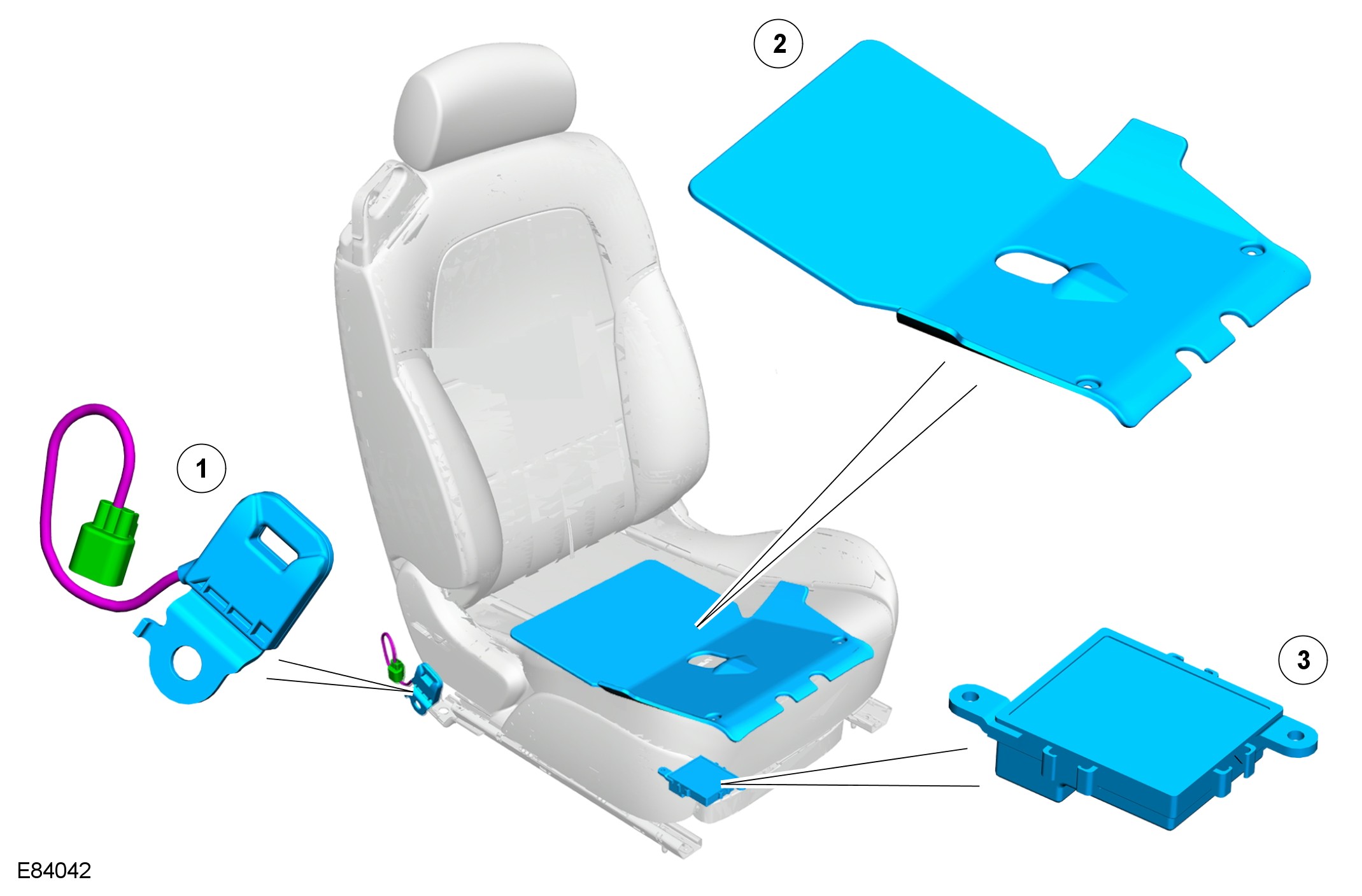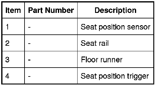 A seat position sensor is installed on the driver seat. The seat position sensor allows the RCM (restraints control module) to detect when the seat is forward of a given point on the seat track. The seat position sensor consists of a Hall effect sensor attached to the seat frame and a target plate on the seat base. While the ignition is on, the RCM (restraints control module) supplies the sensor with a power supply of 12 V nominal, and monitors the return voltage. When the seat frame moves forwards, the sensor moves over the target plate, which changes the reluctance of the sensor. The change of voltage is detected by the RCM (restraints control module) and used as a switching point. The switching point is when the center of the sensor is 3 ± 4 mm (0.12 ± 0.16 in.) from the leading edge of the target plate.