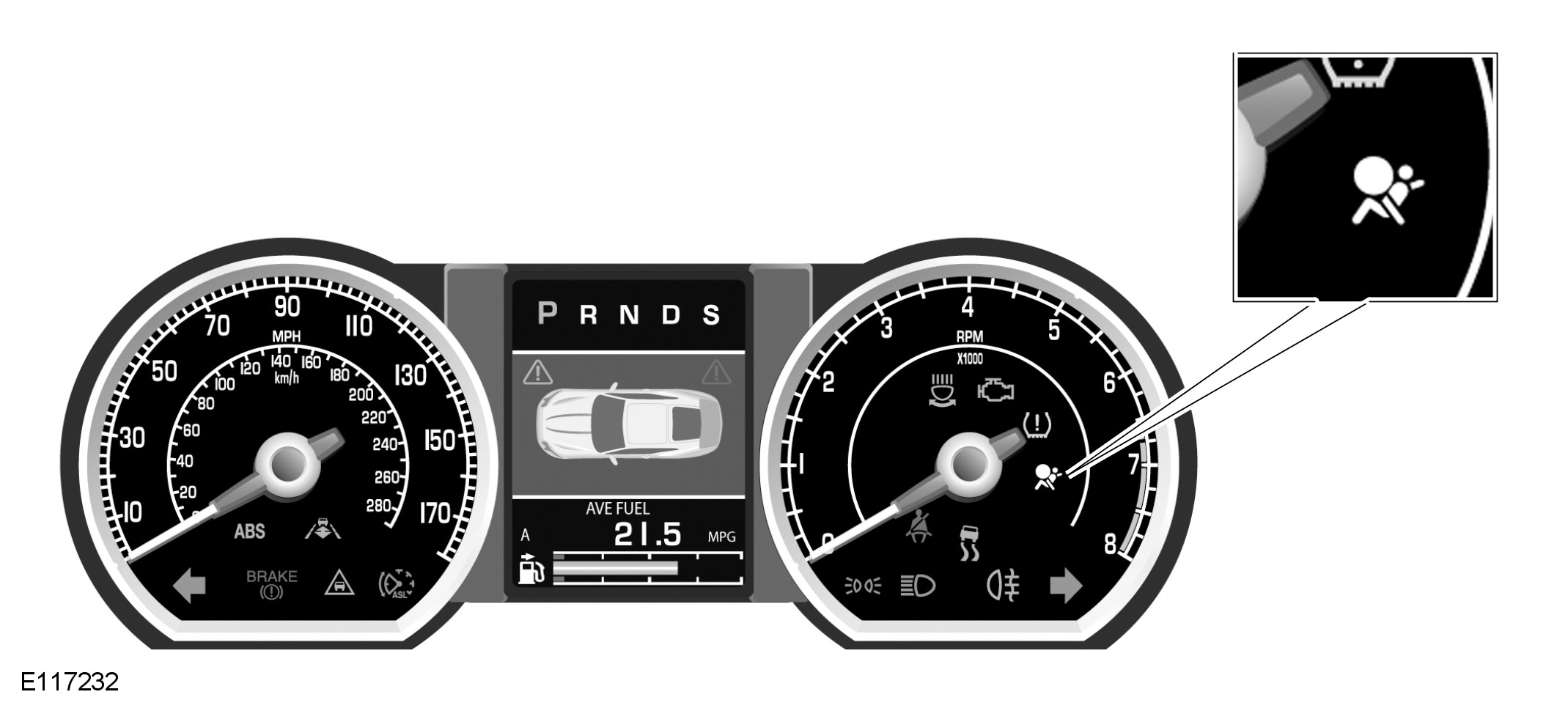 Operation of the air bag warning indicator is controlled by a high speed CAN (controller area network) bus message from the RCM (restraints control module) to the instrument cluster. The RCM (restraints control module) illuminates the air bag warning indicator if a fault is detected, and for approximately 6 seconds during the indicator check at the beginning of each ignition cycle.