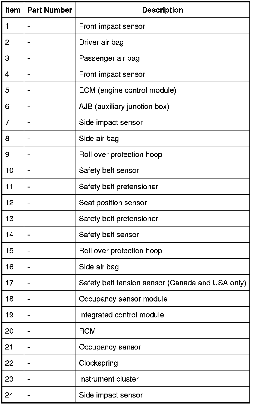 Two side impact sensors are mounted at the base of the B pillars to facilitate lateral impact sensing. In the event of a side impact, the RCM (restraints control module) processes the crash data against the stored data. The RCM (restraints control module) will deploy the side air bag module on the side the deployment request was initiated.