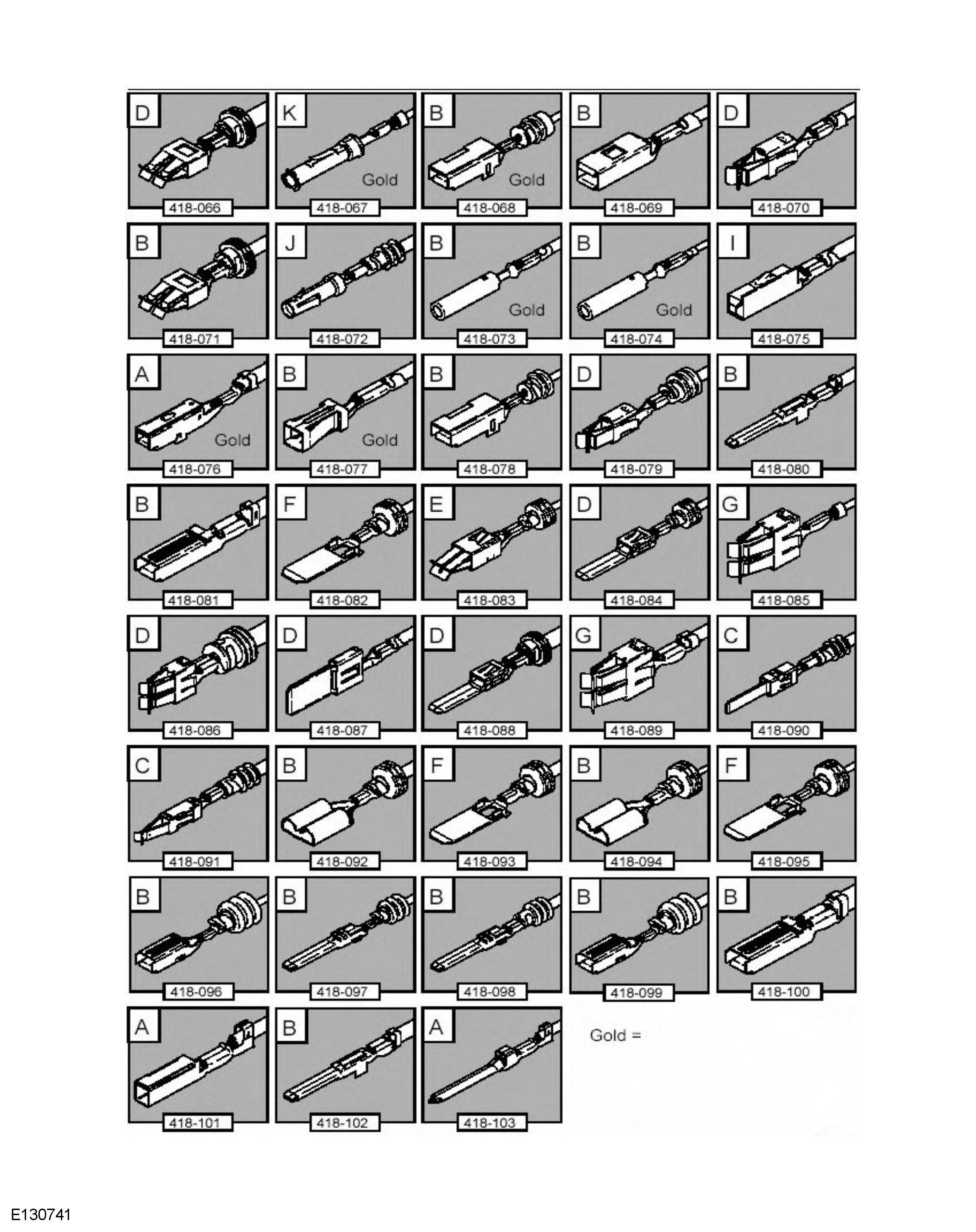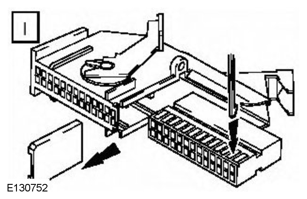 CAUTION: : A number of electrical connector terminals are gold plated or gold flashed. When defective, they must be installed with a gold pre-terminated wiring harness(s) from the wiring harness repair kit. It is not always easy to identify the female as gold but the male pins are visually easier, therefore always check both male and female terminals to identify those which are gold. Under no circumstances are gold and tin terminals to be mixed as this will lead to early failure of the electrical contact.