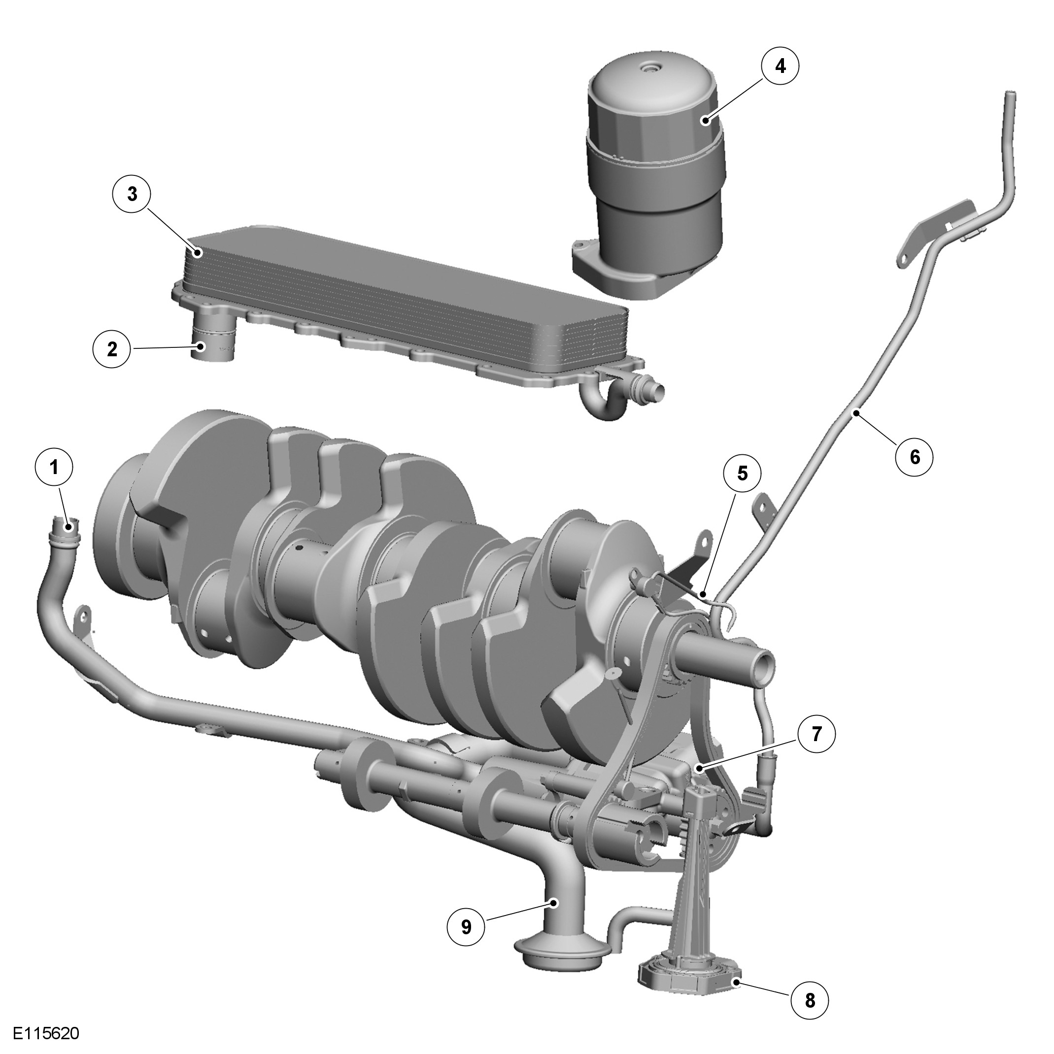 The oil pump draws oil from the sump pan through a centrally mounted pick-up pipe. The oil is pressurized and pumped through an output tube to the cylinder block. After passing through an anti-drain valve and a plate type oil cooler, the oil is filtered by a replaceable cartridge installed on the front of the RH (right-hand) cylinder head.