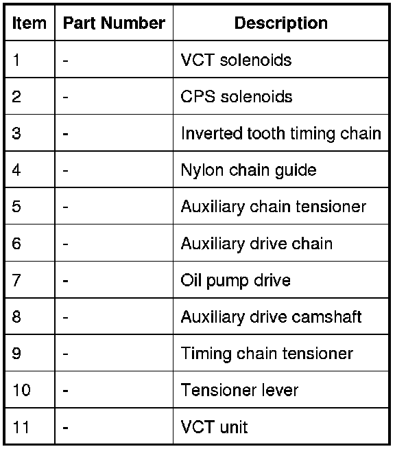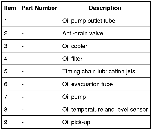 The output from the oil filter is distributed through oil galleries in the cylinder heads and cylinder block. All moving parts are lubricated by pressure or splash oil. Pressurized oil is also provided for the VCT (variable camshaft timing) system, the CPS system, the timing chain tensioners and the timing chain lubrication jets.