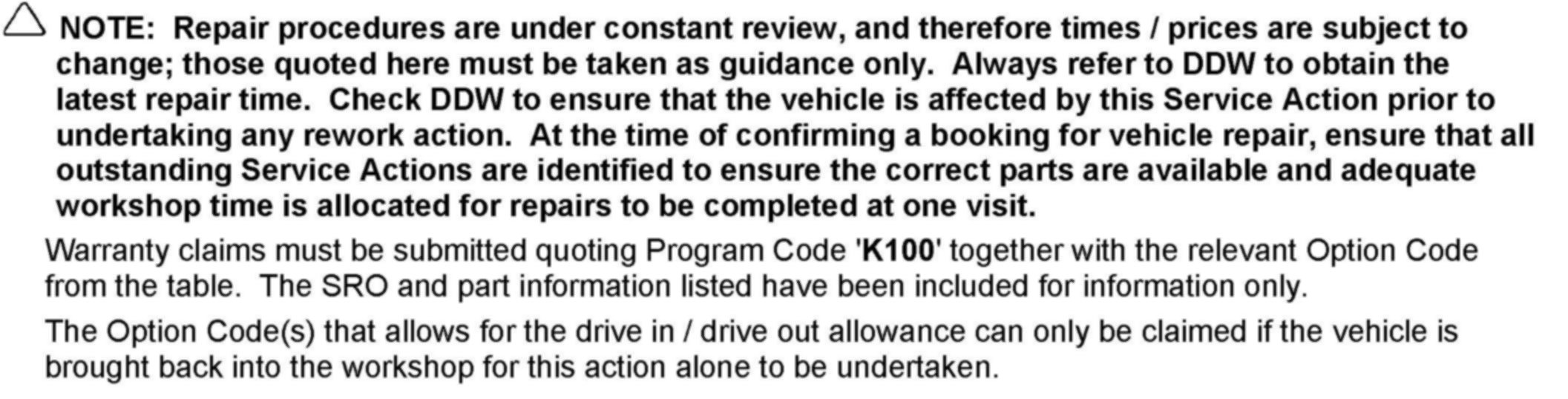Retailers are required to 'HOLD' all affected vehicles within their control and refrain from releasing the vehicles for onward distribution and sale pending completion of the rework actions detailed in this bulletin. Affected vehicles in the hands of owners should be repaired at the next available opportunity. At the time of customer appointment, ensure that all outstanding service campaigns for each individual vehicle are identified and allocate sufficient time and resources to complete all campaigns. Refer to the Repair Procedure outlined below.