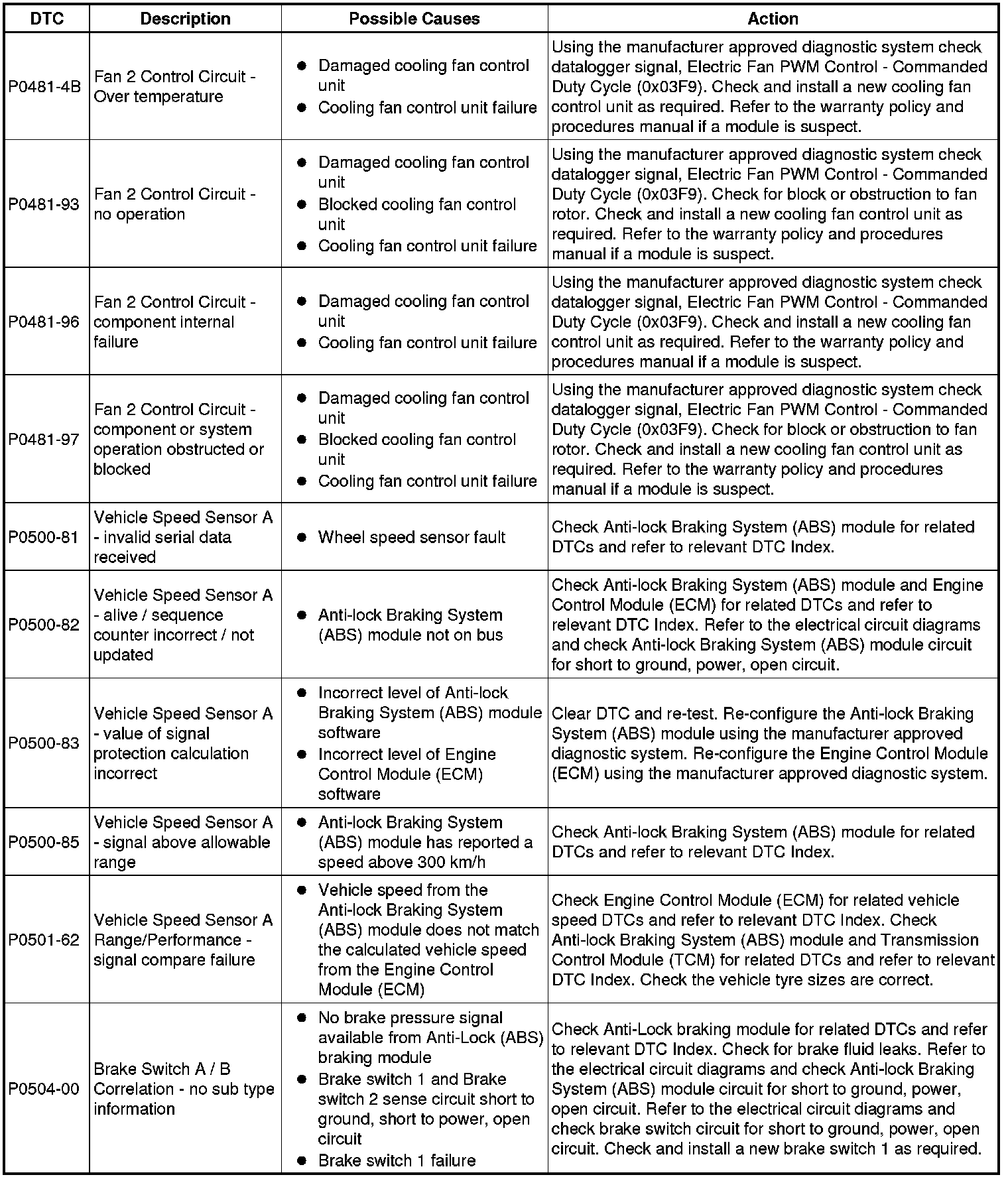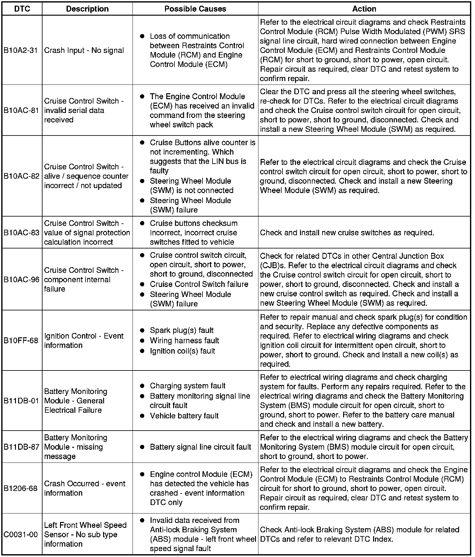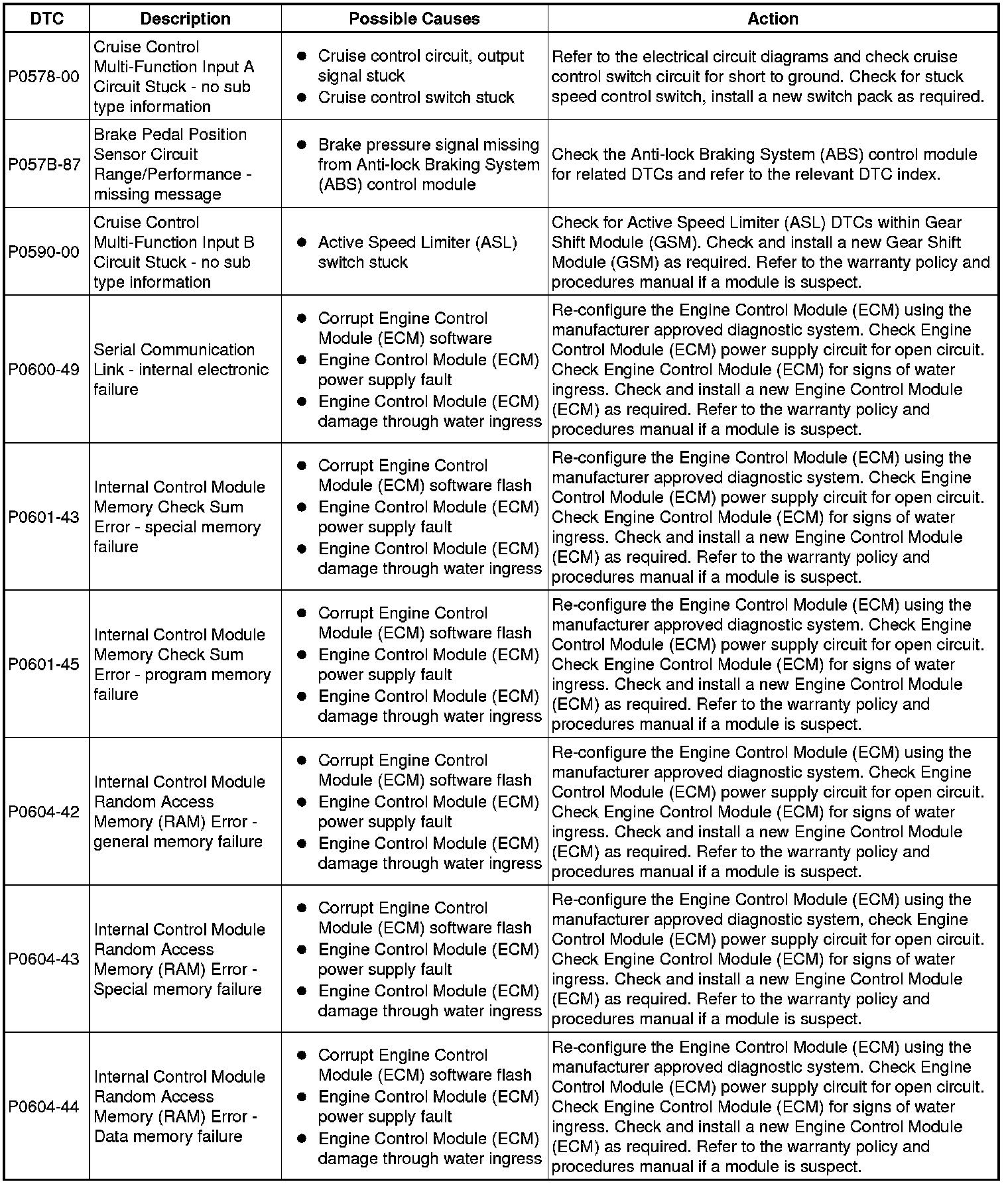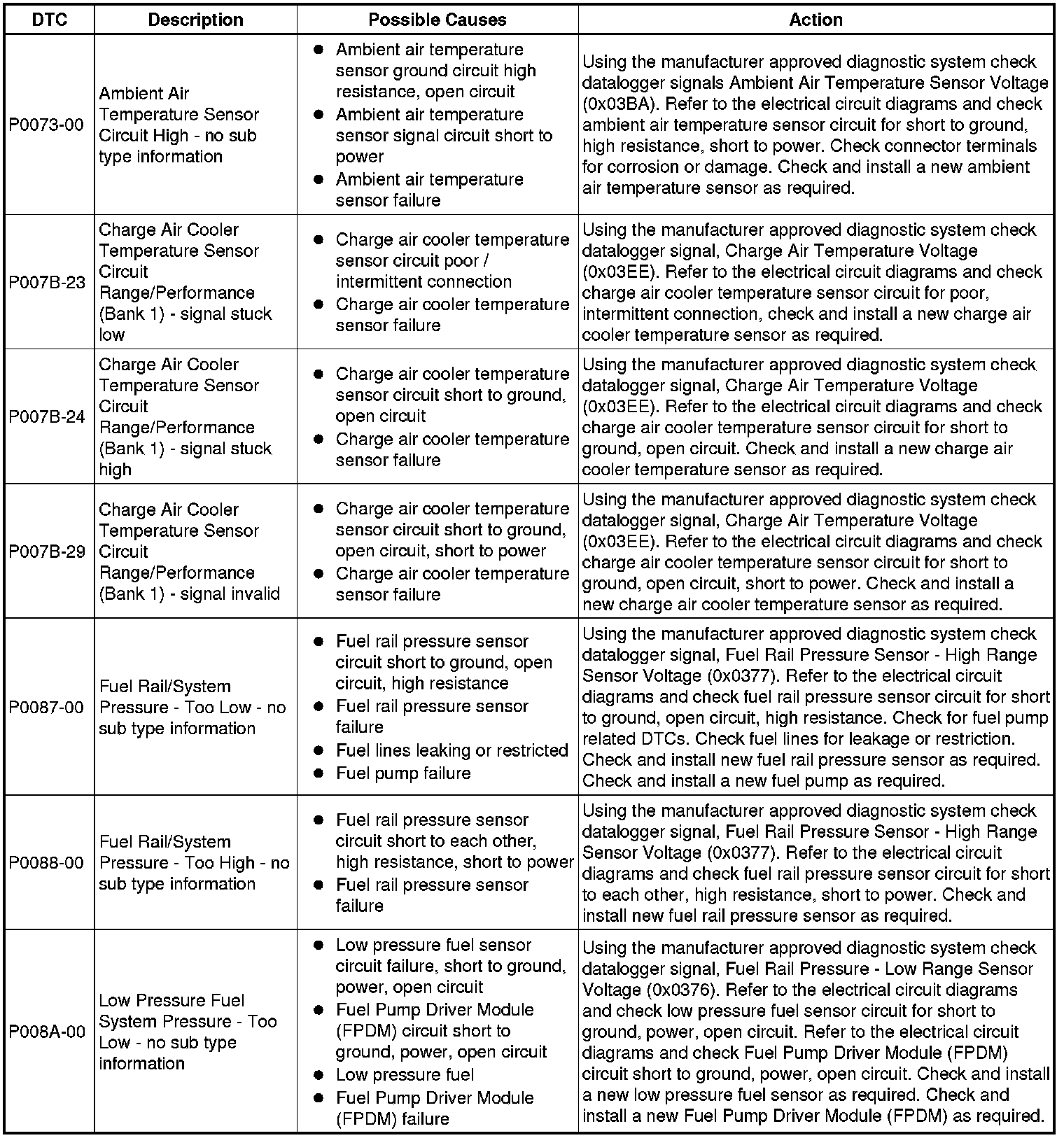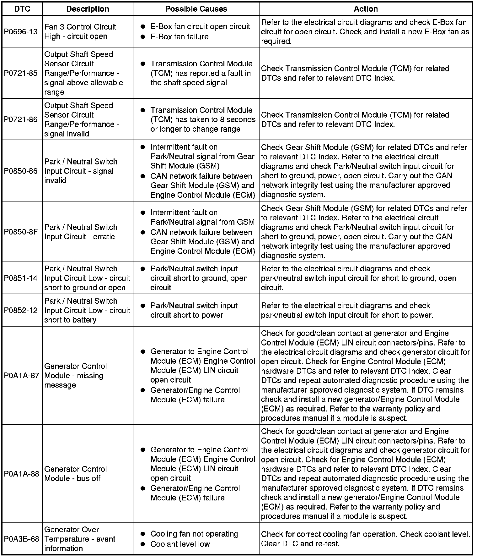 Generic scan tools may not read the codes listed, or may read only five digit codes. Match the five digits from the scan tool to the first five digits of the seven digit code listed to identify the fault (the last two digits give additional information read by the manufacturer-approved diagnostic system).