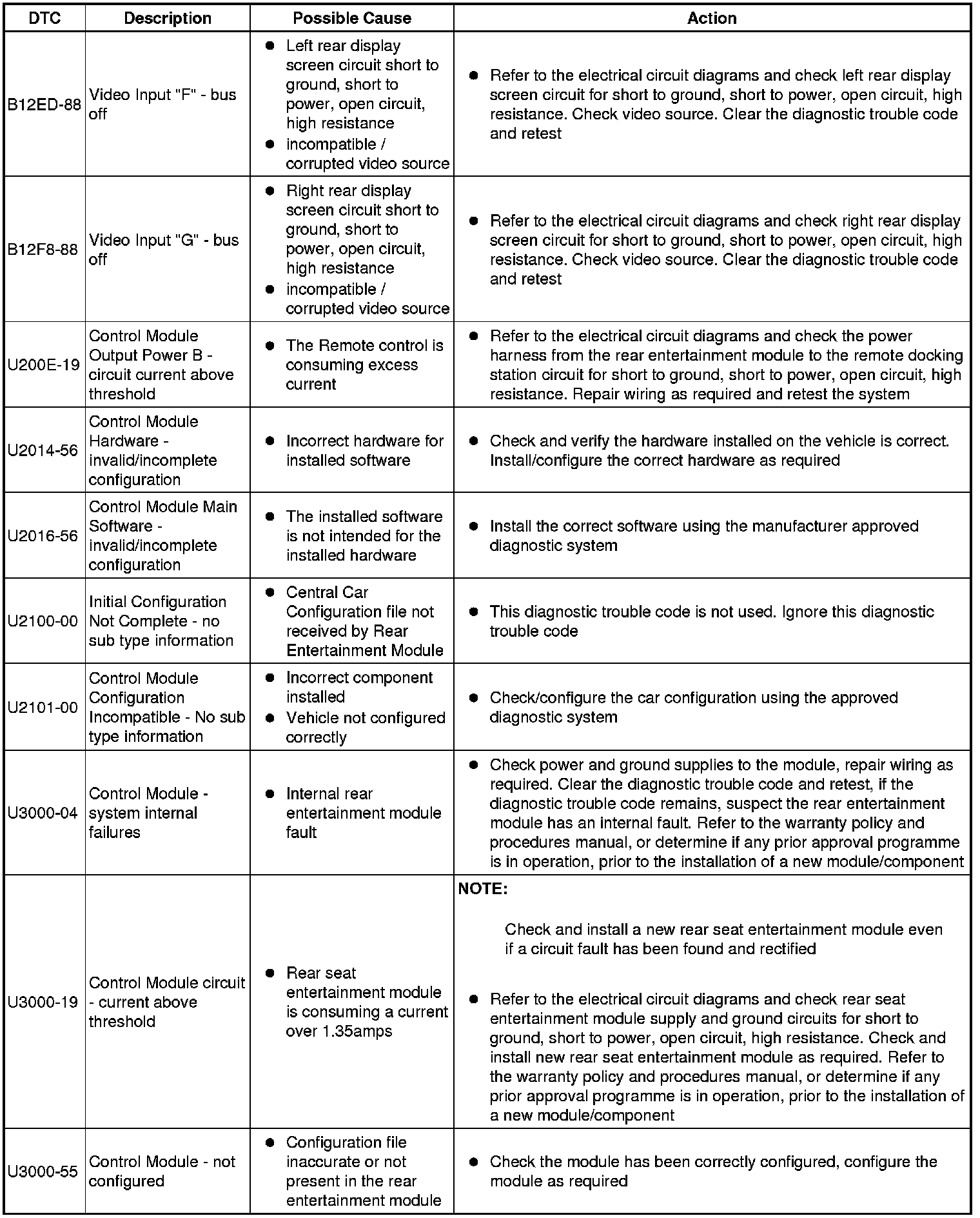 The table below lists all Diagnostic Trouble Codes (DTCs) that could be logged in the Rear Entertainment Module, for additional Diagnosis and Testing information refer to the relevant Diagnosis and Testing Section. For additional information, refer to Information and Entertainment System Initial Inspection and Diagnostic Overview