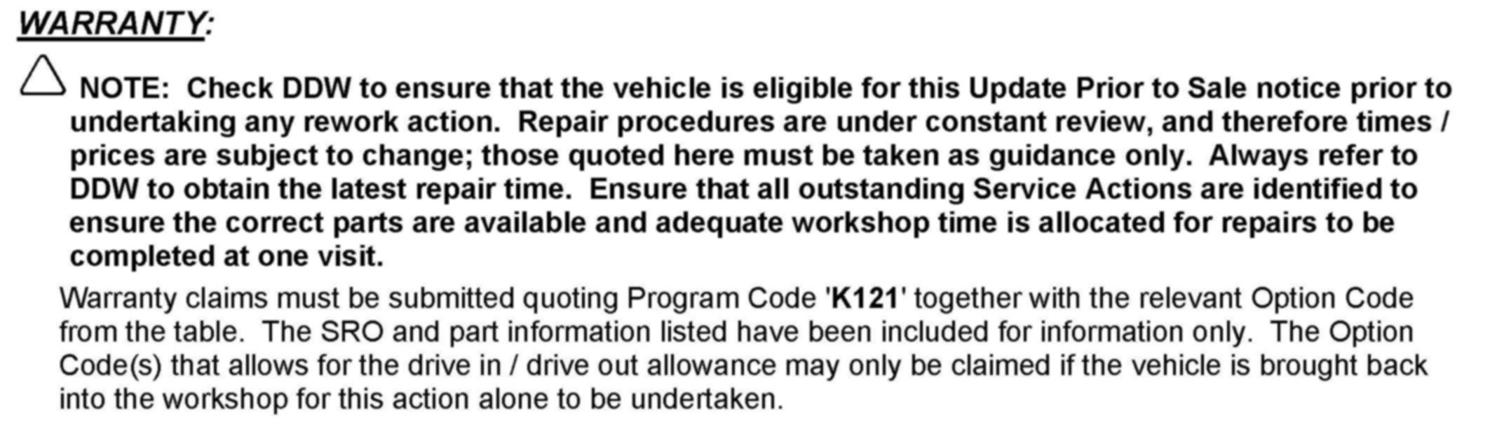 Dealers are required to HOLD the affected vehicles within your control and refrain from releasing the vehicles for new or used vehicle sale pending completion of the rework action detailed in this Technical Bulletin. For vehicles in dealer inventory, this UPS should be performed after the Pre-Delivery Inspection (PDI) has been completed and prior to final preparation / customer handover. For those vehicles already in the hands of customers, this should be done at the next available service visit.