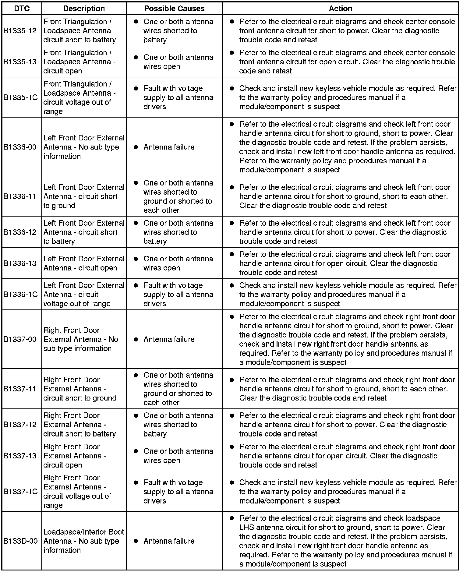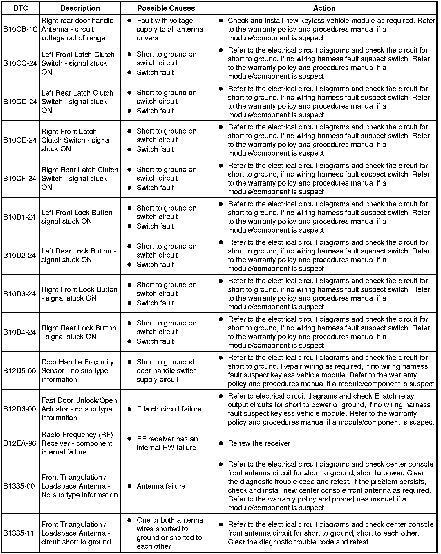 The table below lists all Diagnostic Trouble Codes (DTCs) that could be logged in the Remote Keyless Entry Module, for additional Diagnosis and Testing information refer to the relevant Diagnosis and Testing Section. For additional information, refer to Locks, Latches and Entry Systems Testing and Inspection