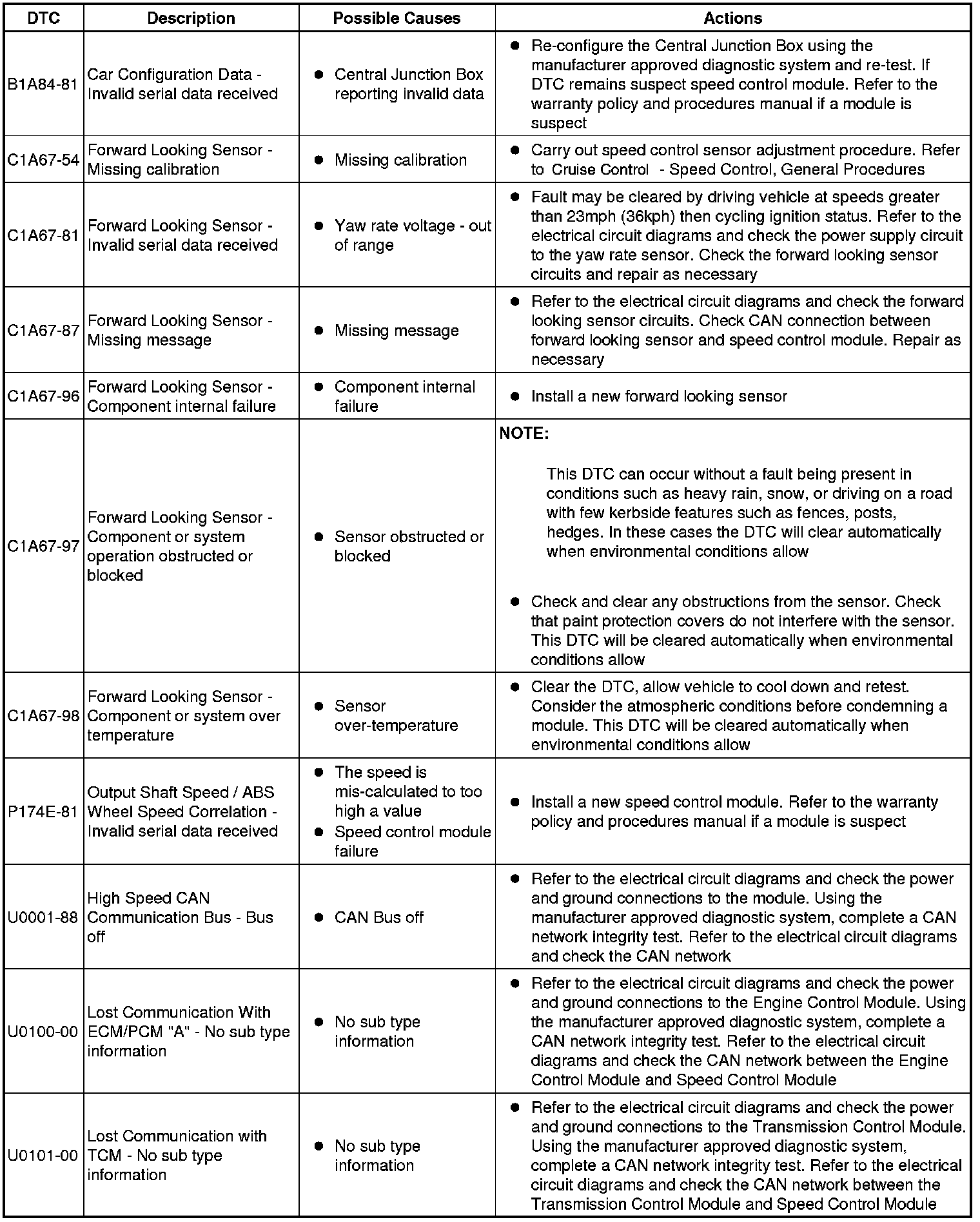 The table below lists all Diagnostic Trouble Codes (DTCs) that could be logged in the Speed Control Module, for additional Diagnosis and Testing information refer to the relevant Diagnosis and Testing Section. For additional information, refer to Speed Control
