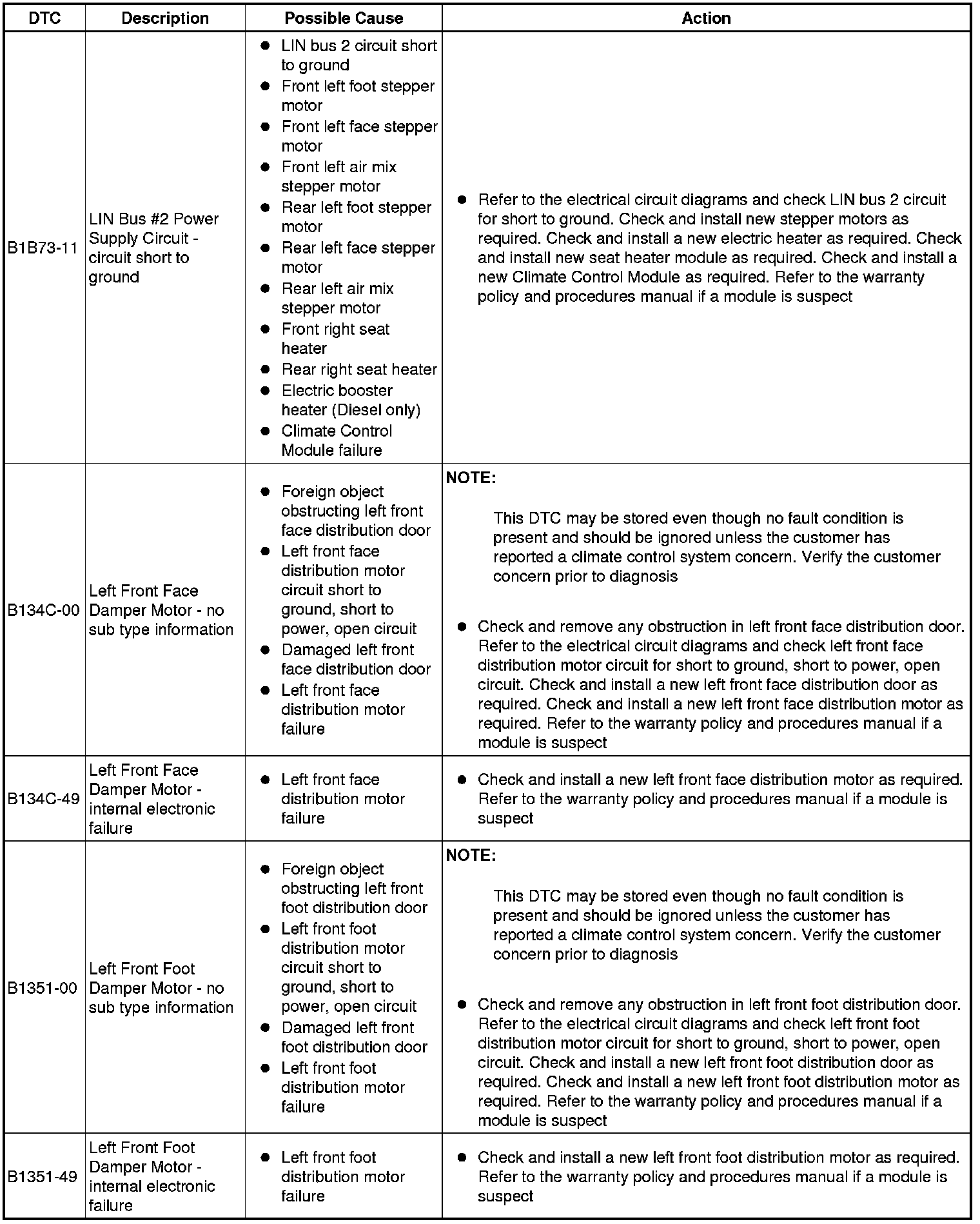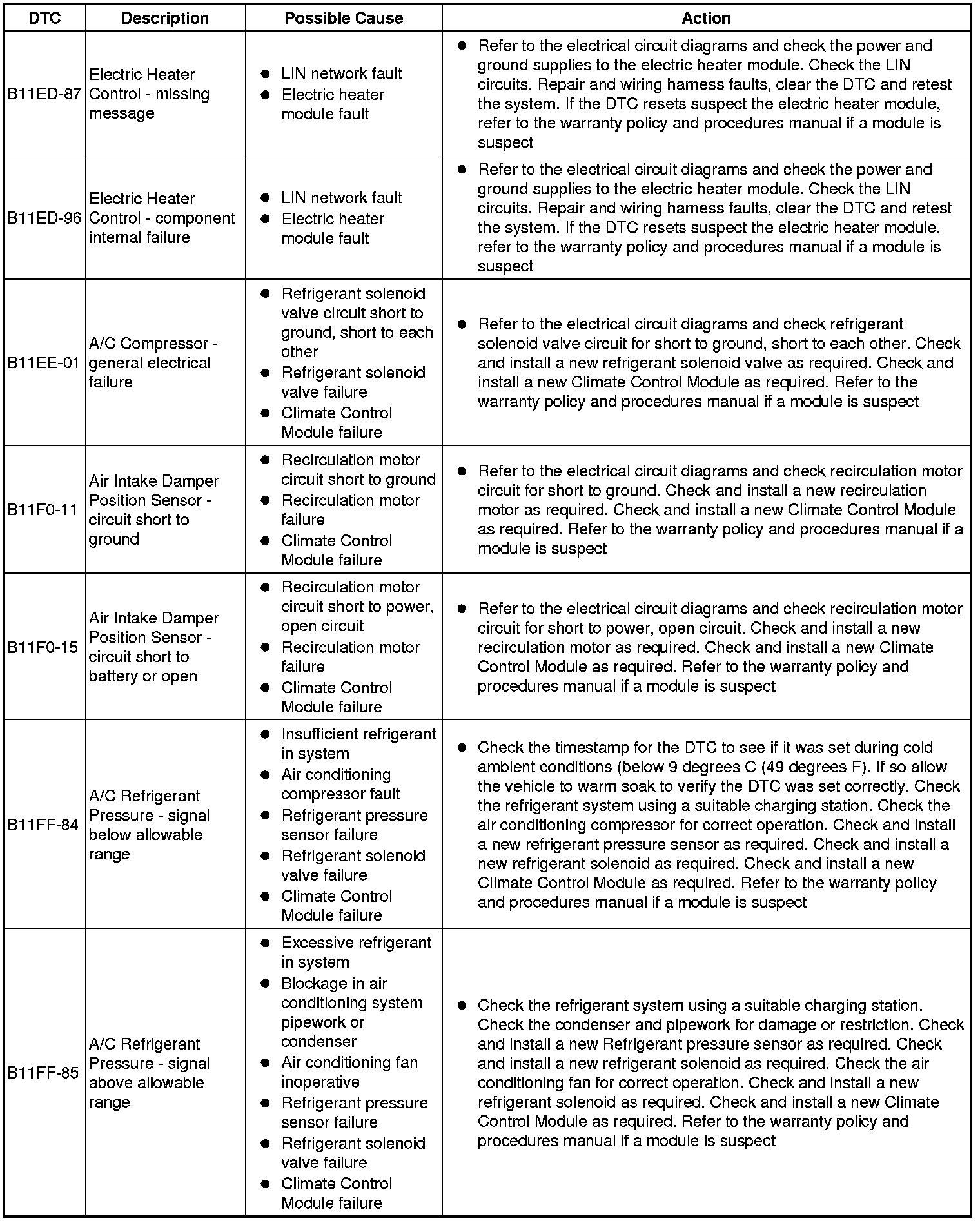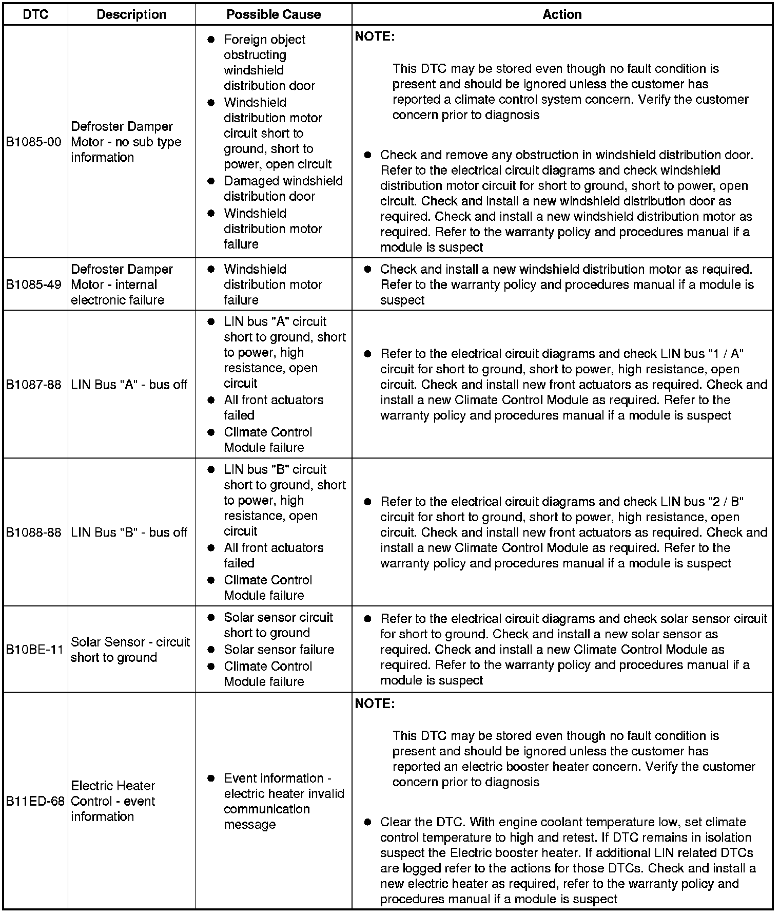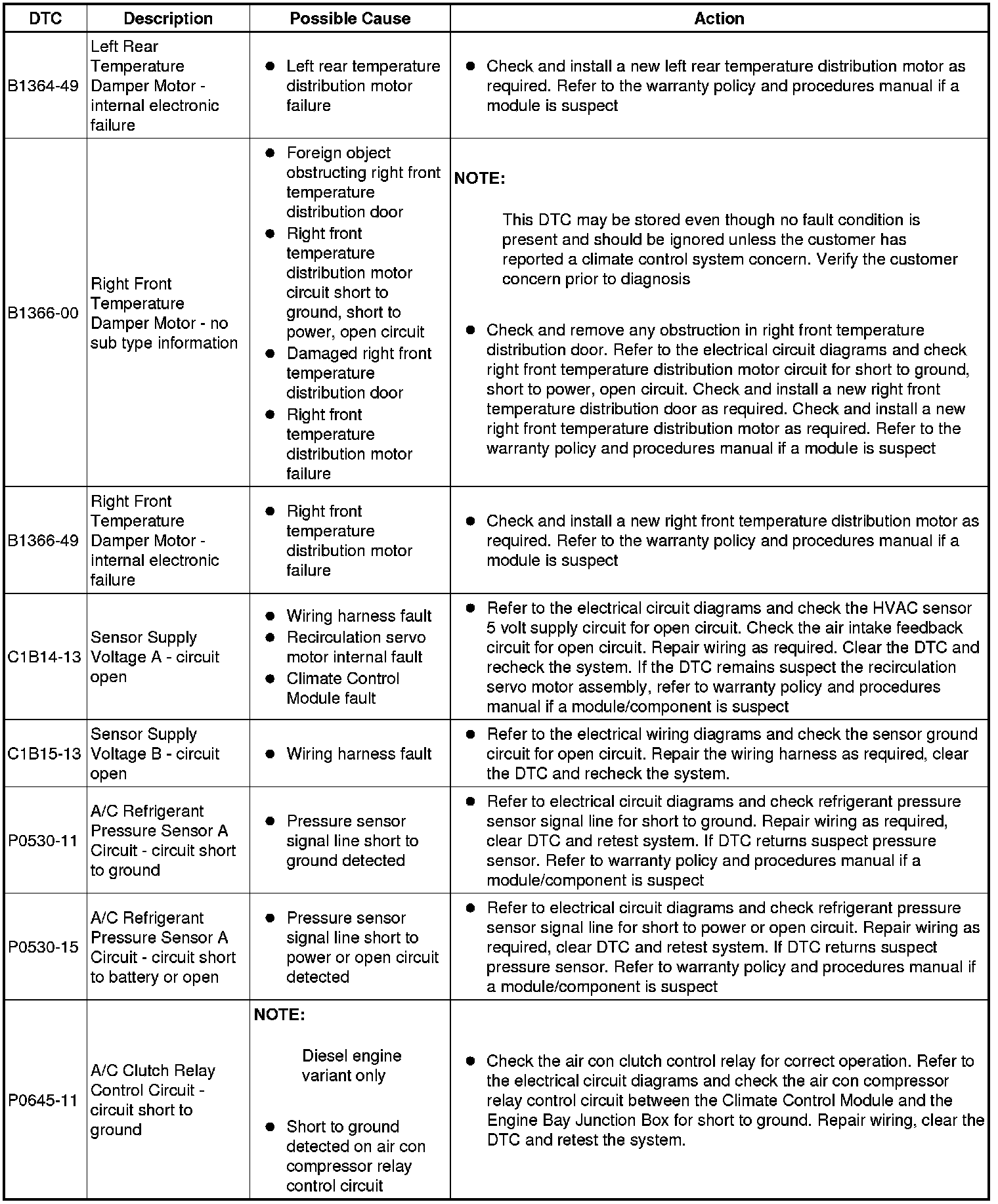 The table below lists all Diagnostic Trouble Codes (DTCs) that could be logged in the Climate Control Module, for additional Diagnosis and Testing information refer to the relevant Diagnosis and Testing Section. For additional information, refer to Climate Control System Initial Inspection and Diagnostic Overview