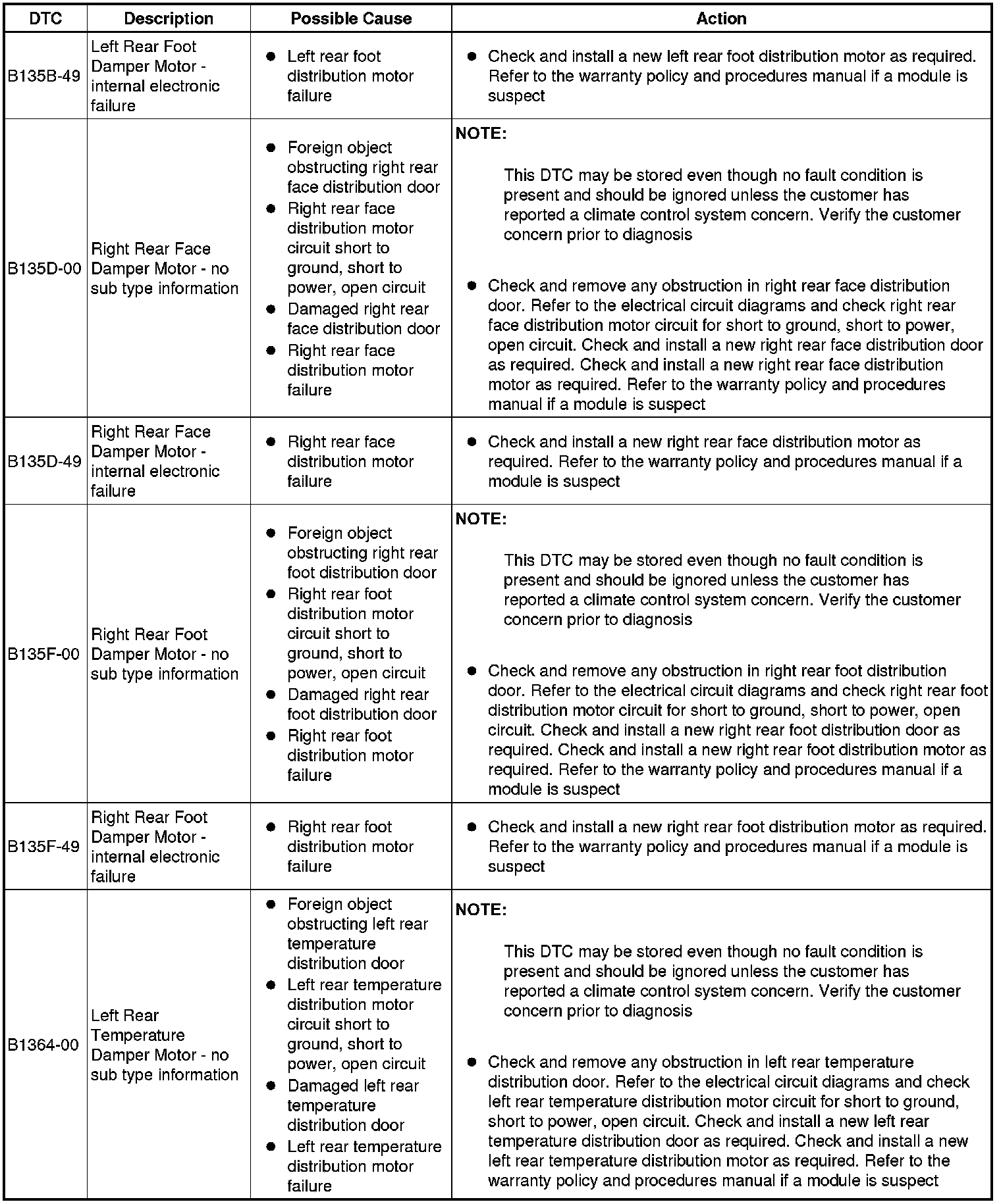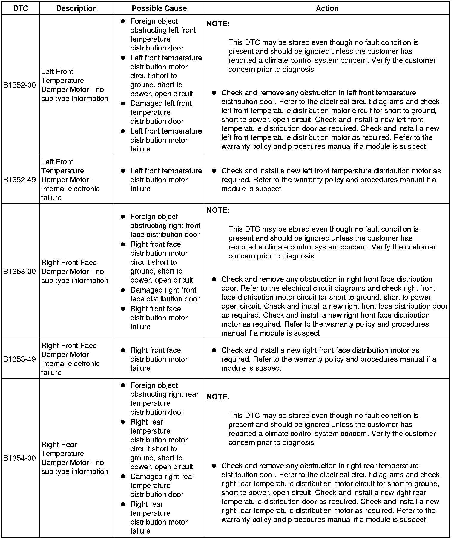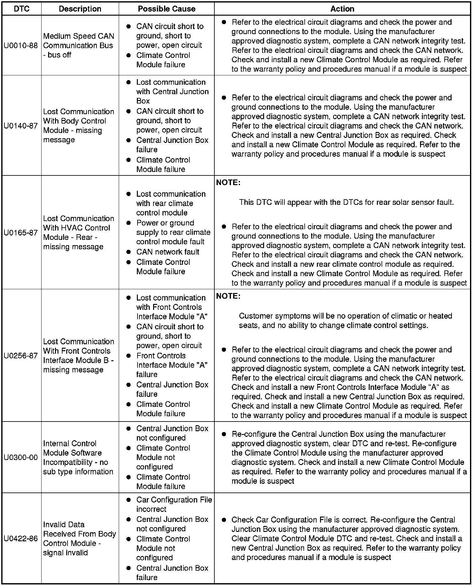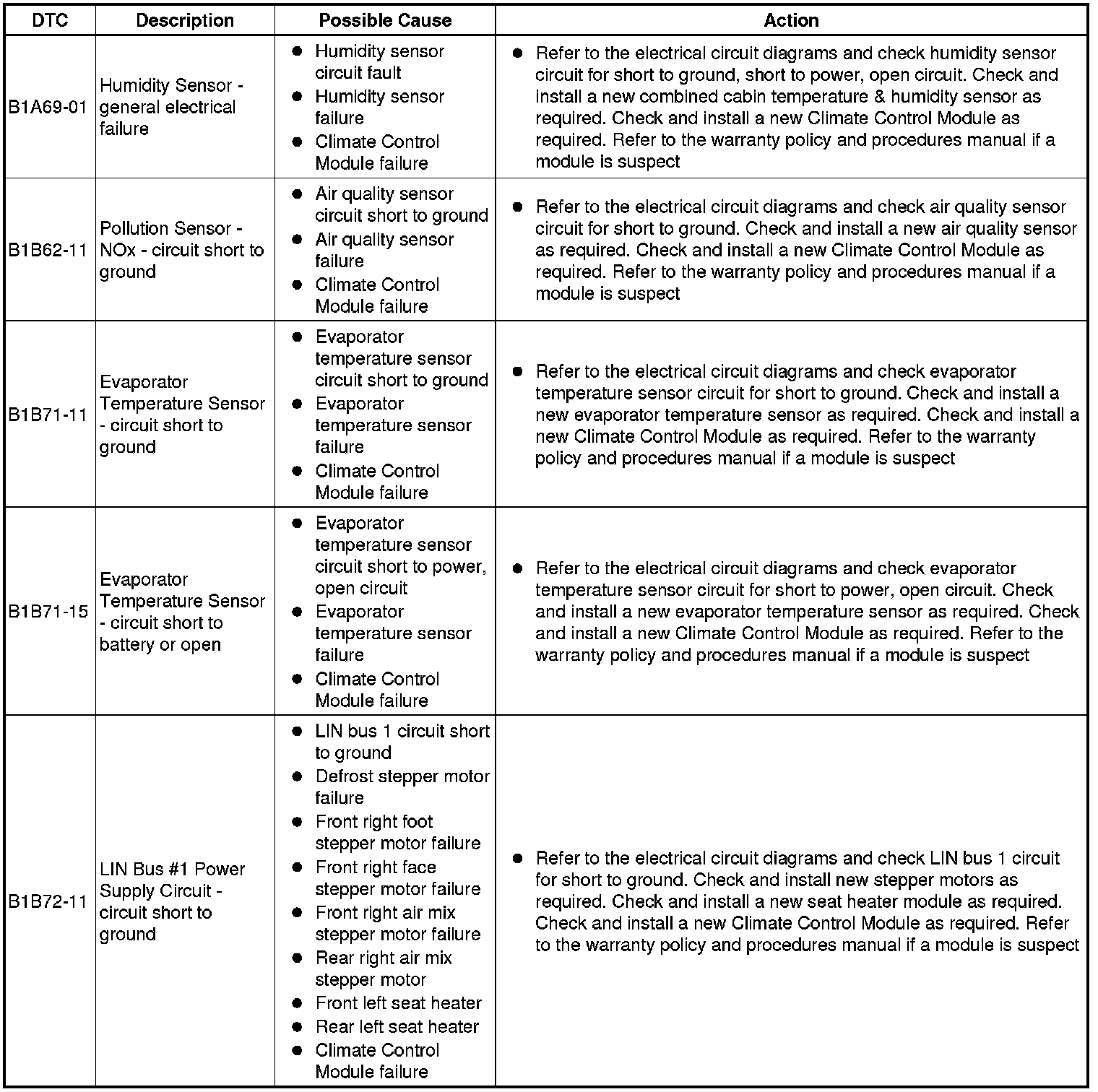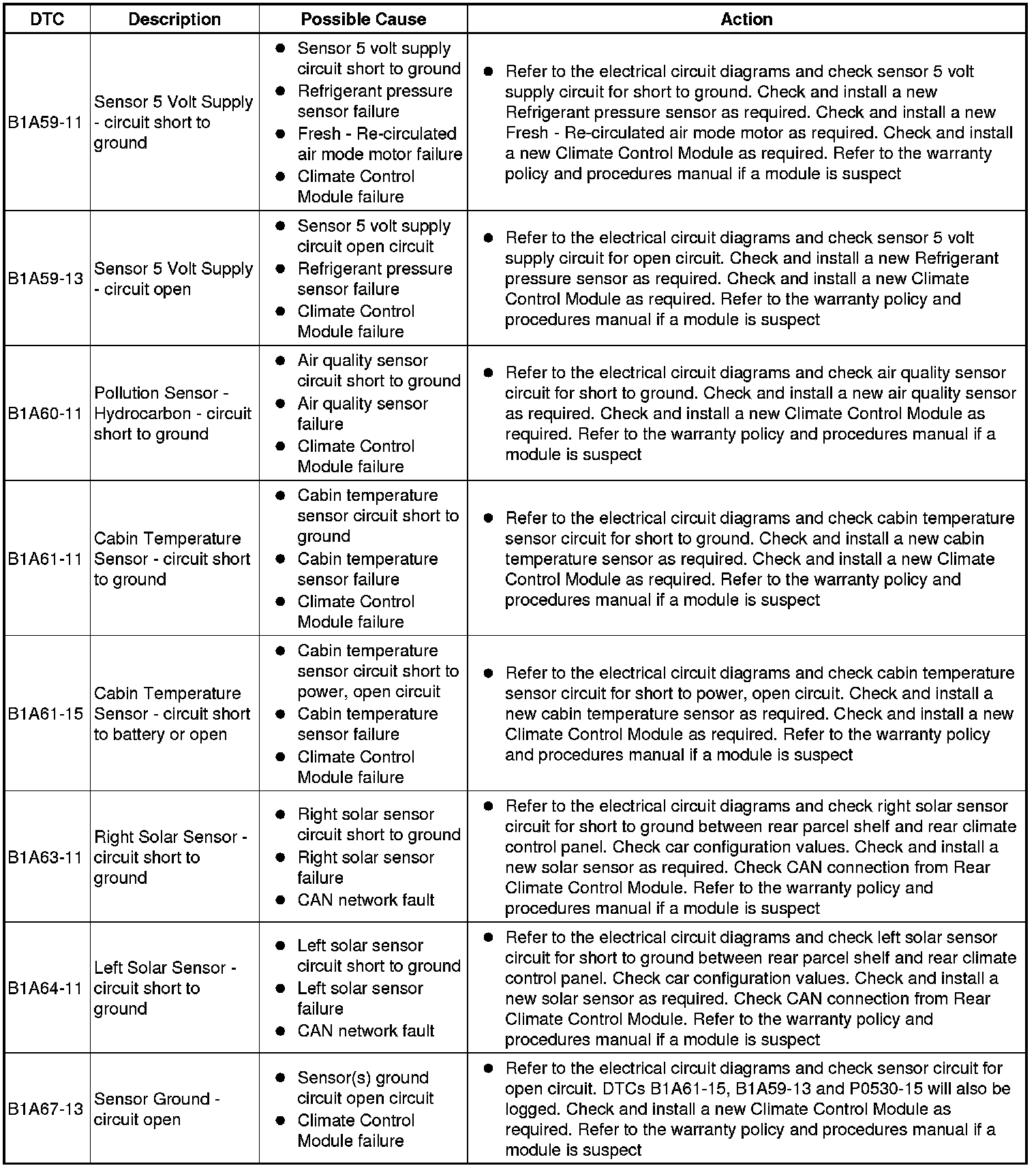 The table below lists all Diagnostic Trouble Codes (DTCs) that could be logged in the Climate Control Module, for additional Diagnosis and Testing information refer to the relevant Diagnosis and Testing Section. For additional information, refer to Climate Control System Initial Inspection and Diagnostic Overview