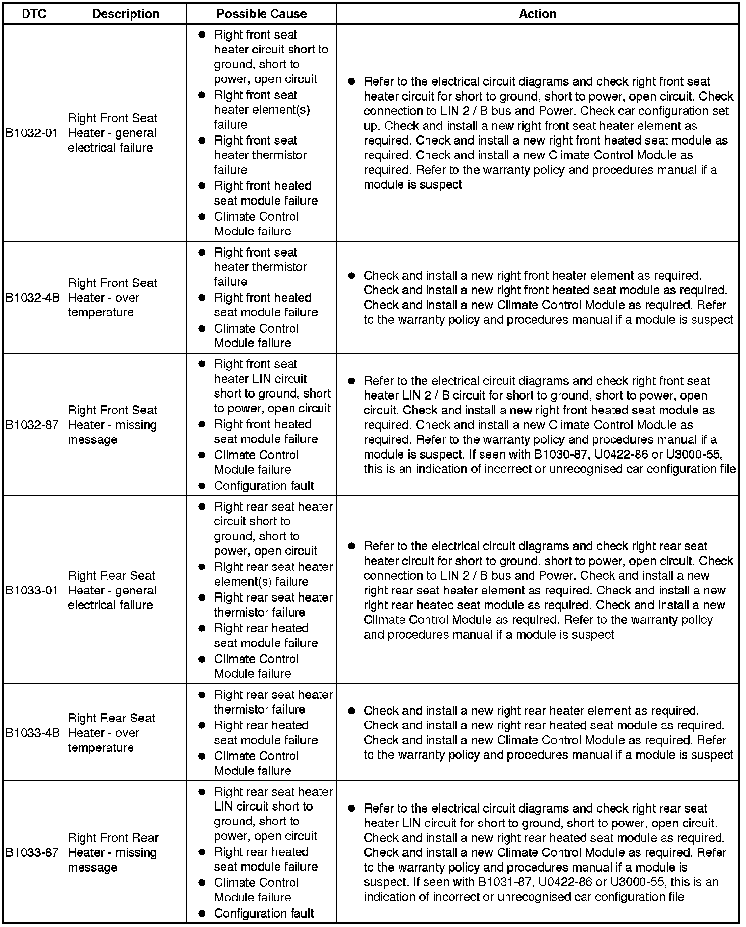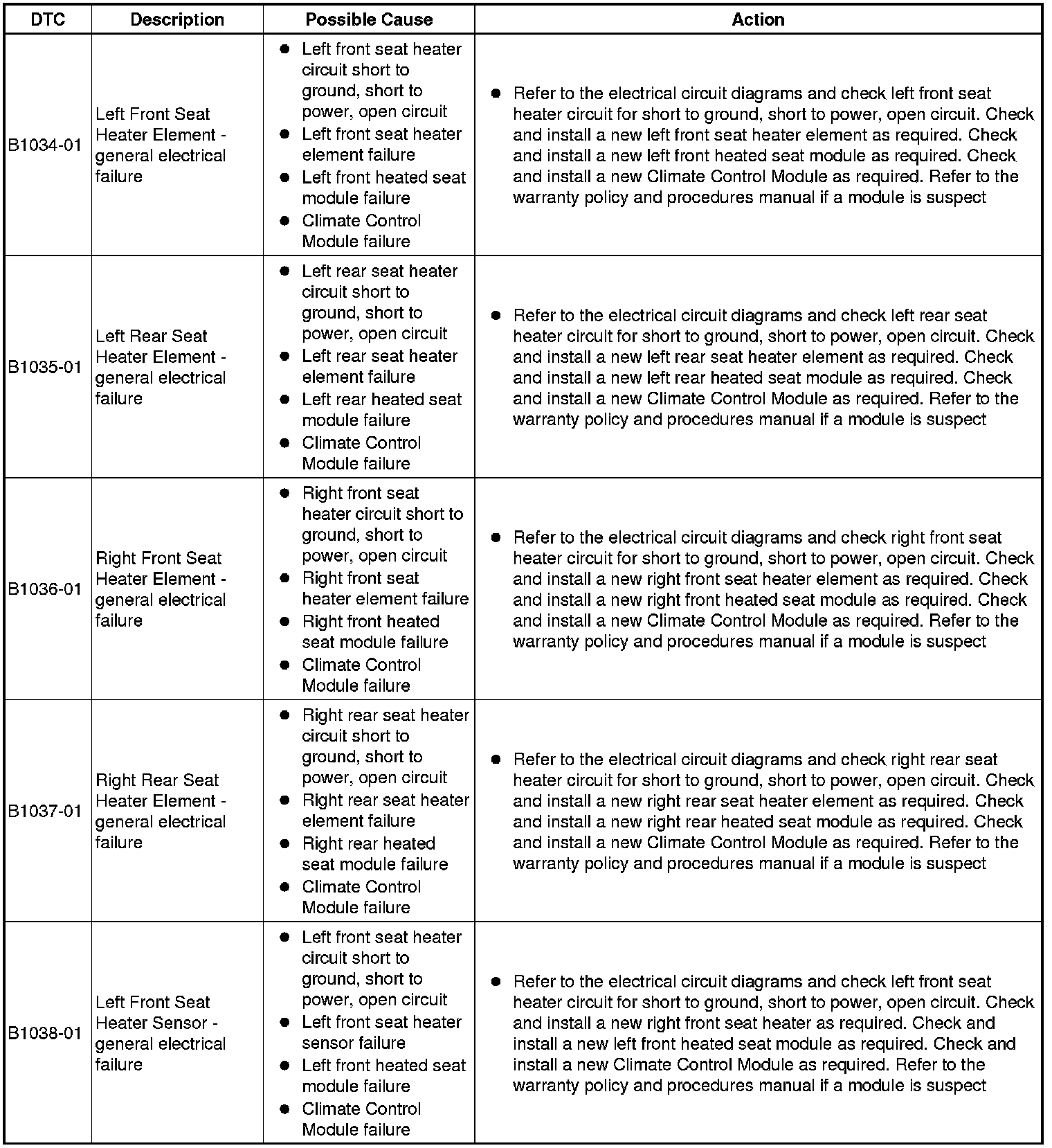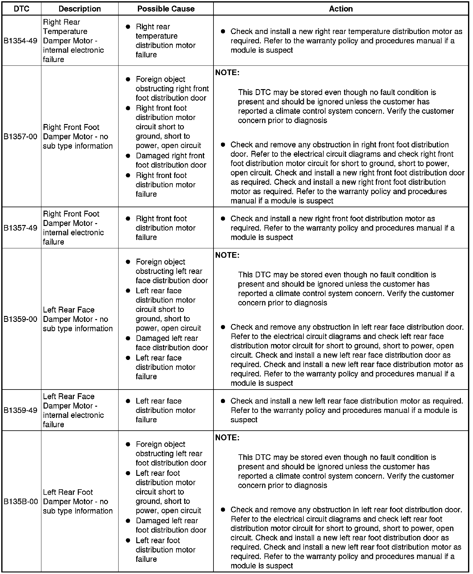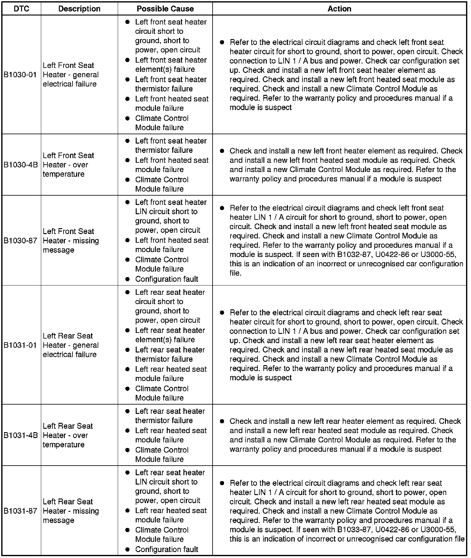 The table below lists all Diagnostic Trouble Codes (DTCs) that could be logged in the Climate Control Module, for additional Diagnosis and Testing information refer to the relevant Diagnosis and Testing Section. For additional information, refer to Climate Control System Initial Inspection and Diagnostic Overview
