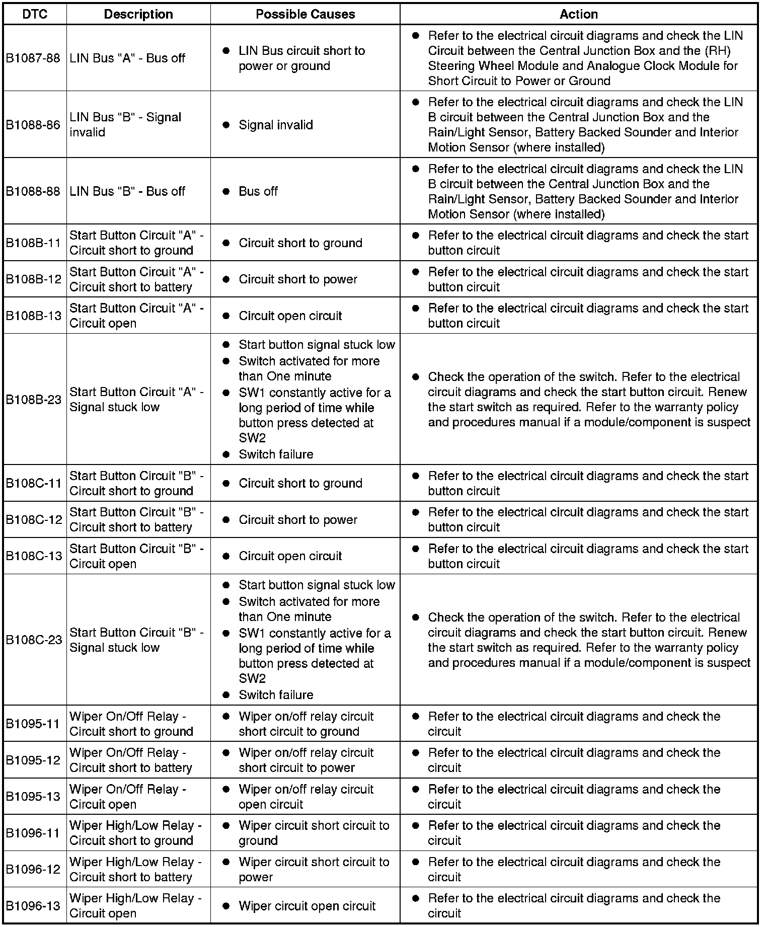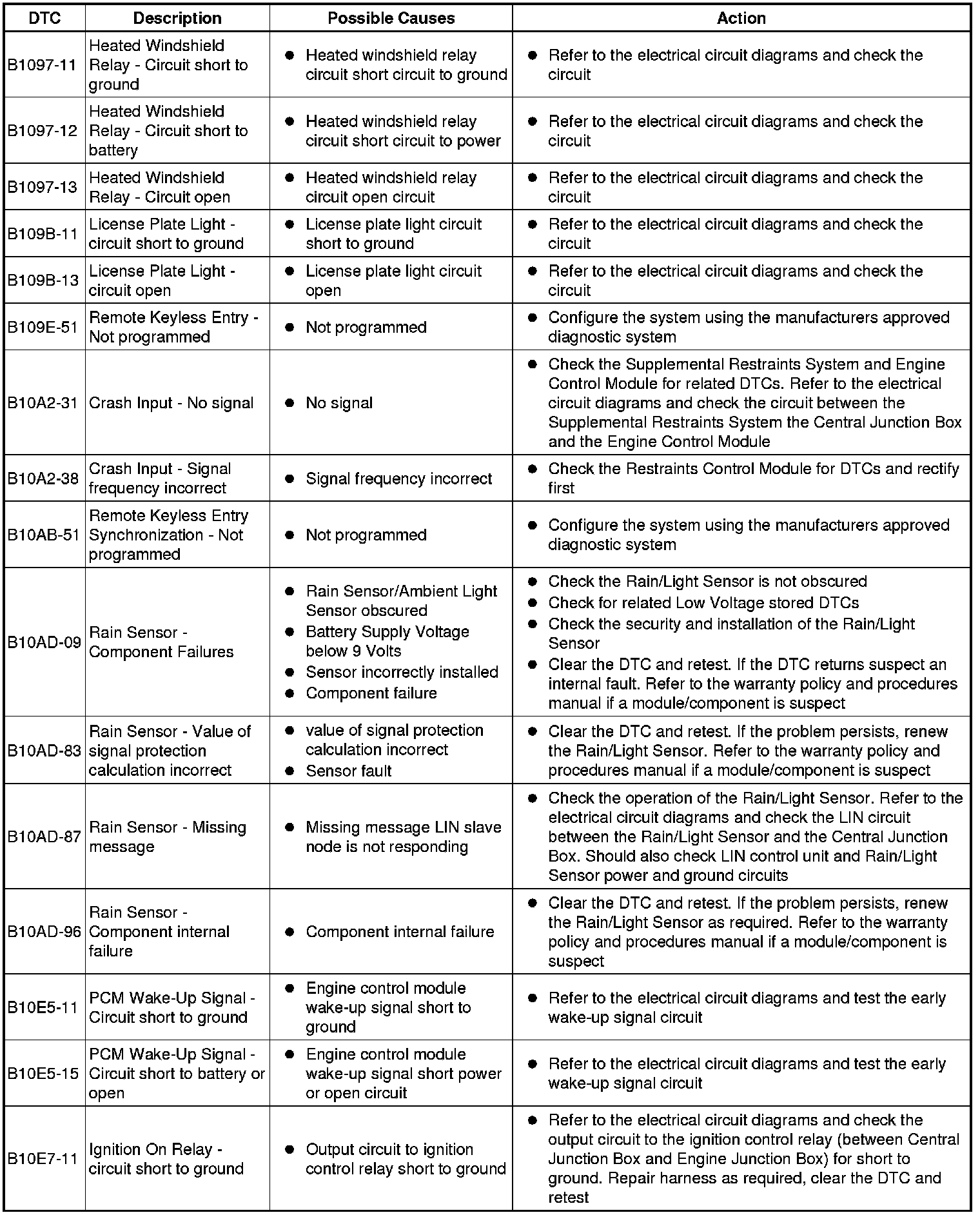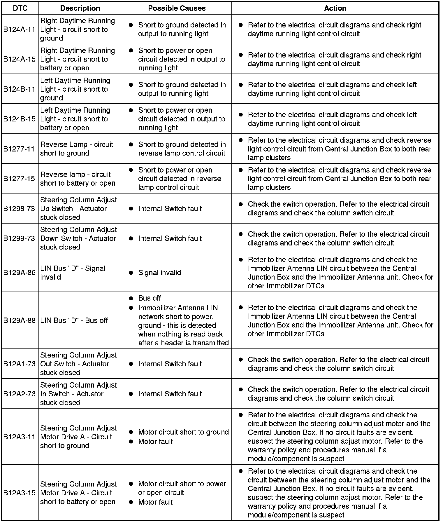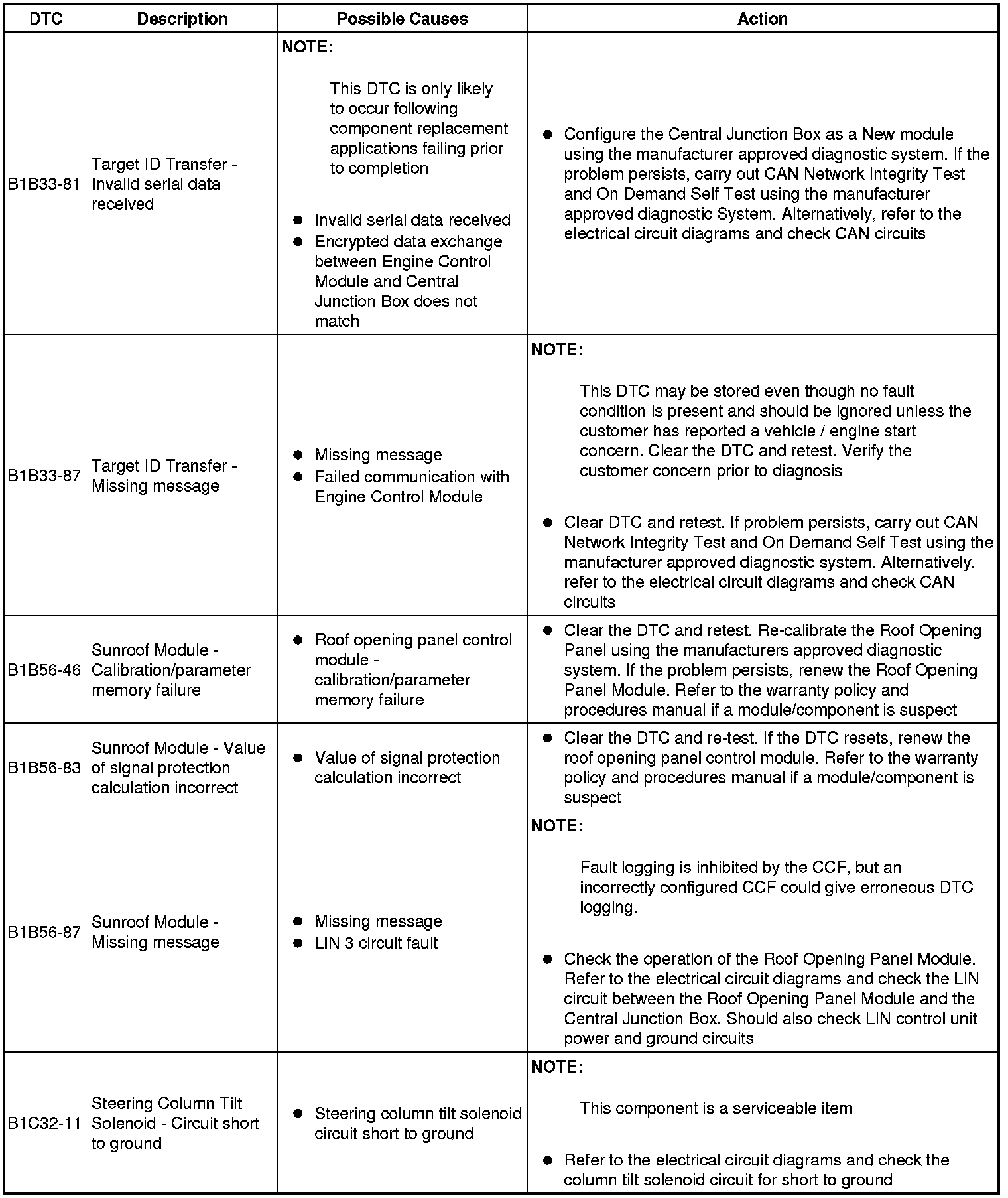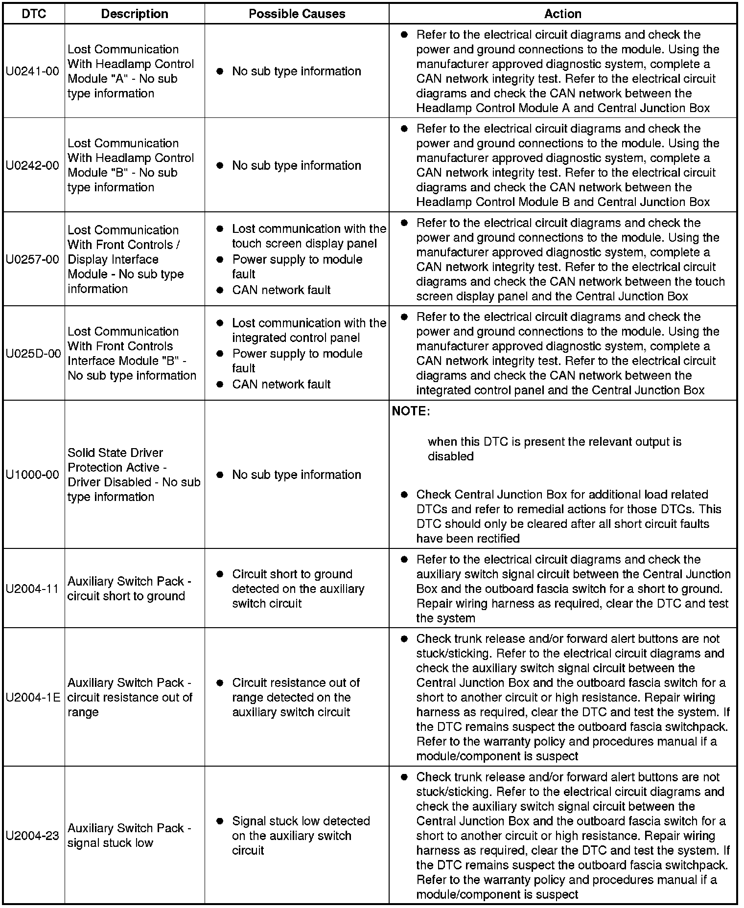 The table below lists all Diagnostic Trouble Codes (DTCs) that could be logged in the Central Junction Box, for additional Diagnosis and Testing information refer to the relevant Diagnosis and Testing Section. For additional information, refer to Communications Network Testing and Inspection