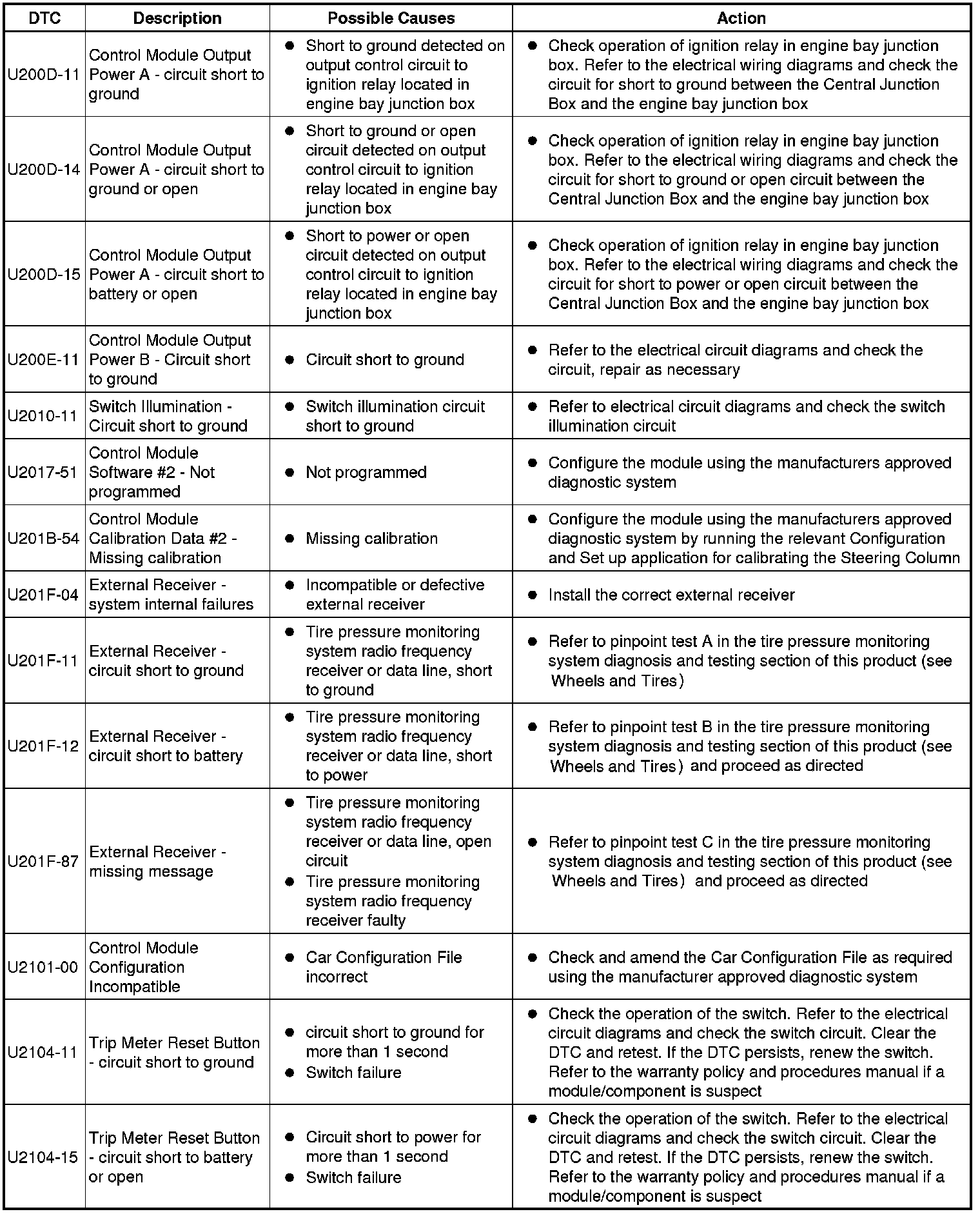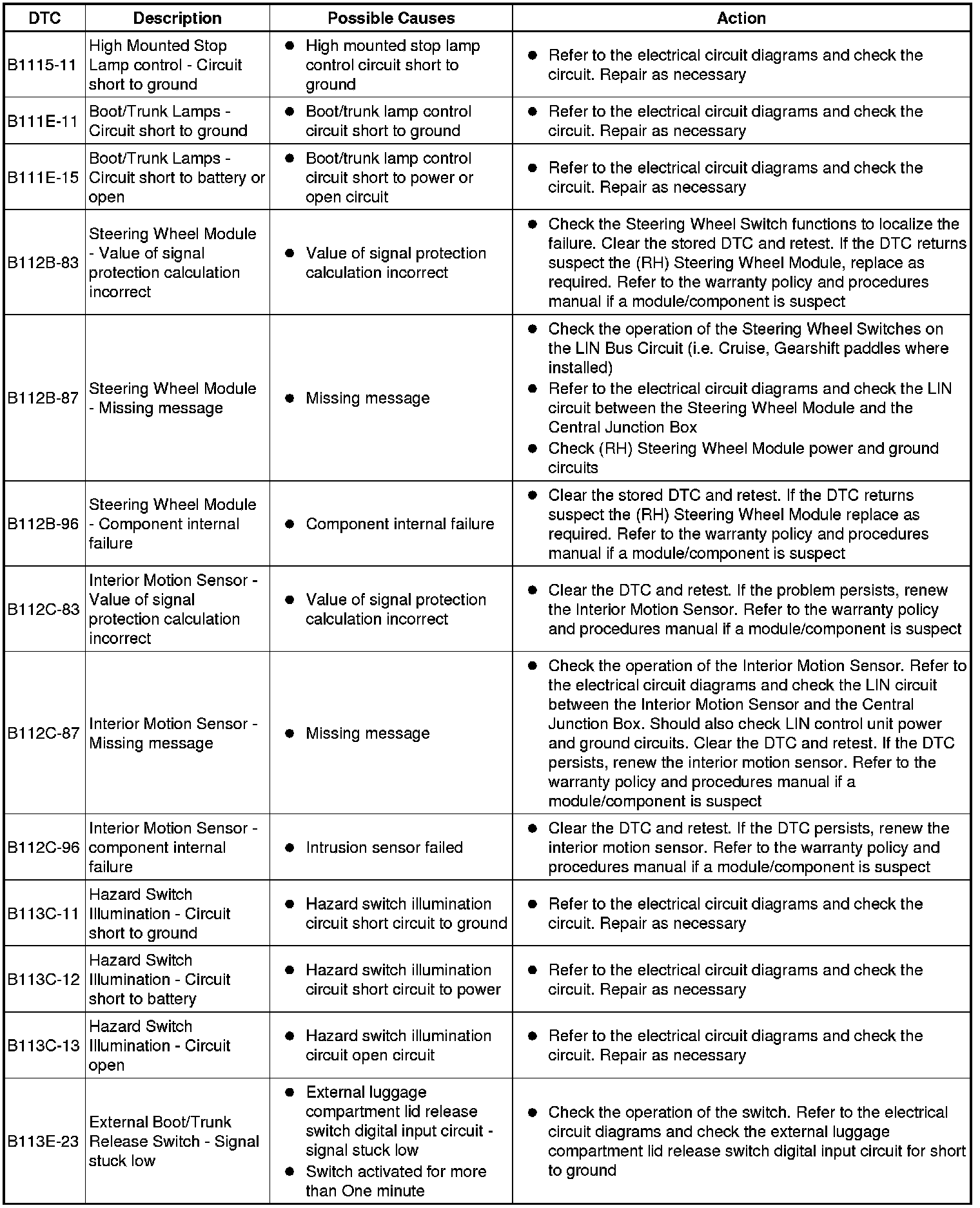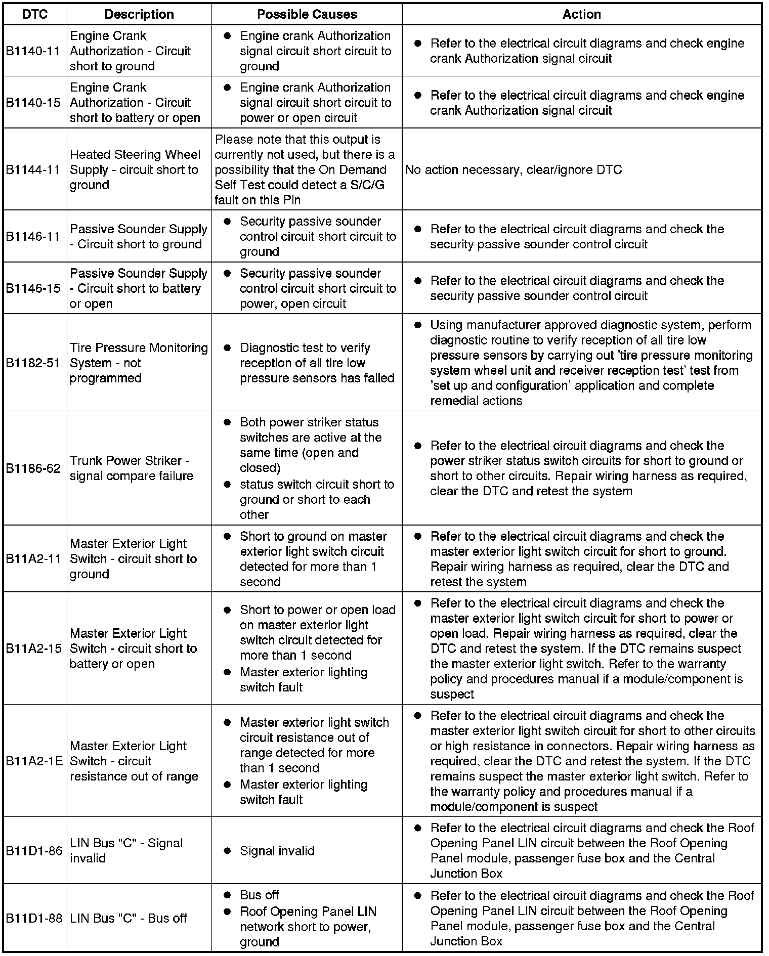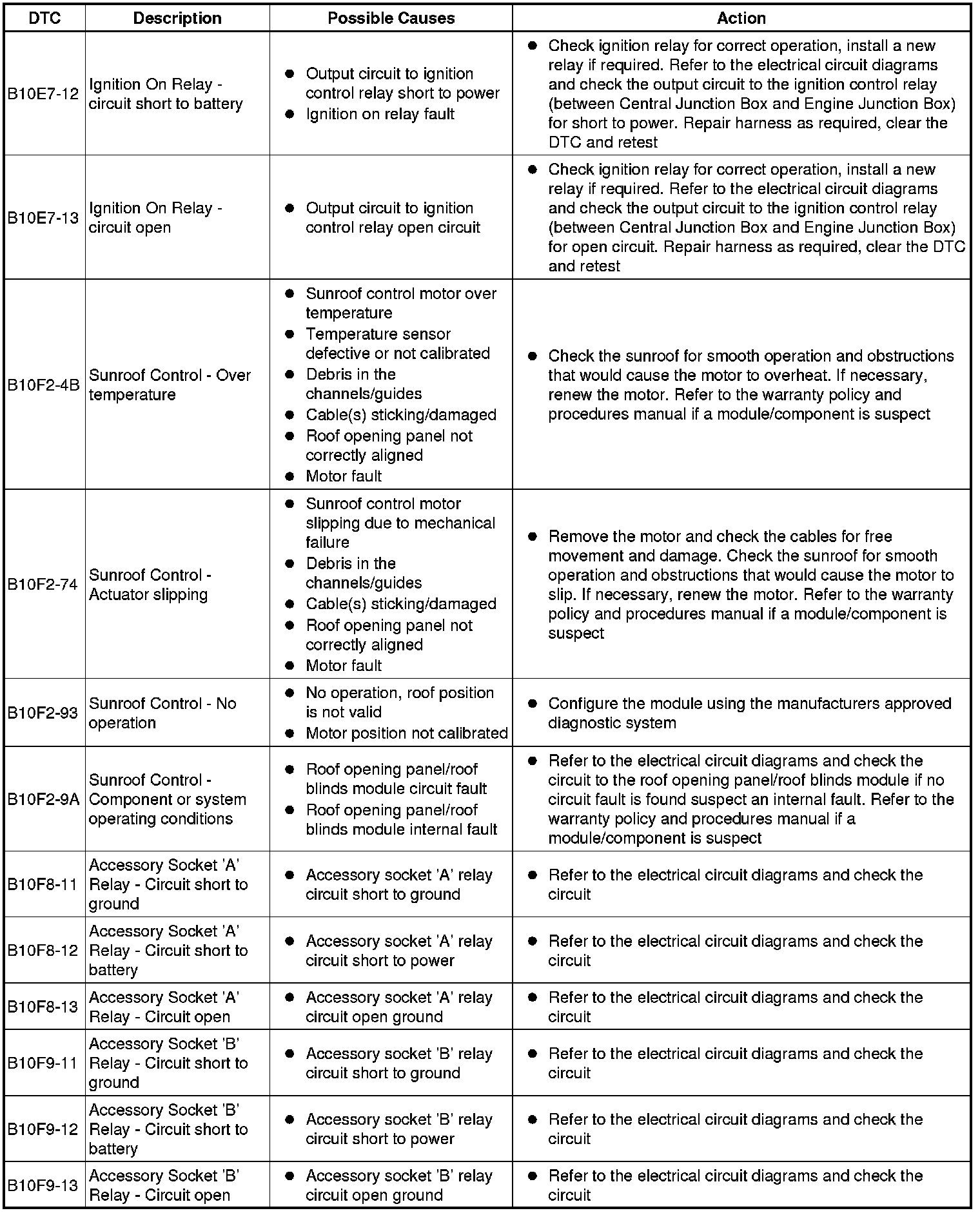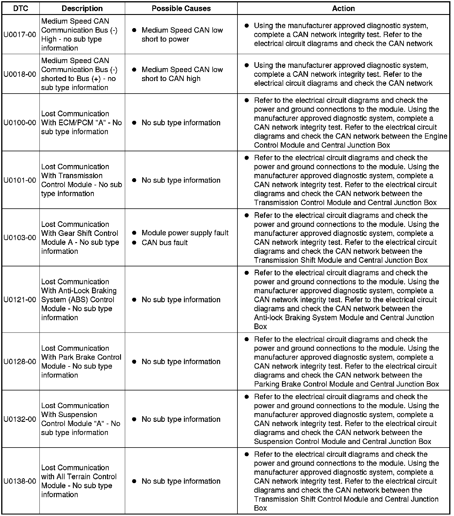 The table below lists all Diagnostic Trouble Codes (DTCs) that could be logged in the Central Junction Box, for additional Diagnosis and Testing information refer to the relevant Diagnosis and Testing Section. For additional information, refer to Communications Network Testing and Inspection