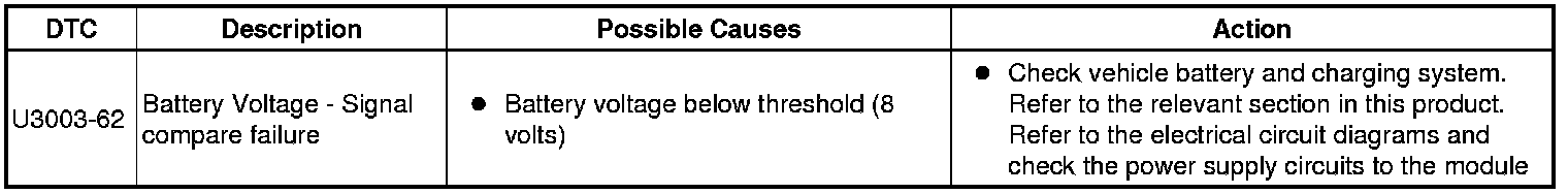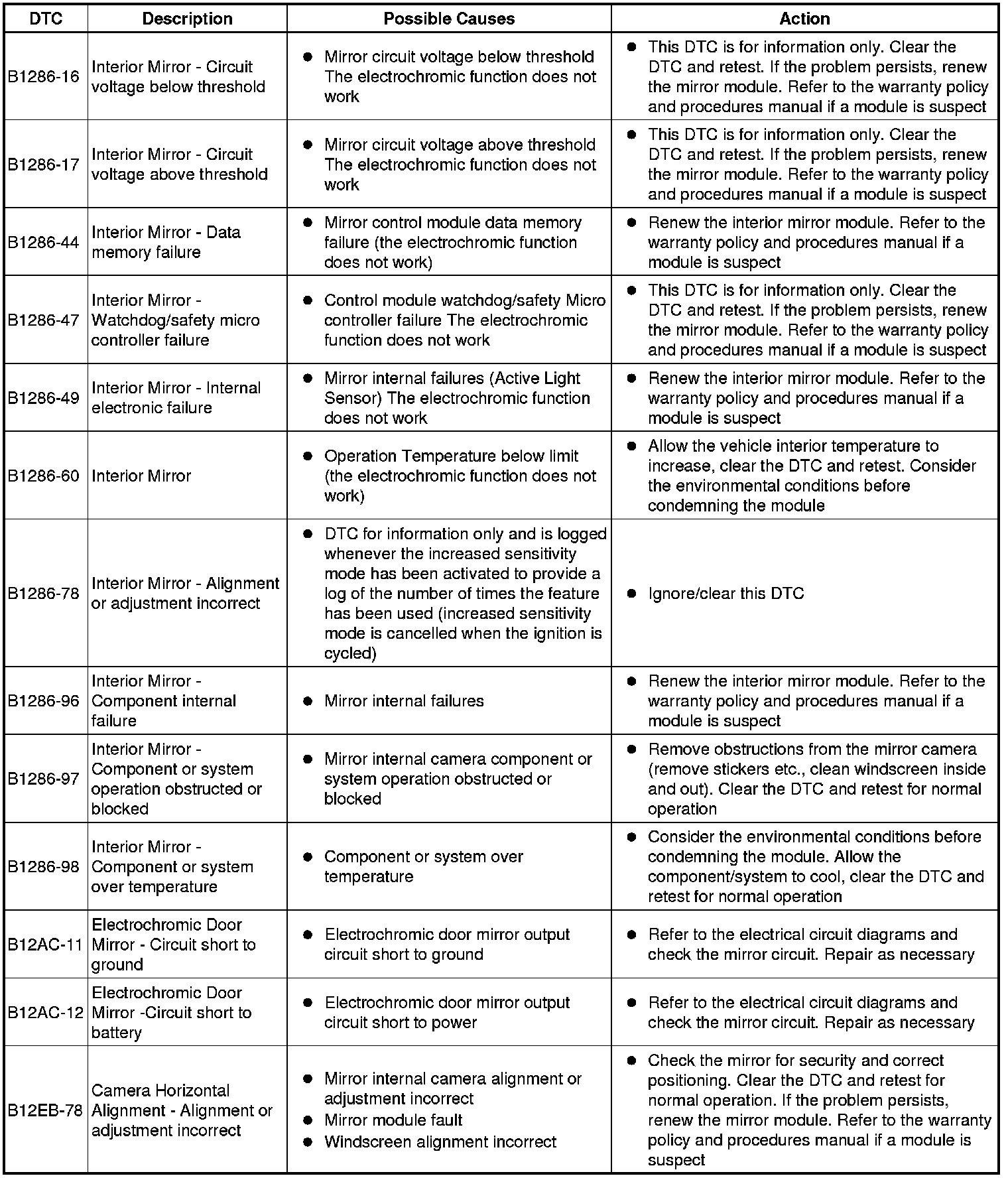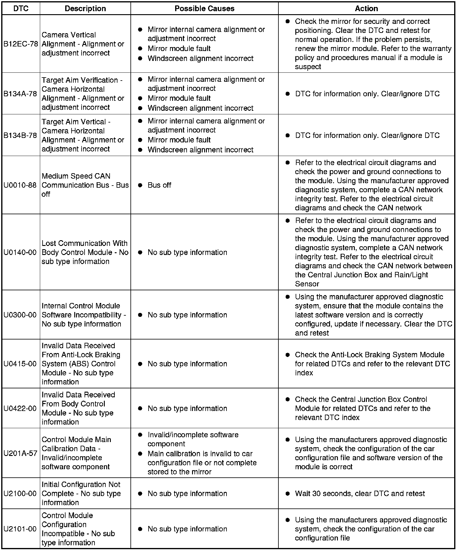 The table below lists all Diagnostic Trouble Codes (DTCs) that could be logged in the Headlamp Control Module B, for additional Diagnosis and Testing information refer to the relevant Diagnosis and Testing Section. For additional information, refer to Headlamps Testing and Inspection