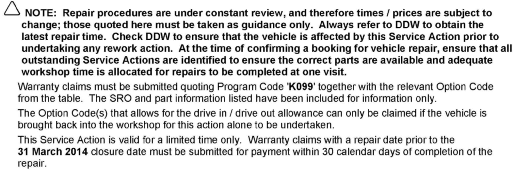 Retailers are required to 'HOLD' all affected vehicles within their control and refrain from releasing the vehicles for onward distribution and sale pending completion of the rework actions detailed in this bulletin. Affected vehicles in the hands of owners should be repaired at the next available opportunity. At the time of customer appointment, ensure that all outstanding service campaigns for each individual vehicle are identified and allocate sufficient time and resources to complete all campaigns. Refer to the Repair Procedure outlined below.