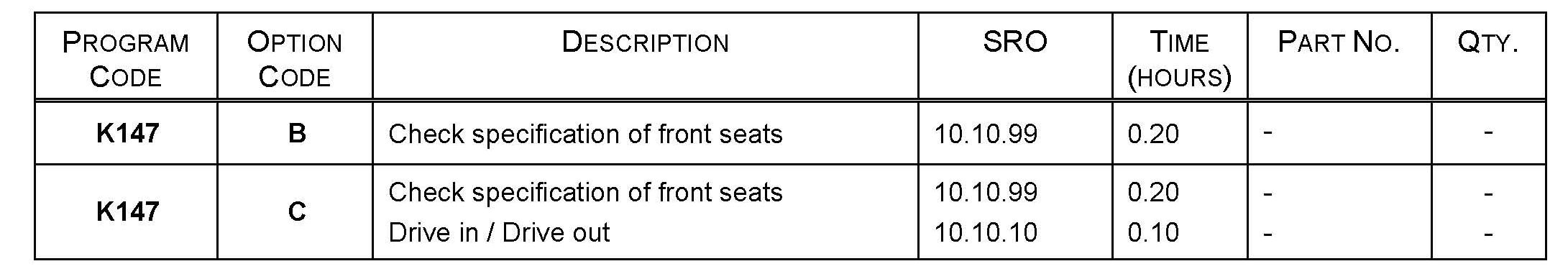 Warranty claims must be submitted quoting Program Code 'K147' together with the relevant Option Code from the table. The SRO and part information listed have been included for information only. The Option Code(s) that allows for the drive in / drive out allowance can only be claimed if the vehicle is brought back into the workshop for this action alone to be undertaken.