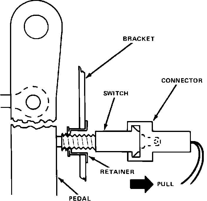 The stop light switch is retained in its mounting bracket by a spring clip which engages the threaded portion of the switch housing. To remove the stop light switch, pull switch straight out of the mounting bracket and retainer.