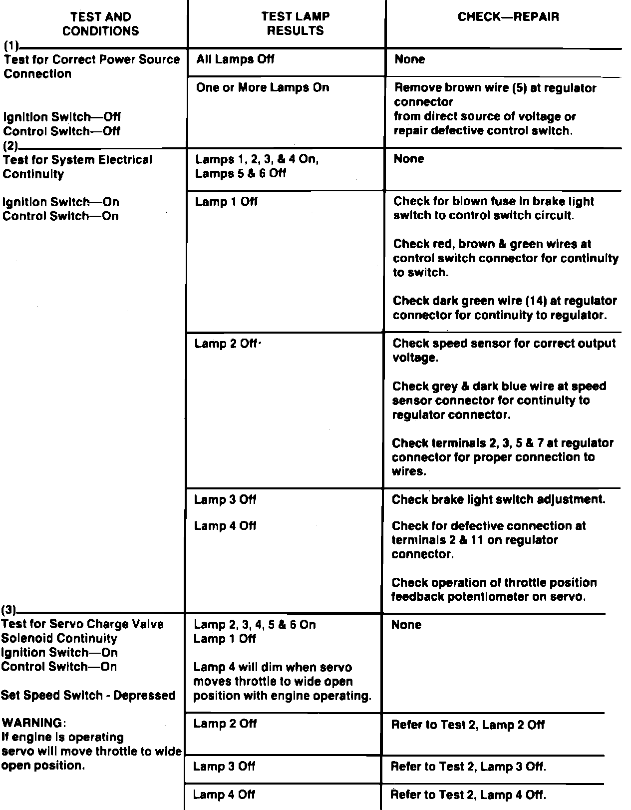 Whenever a Cruise Command malfunction occurs, first ensure that the wiring harness is properly connected to the regulator. A poor connection can cause a complete or intermittent system malfunction, resulting in a non-testable flaw, or a misdiagnosed regulator malfunction. Refer to figure above for wiring diagrams and troubleshooting procedures.