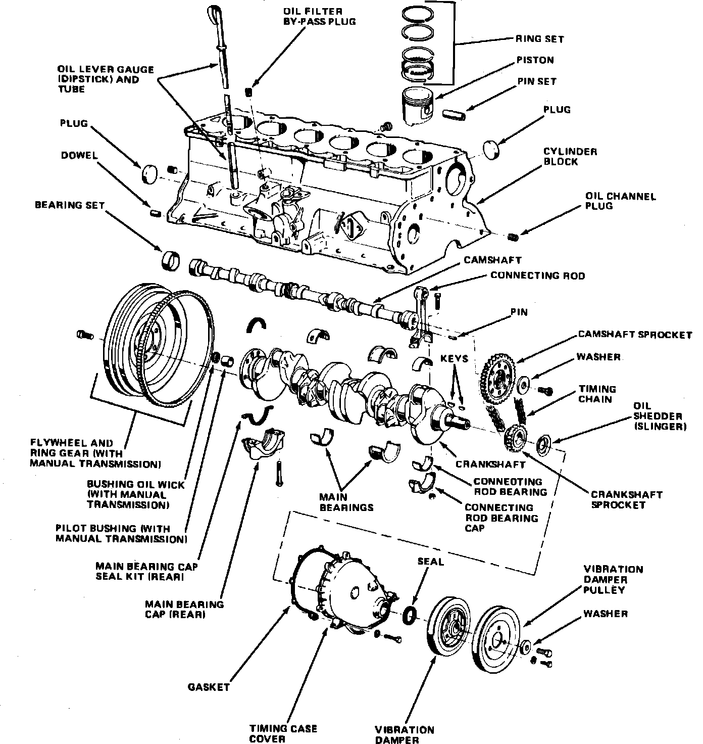 11. Remove cylinder head bolts, cylinder head and gasket. On some engines, cylinder head bolts installed on the spark plug (left) side of the engine were improperly hardened and may break under the bolt head or in the thread area. Whenever a broken bolt is found, all bolts on the spark plug side of the engine should be replaced. Engines included are code Nos. 310C06 through 310C14. The engine code is stamped on a machined surface on the distributor side of the engine.