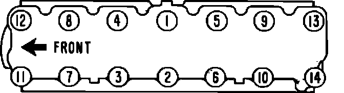 13. Ensure that gasket is properly seated on block, install cylinder head and head bolts, and torque bolts to specifications in sequence shown in Fig. 3. Apply suitable sealer to threads of left front head bolt (11), prior to installation.