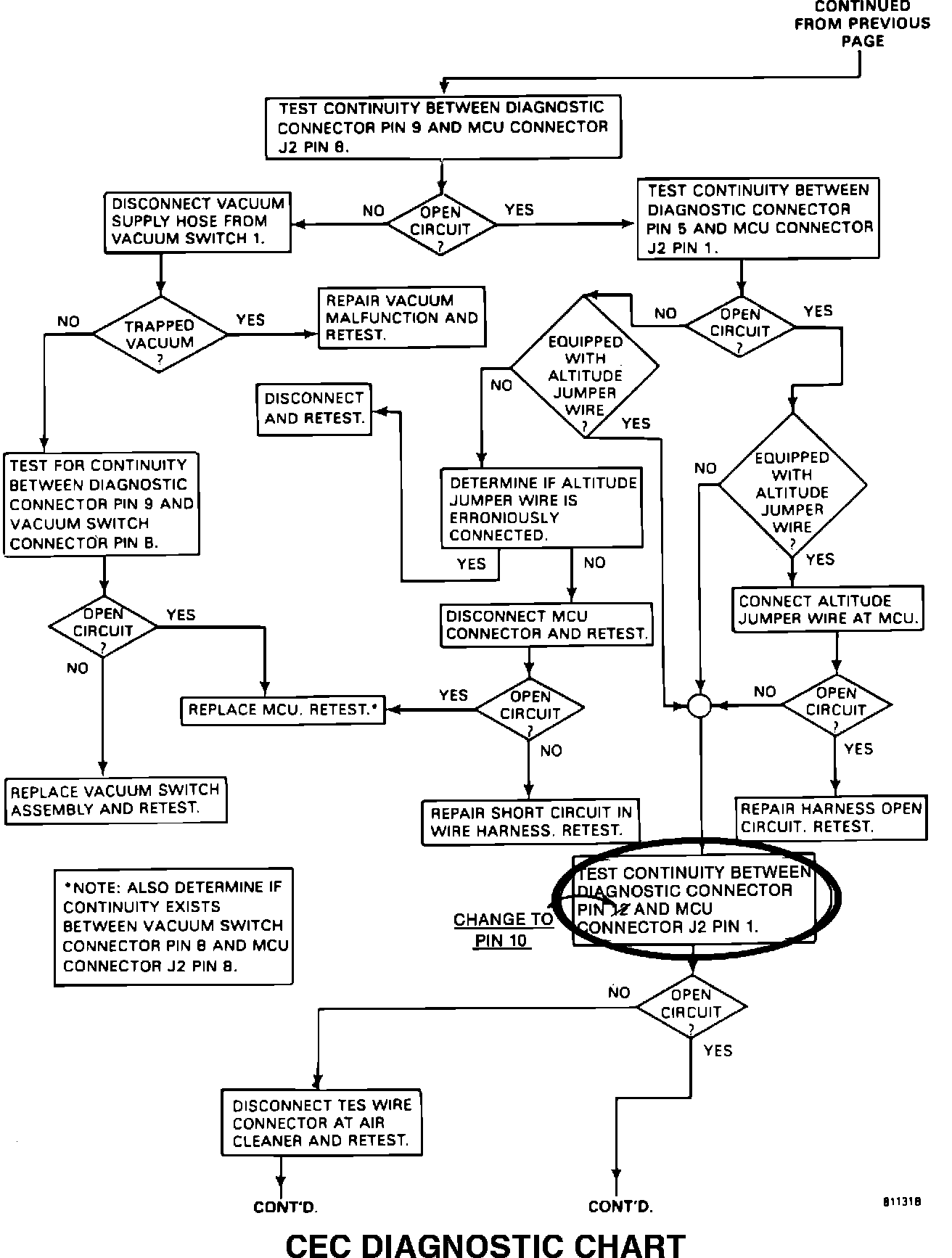 The CEC system diagnostic chart needs to be revised. This chart is found on page 77 of Supplement No. 1 to the 1982 Jeep Technical Service Manual. Please revise the indicated chart box by changing the diagnostic connector pin number from pin 12 to pin 10 as shown on the sample page.