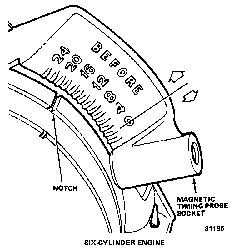 A graduated timing degree scale located on the timing case cover is used for timing each ignition system. An index notch milled into the vibration damper is used to reference the No. 1 cylinder ignition position of the crankshaft with the correct timing mark on the graduated scale.