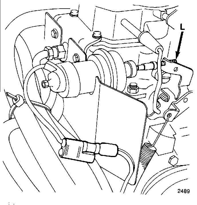9. With the Sole-Vac throttle positioner fully extended, turn the vacuum actuator adjustment screw (L) on the throttle lever until the specified engine rpm is obtained. Refer to the Vehicle Emission Control Information label.