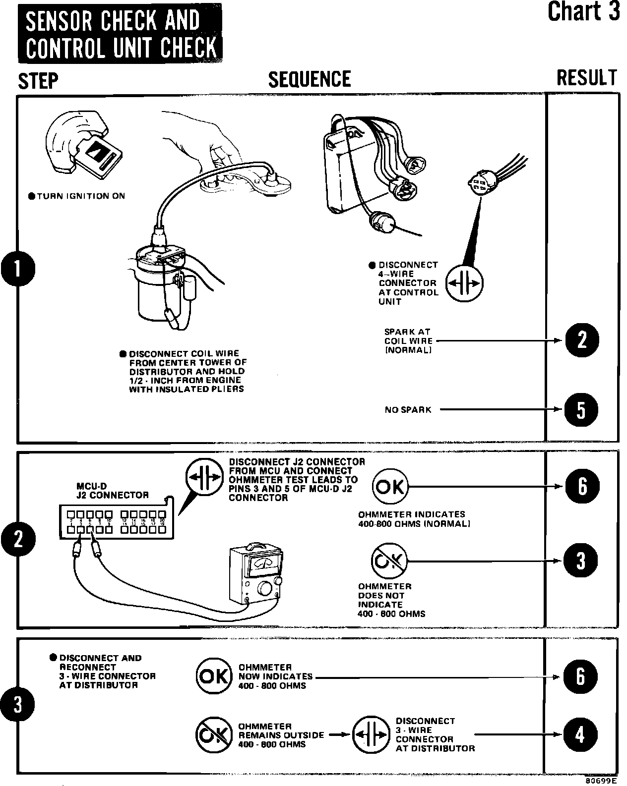 The Sensor Check and Control Unit Check diagnostic procedure, on pages 42 and 43 of Supplement No. 1 to the 1982 AMC Technical Service Manual, are incorrect. Steps 2, 4 and 6 of this procedure have been revised to show the correct ohmmeter and voltmeter test probe test points required with the engine compartment wire harness connectors used in 1983 models.