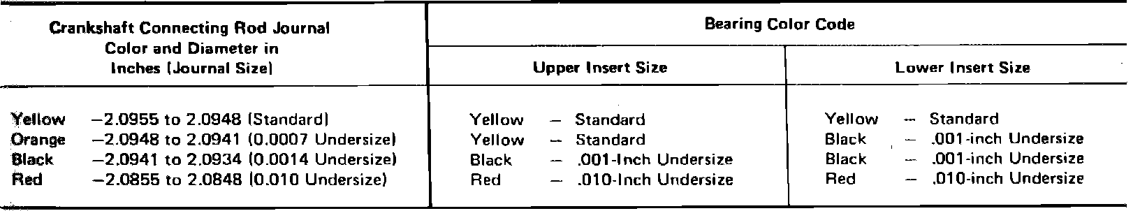 The connecting rod journal is identified by a color coded paint mark on adjacent cheek or counterweight toward flanged (rear) end of crankshaft. Color codes used to indicate journal sizes and corresponding bearing sizes are listed in Fig. 17.