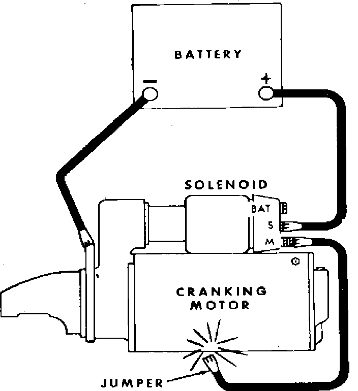 Pinion clearance should be checked after the motor has been disassembled and reassembled. To check, disconnect motor field coil connector from solenoid terminal and insulate end. Connect one battery lead to solenoid switch terminal and the other lead to the solenoid frame. Using a jumper lead connected to the solenoid motor terminal, momentarily flash the lead to the solenoid frame. This will shift the pinion into the cranking position until the battery is disconnected.