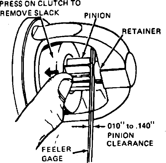 After energizing the solenoid with the clutch shifted toward the pinion stop retainer, push the pinion back toward the commutator end as far as possible to take up any slack movement; then check the clearance with feeler gauge.