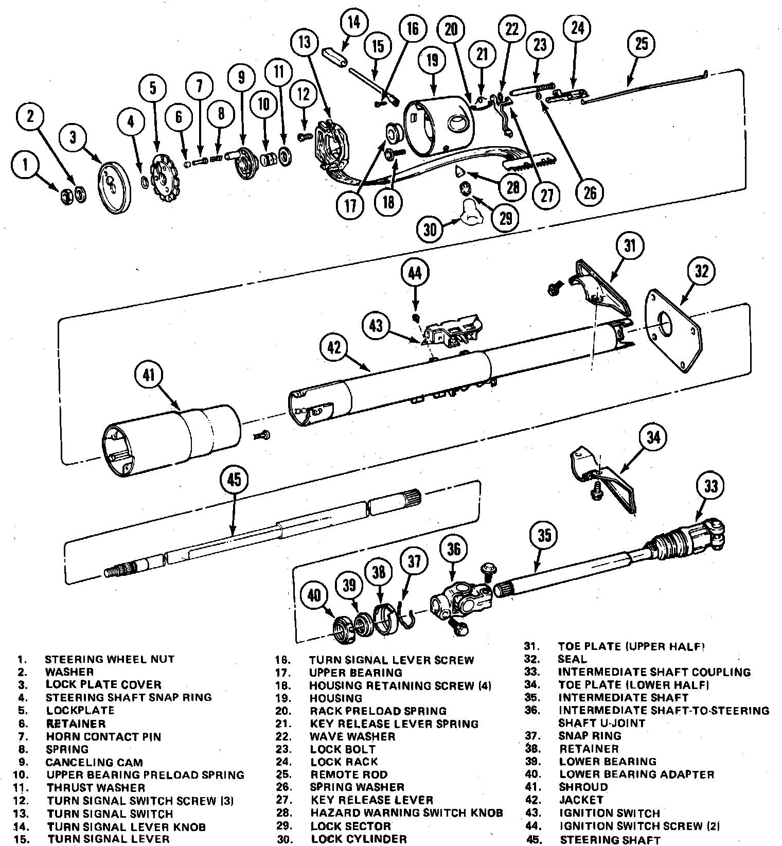 Fig. 1 Non-tilt steering column & components. Manual transmission: