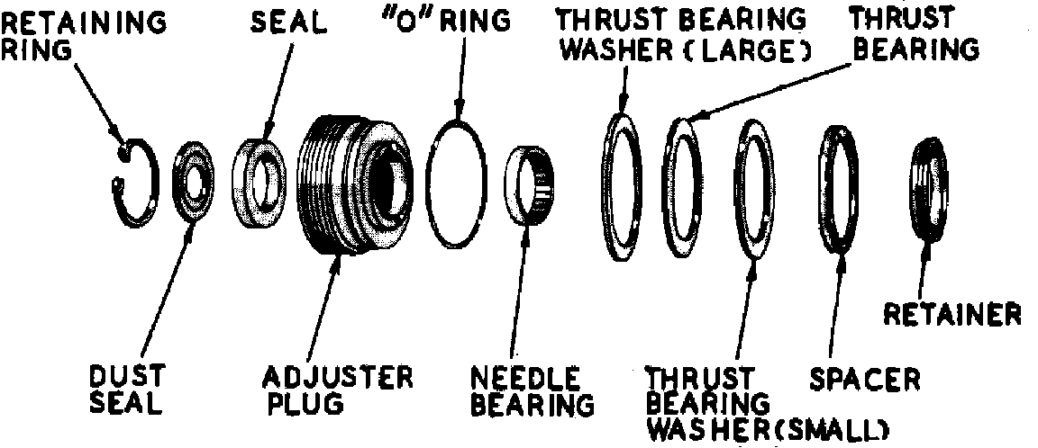 5. Assemble large thrust bearing race, thrust bearing, small race and spacer (with grooves up) on adjuster plug and secure with retainer.