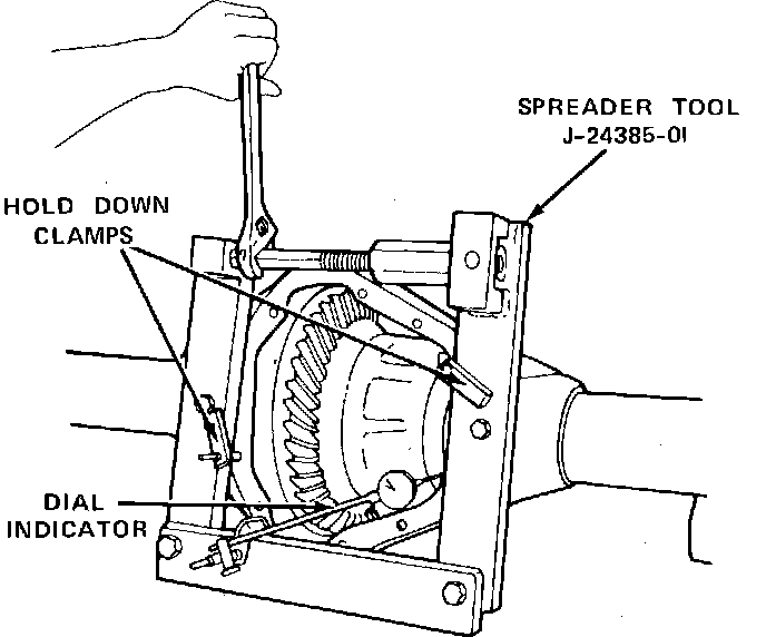 8. Install axle housing spreader tool J-24385-01, or equivalent. Be sure to install hold down clamps to keep spreader tool in position.